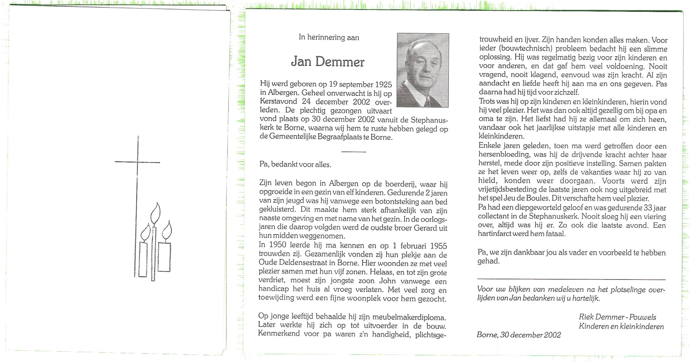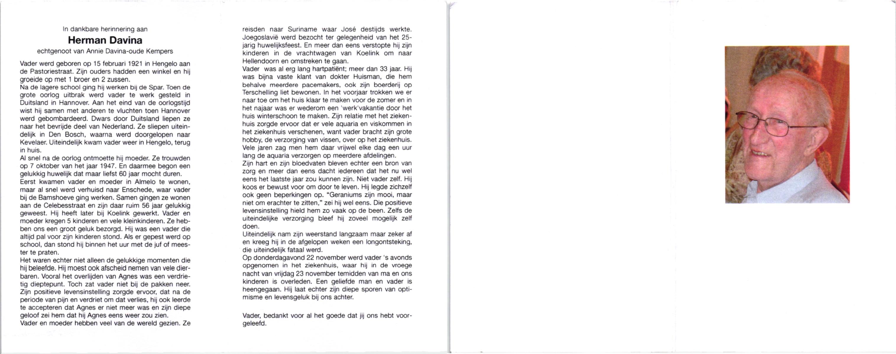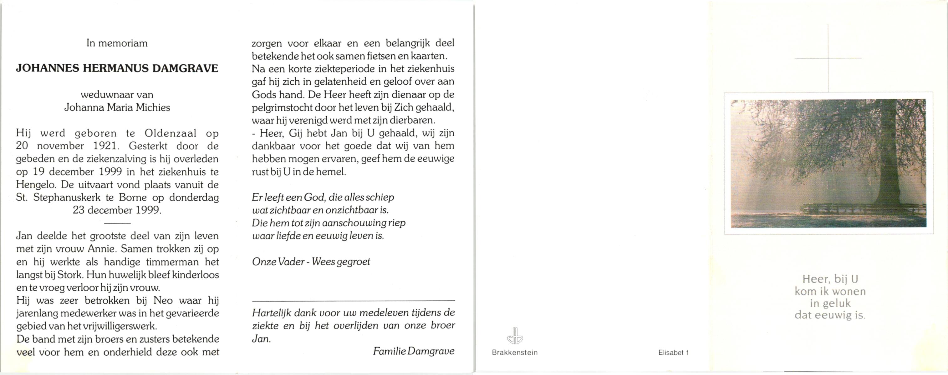 DAMGRAVE, , Johannes Hermanus, geboren op 20-11-1921 te Oldenzaal, overleden op 19-12-1999 te Hengelo (O) op 78-jarige leeftijd, begraven op 23-12-1999 te Borne.