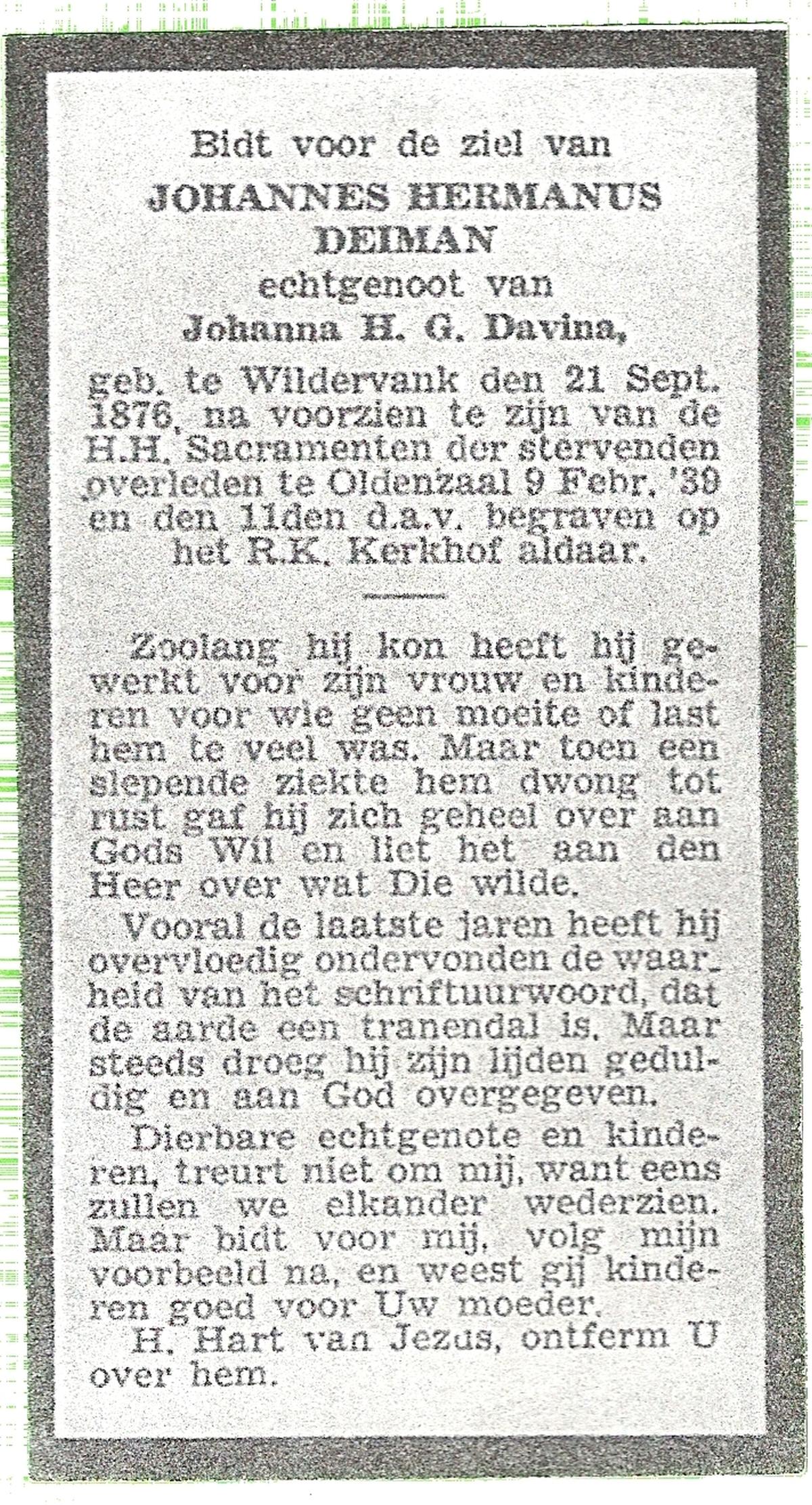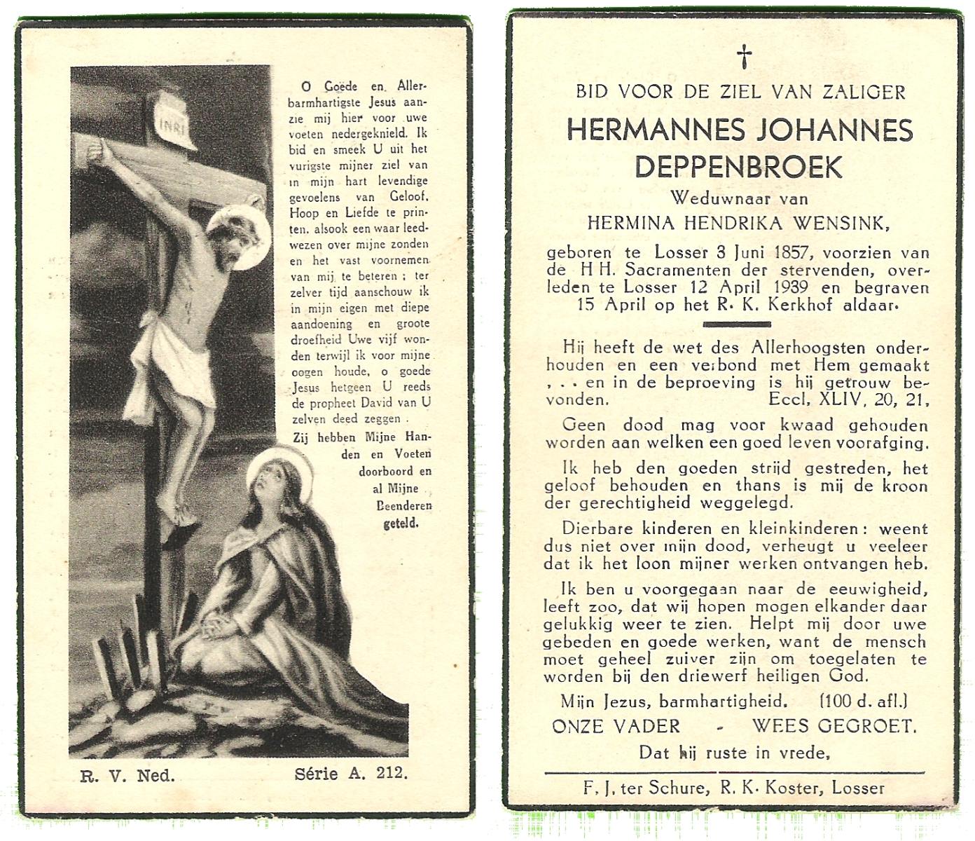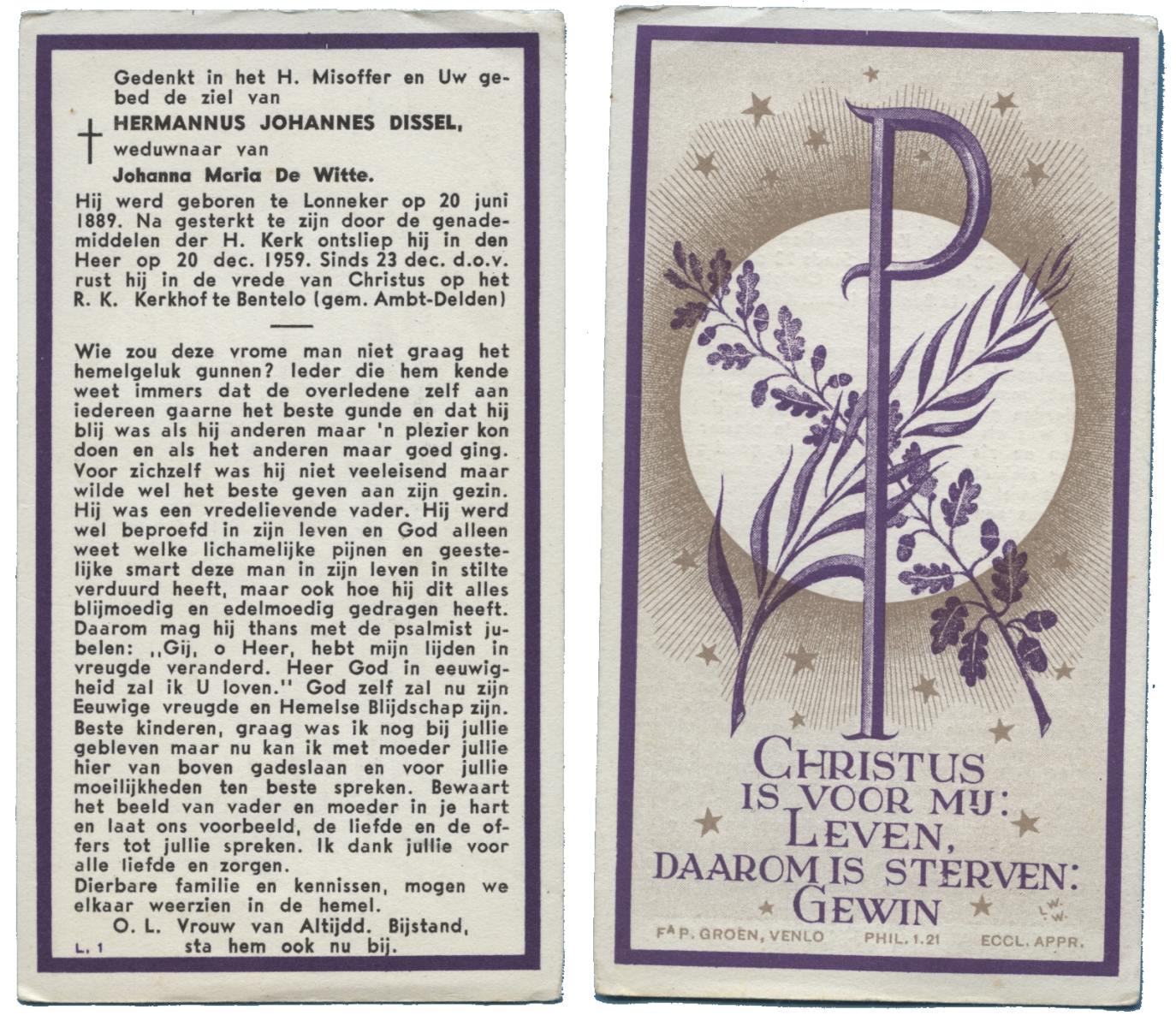 DISSEL, Hermannus Johannes, geboren op 20-06-1889 te Lonneker, overleden op 20-12-1959 te Delden op 70-jarige leeftijd, begraven op 23-12-1959 te Bentelo.