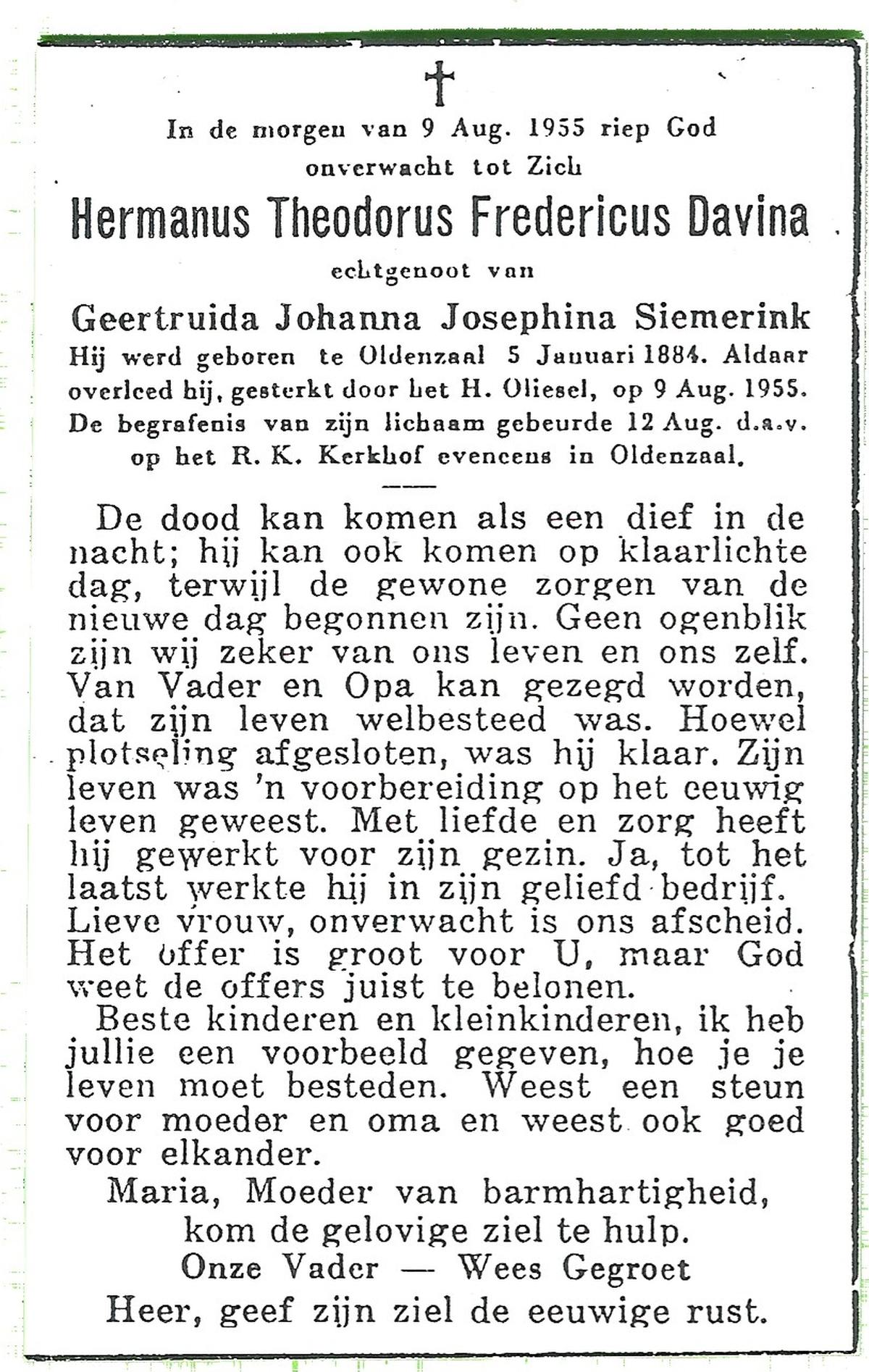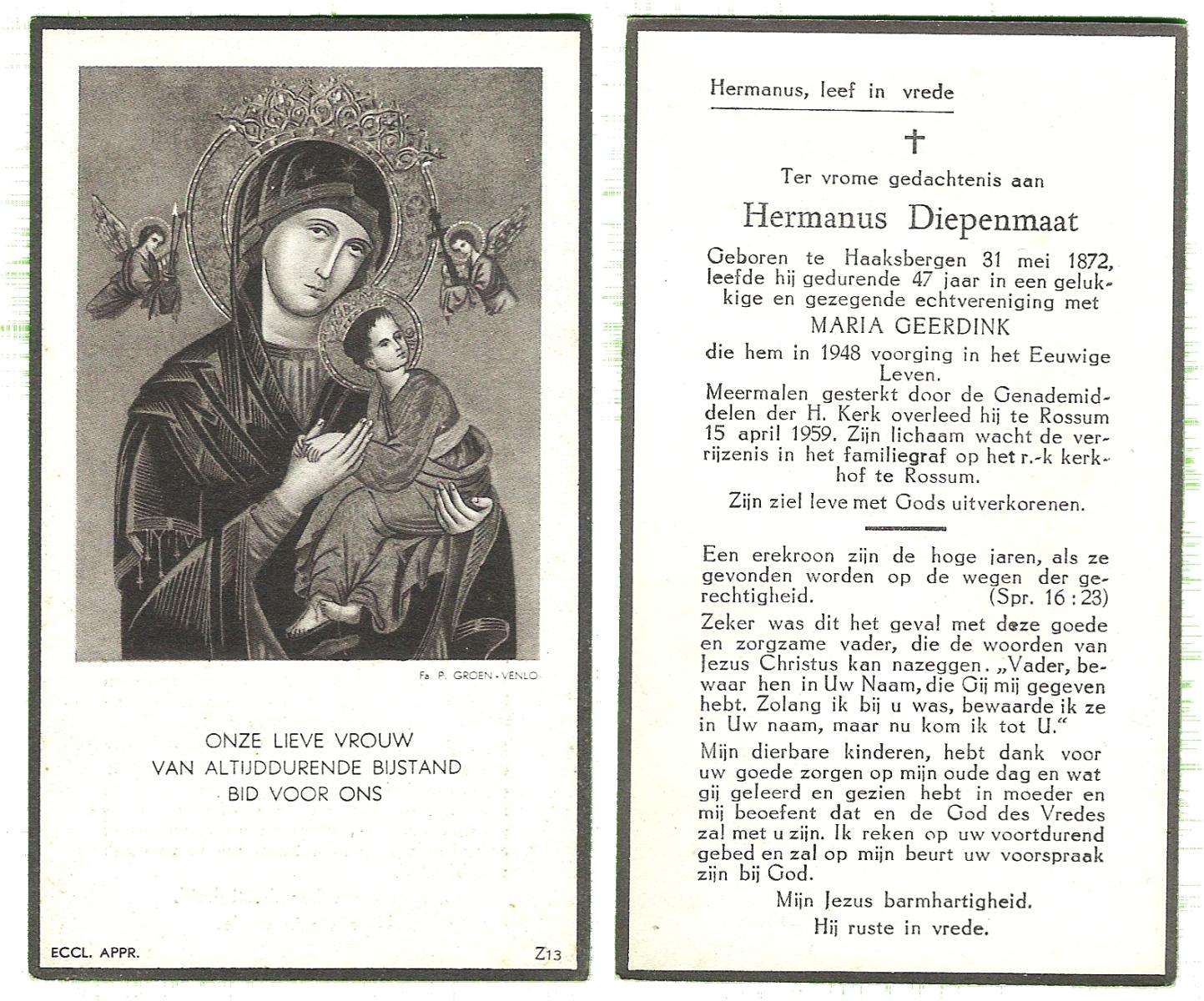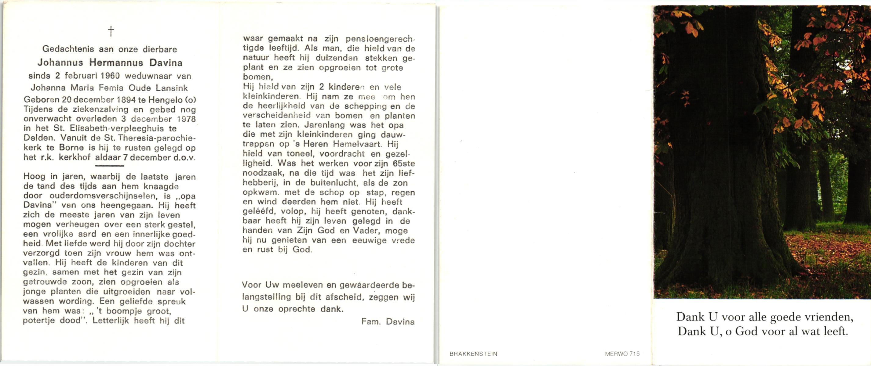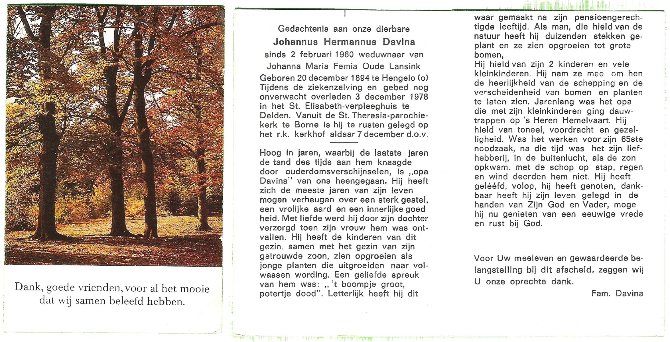 DISSEL, Hermannus Johannes, geboren op 20-06-1889 te Lonneker, overleden op 20-12-1959 te Delden op 70-jarige leeftijd, begraven op 23-12-1959 te Bentelo.