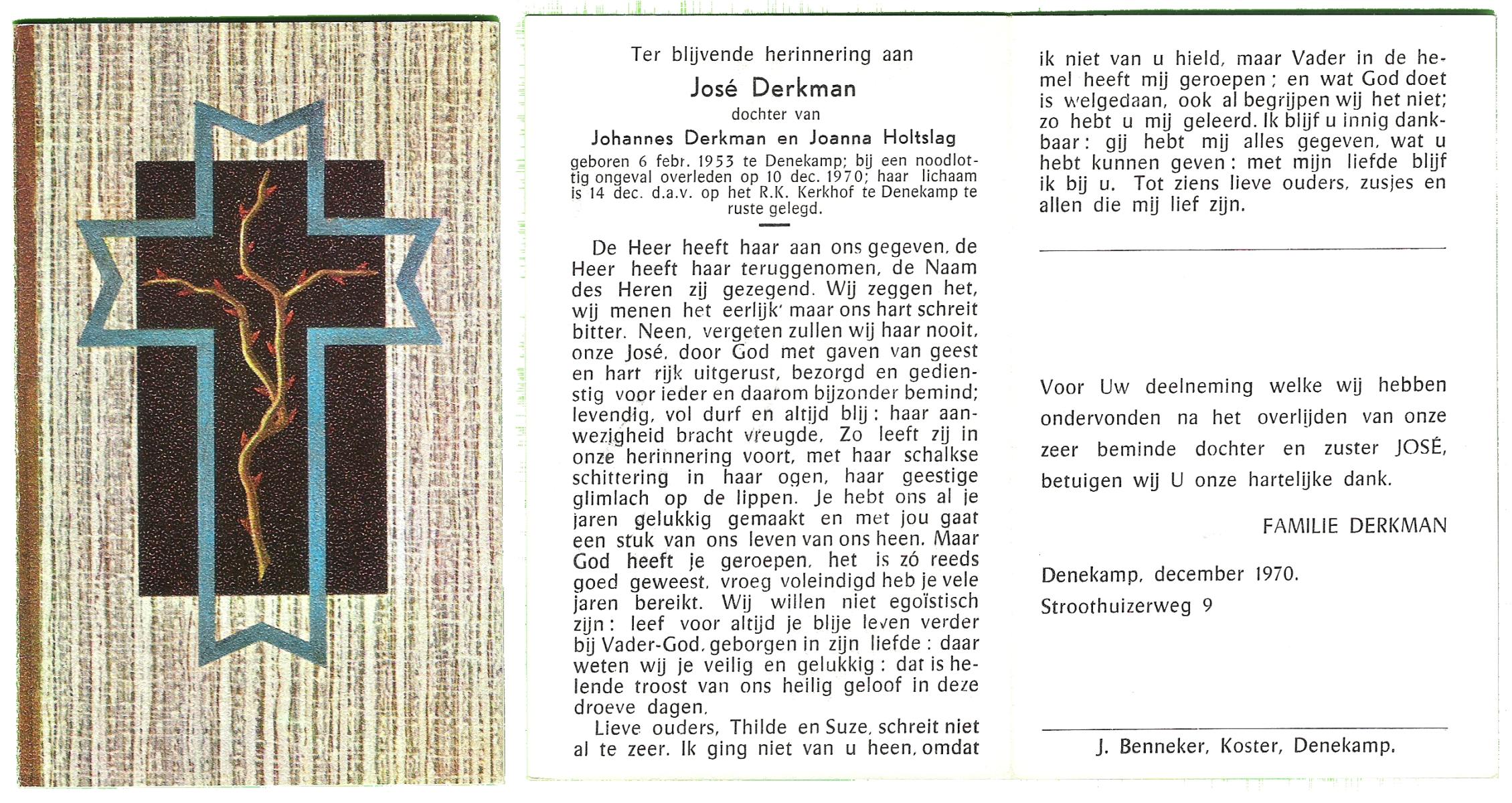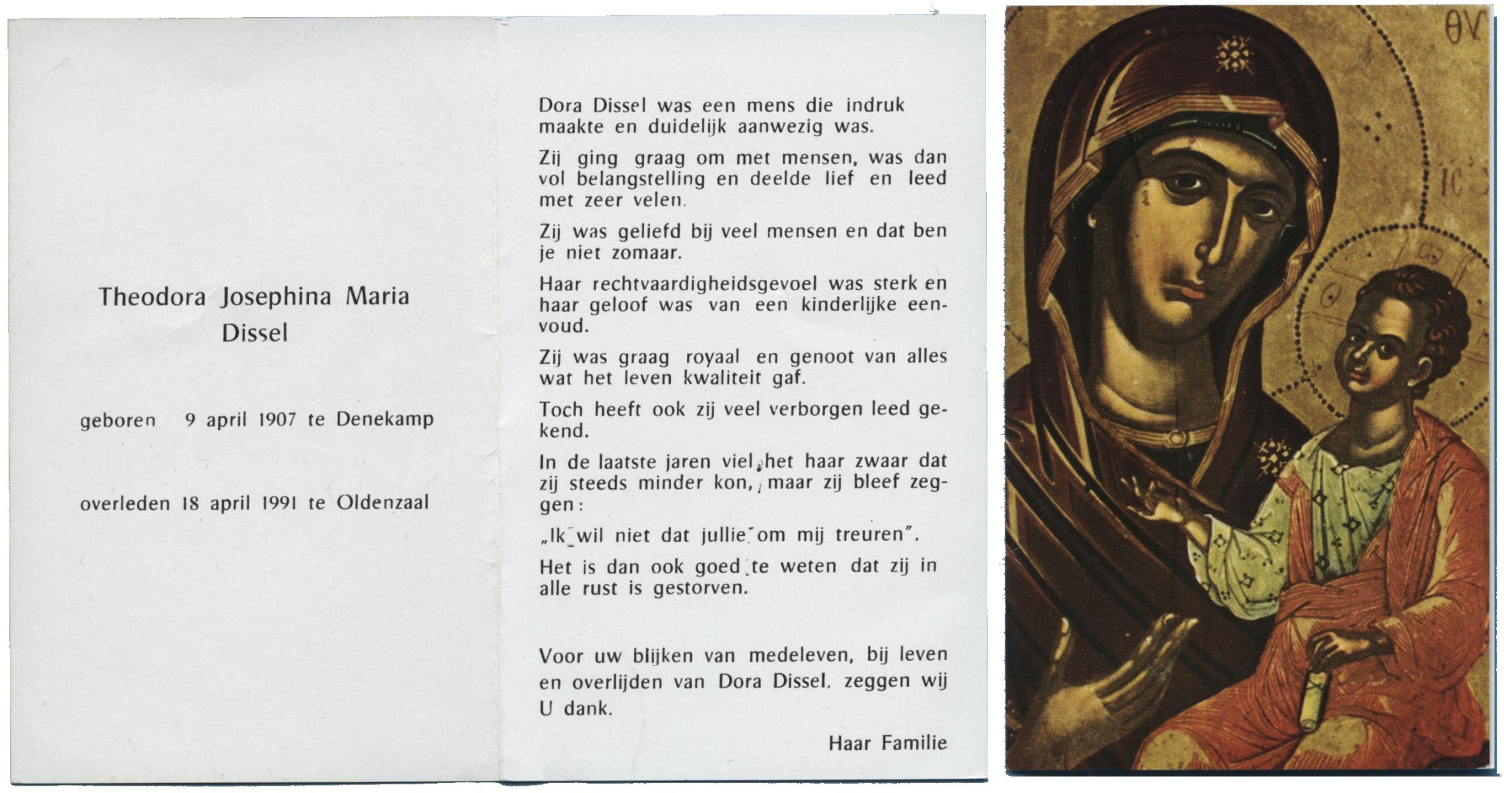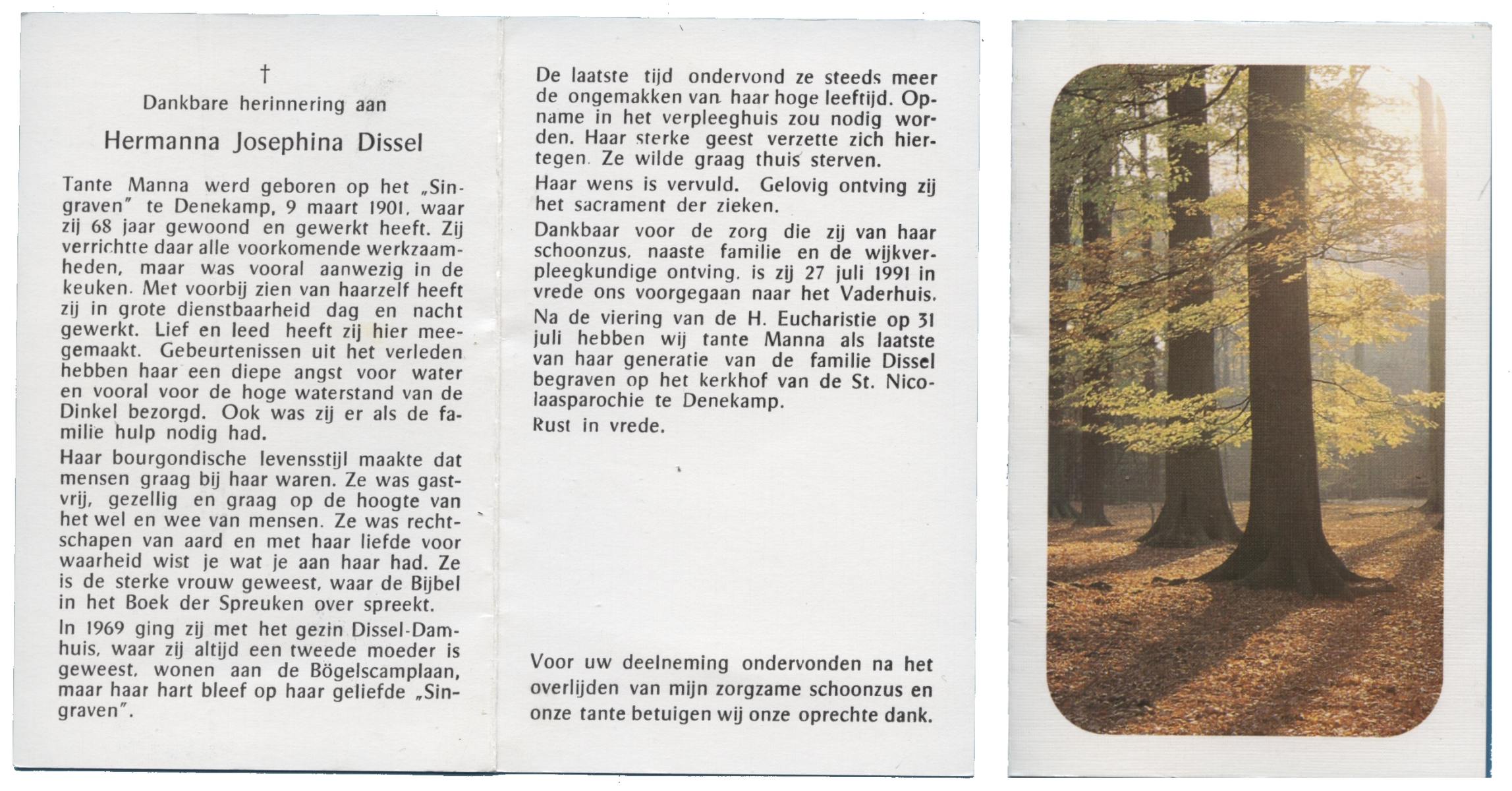 DISSEL, Hermanna Josephina, geboren op 9-3-1901 te Denekamp, overleden op 27-7-1991 op 90-jarige leeftijd, begraven op 31-7-1991 te Denekamp.