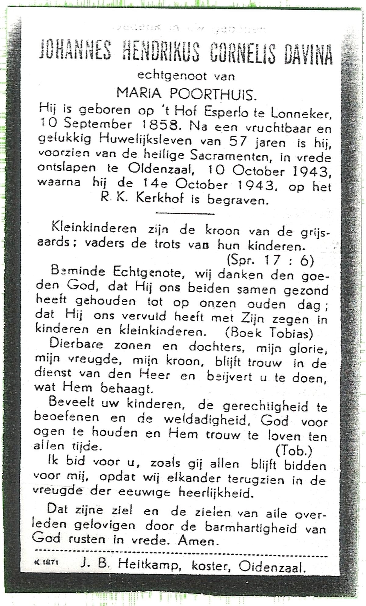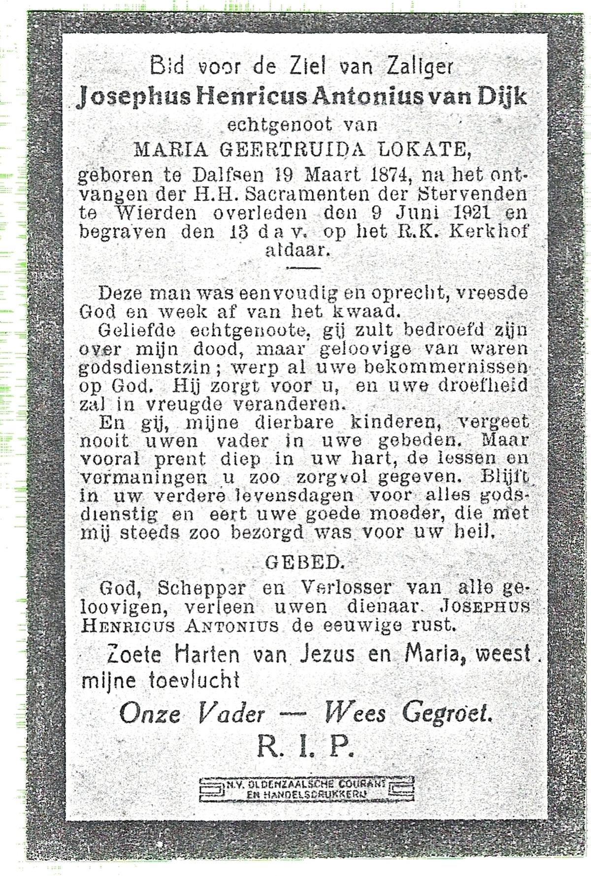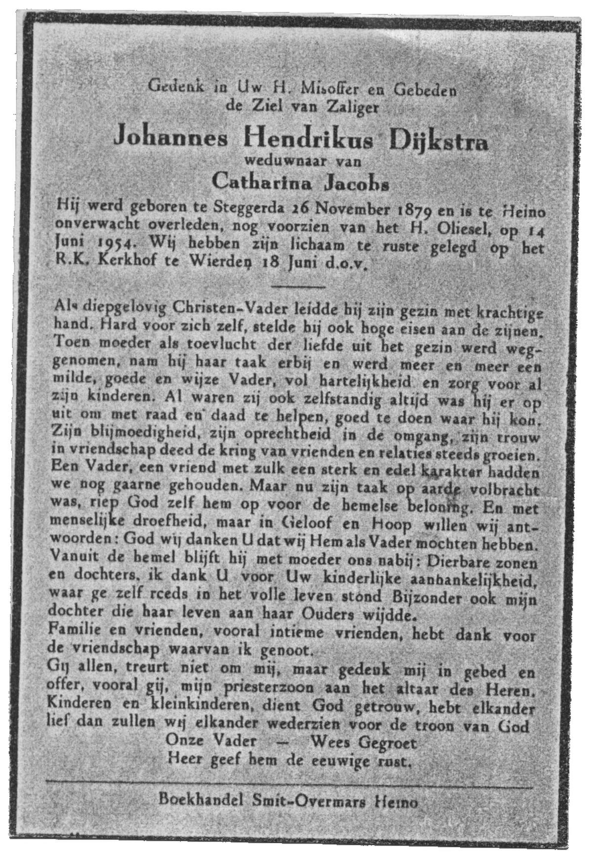 DIJKSTRA, Johannes Hendrikus, geboren op 16-11-1879 te Steggerda, overleden op 14-6-1954 te Heino op 74-jarige leeftijd, begraven op 18-6-1954 te Wierden.