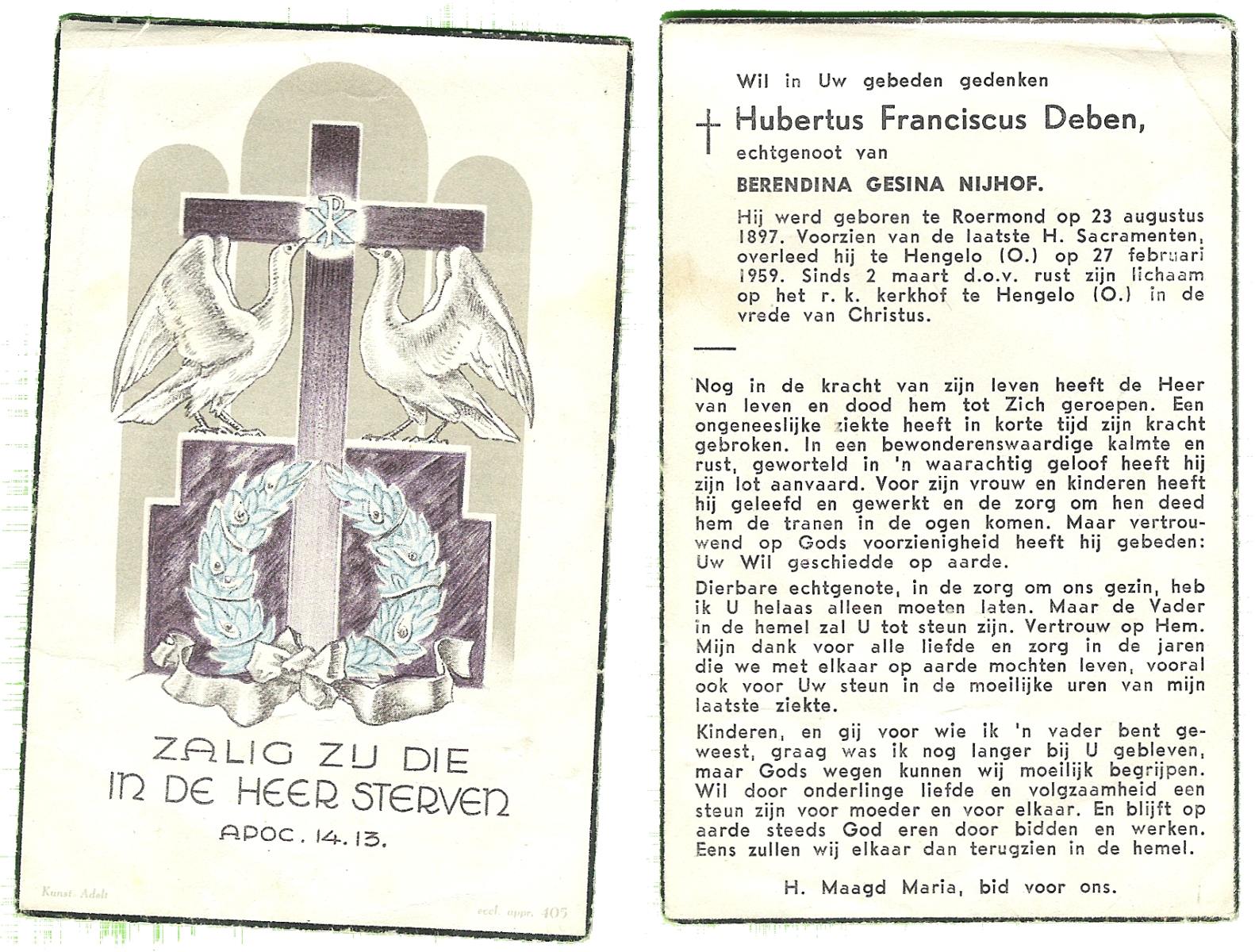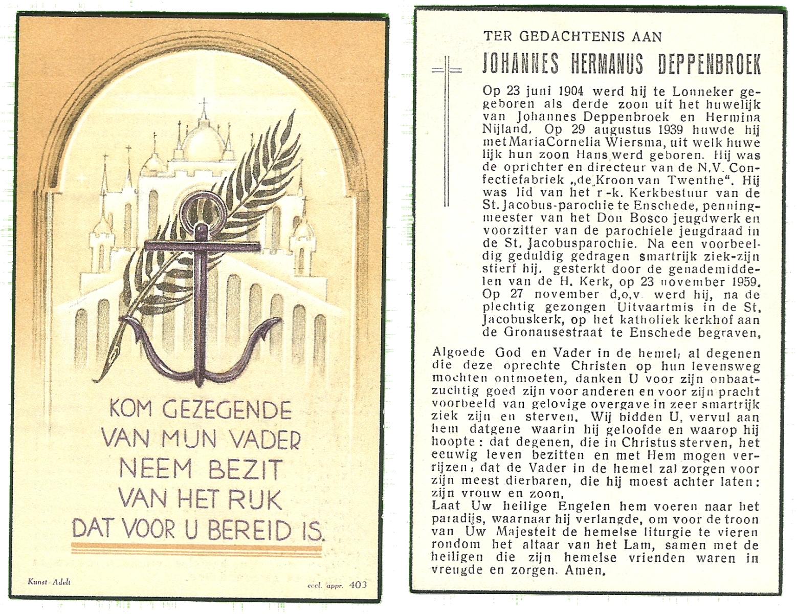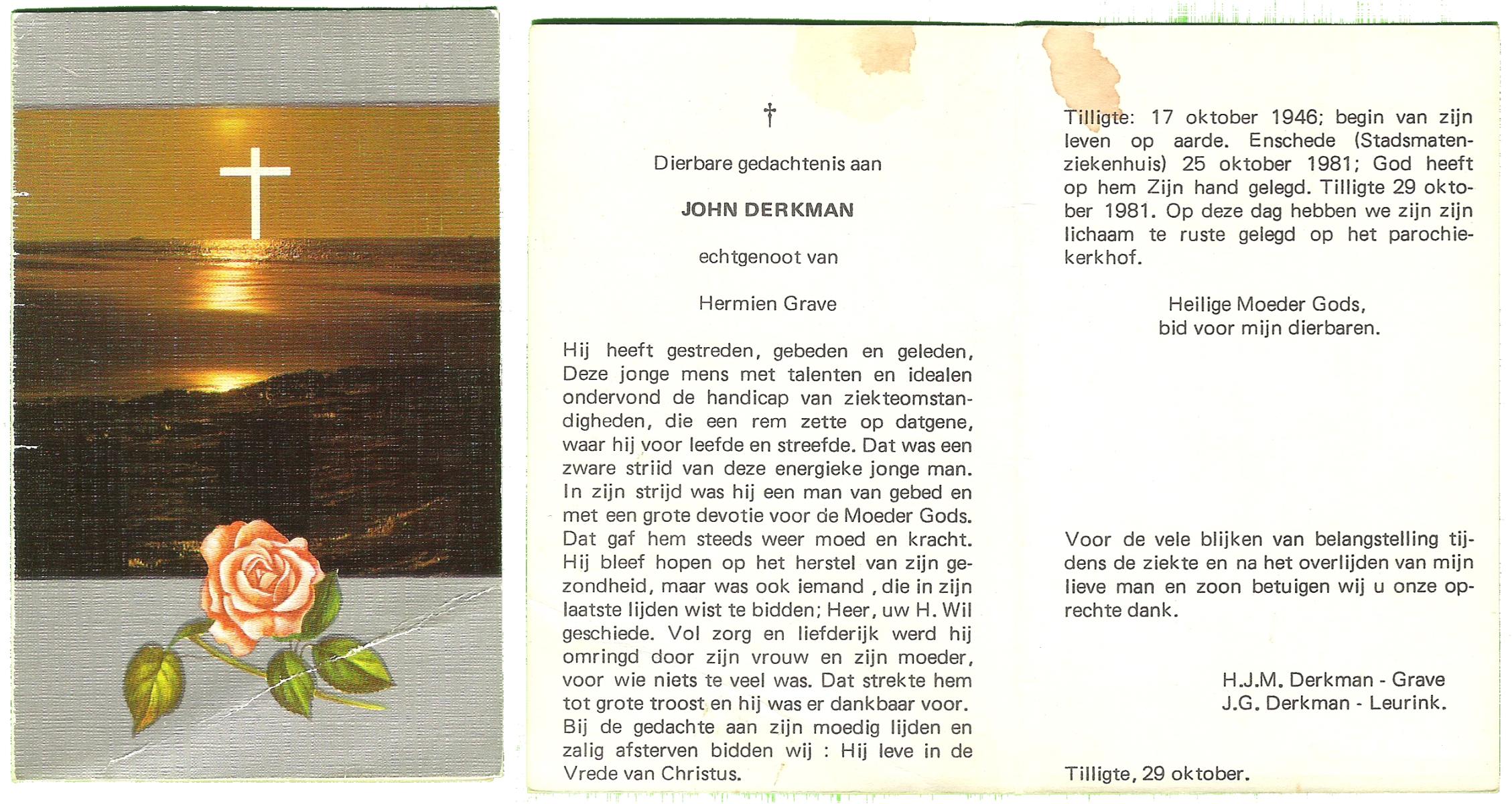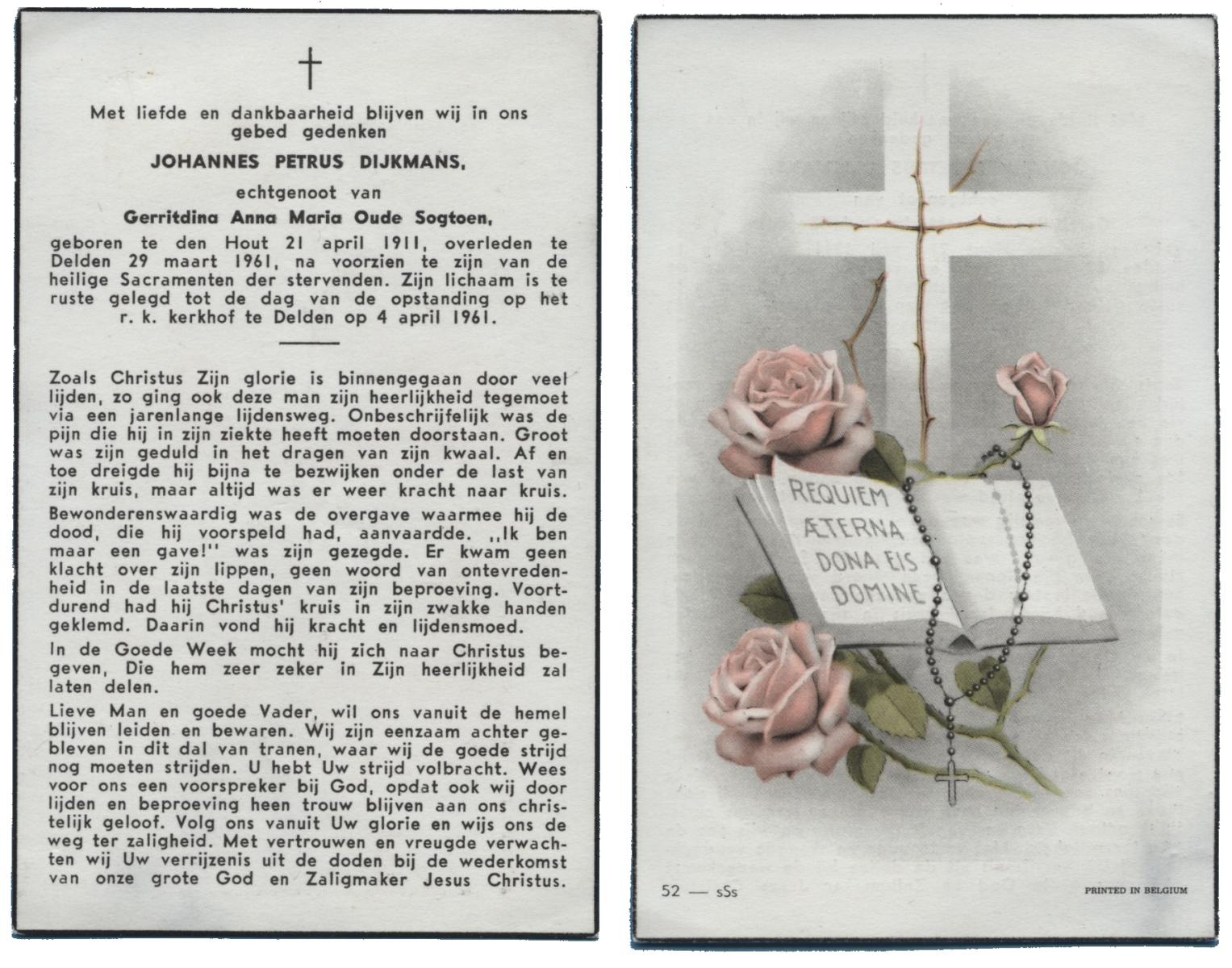 DIJKMANS, Johannes Petrus, geboren op 21-4-1911 te den Hout, overleden op 29-3-1961 te Delden op 59-jarige leeftijd, begraven op 4-4-1961 te Delden.