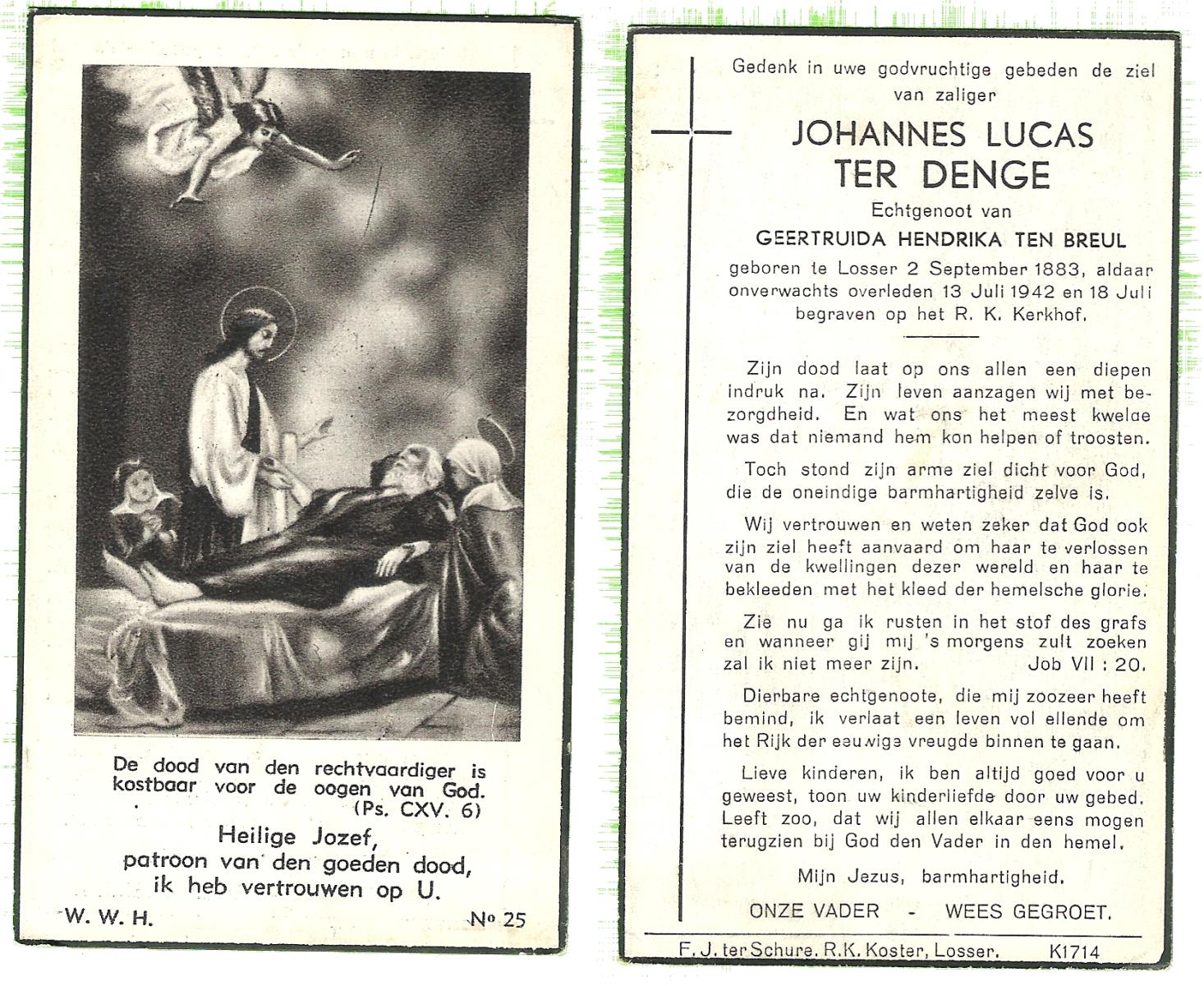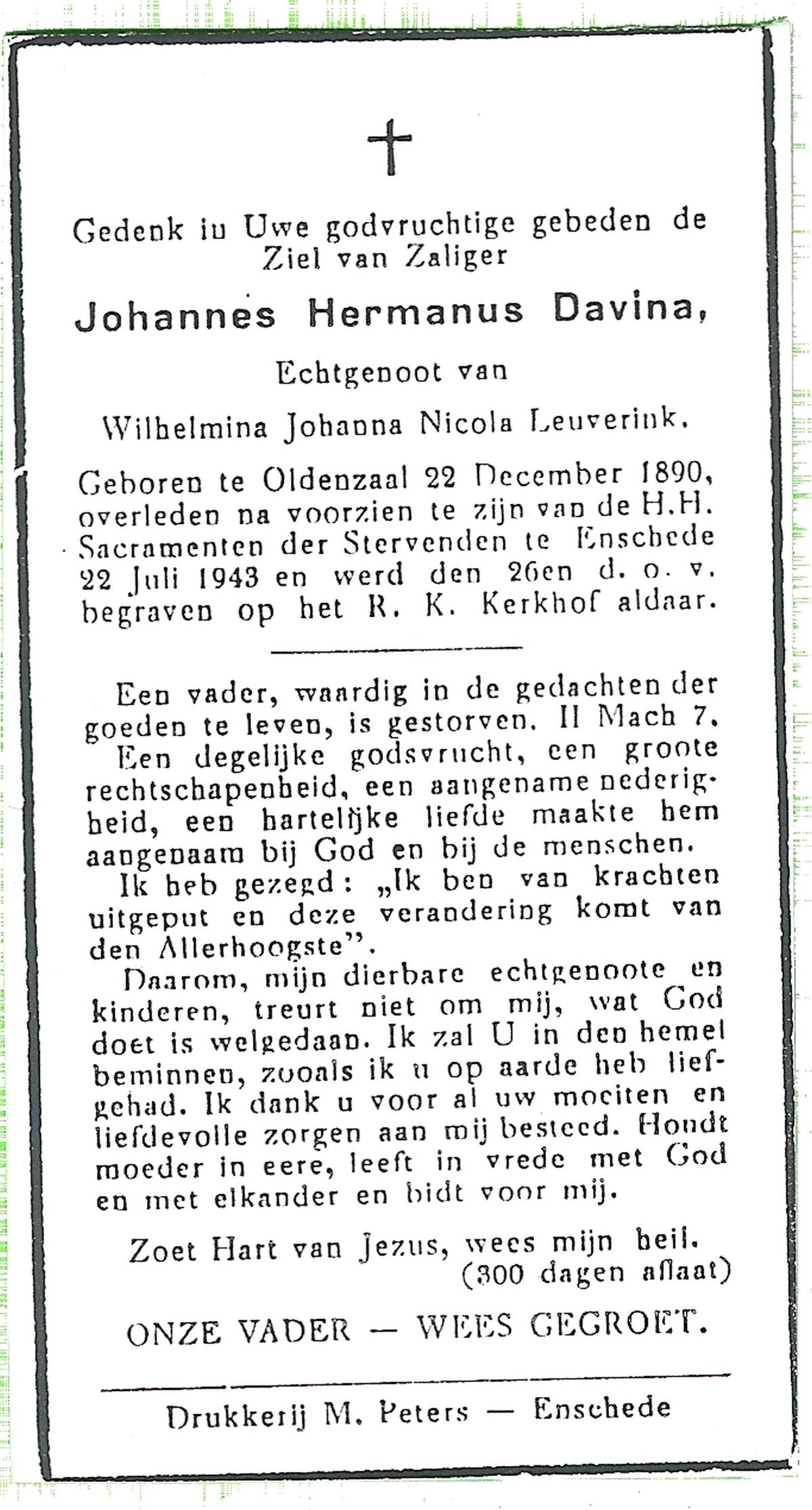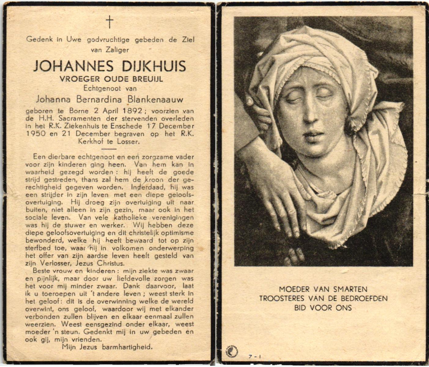 DIJKHUIS VROEGER OUDE BREUIJL, Johannes, geboren op 02-04-1892 te Borne, overleden op 17-12-1950 te Enschede op 58-jarige leeftijd, begraven op 21-12-1950 te Losser.