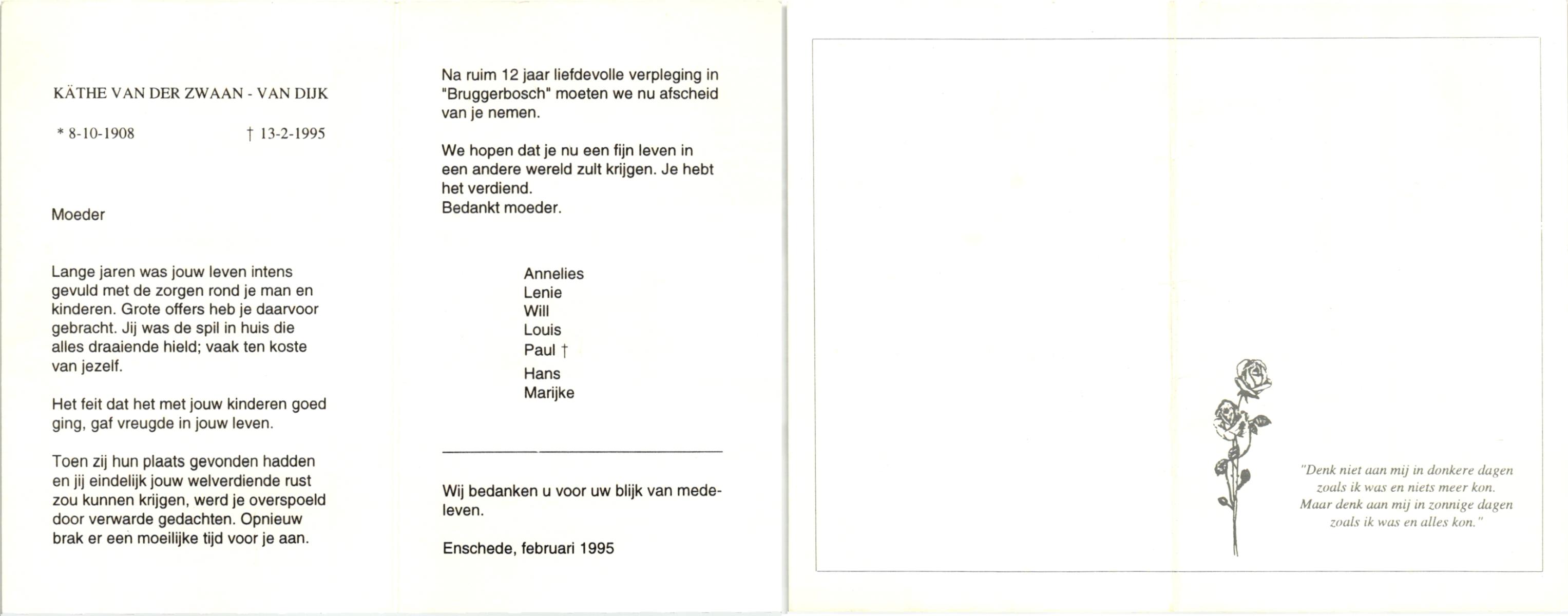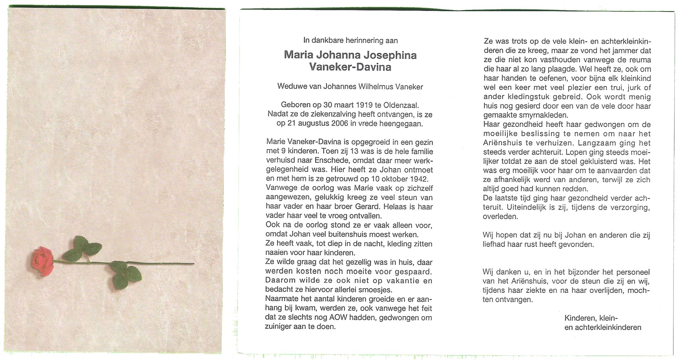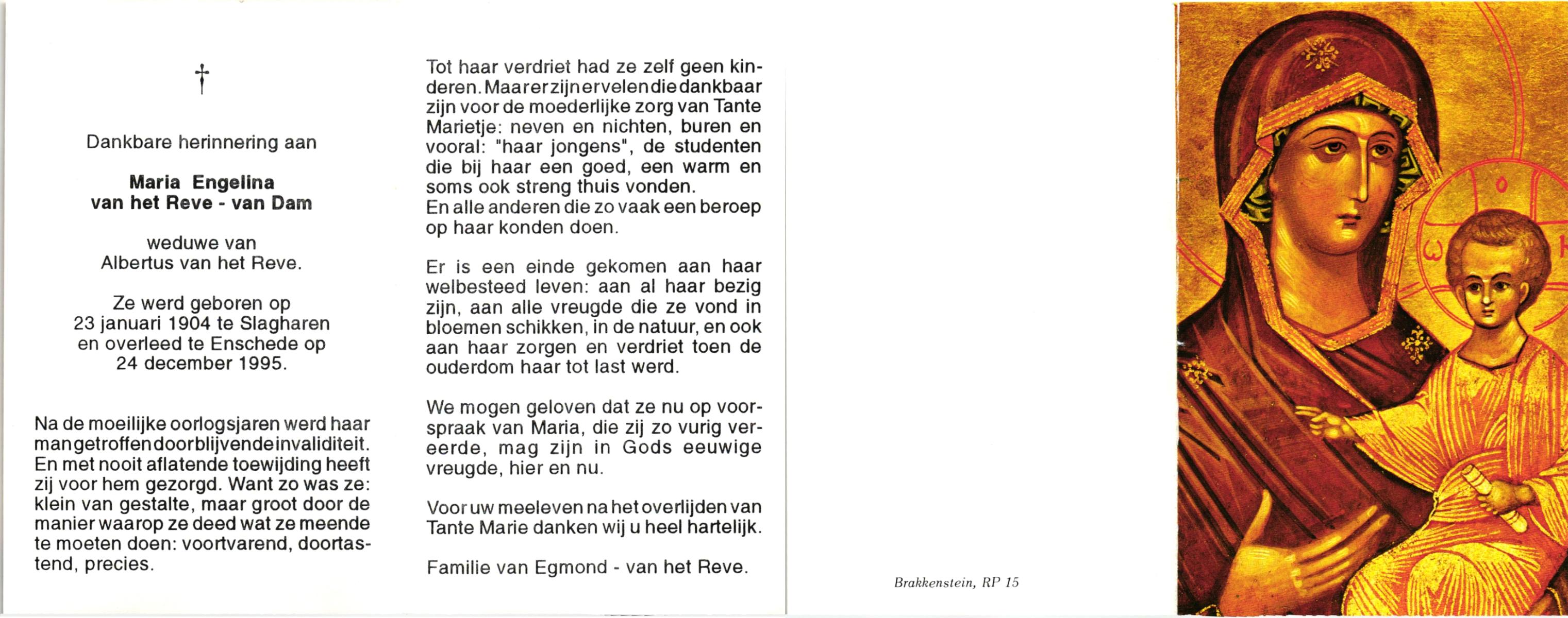 DAM, van, Maria Engelina, geboren op 23-1-1904 te Slagharen, overleden op 24-12-1995 te Enschede op 91-jarige leeftijd.