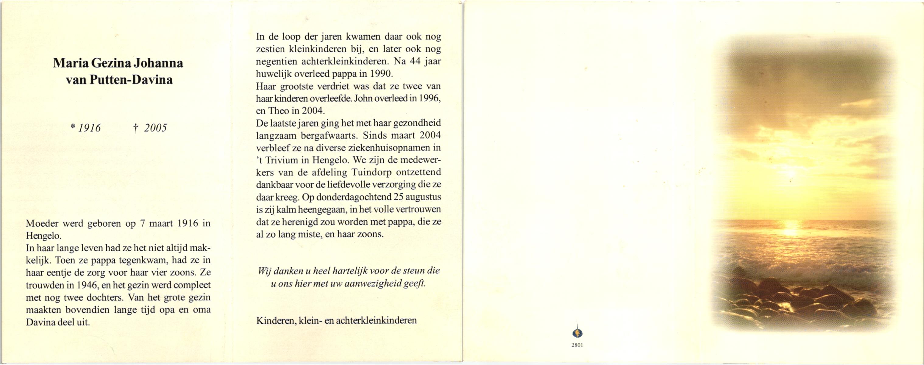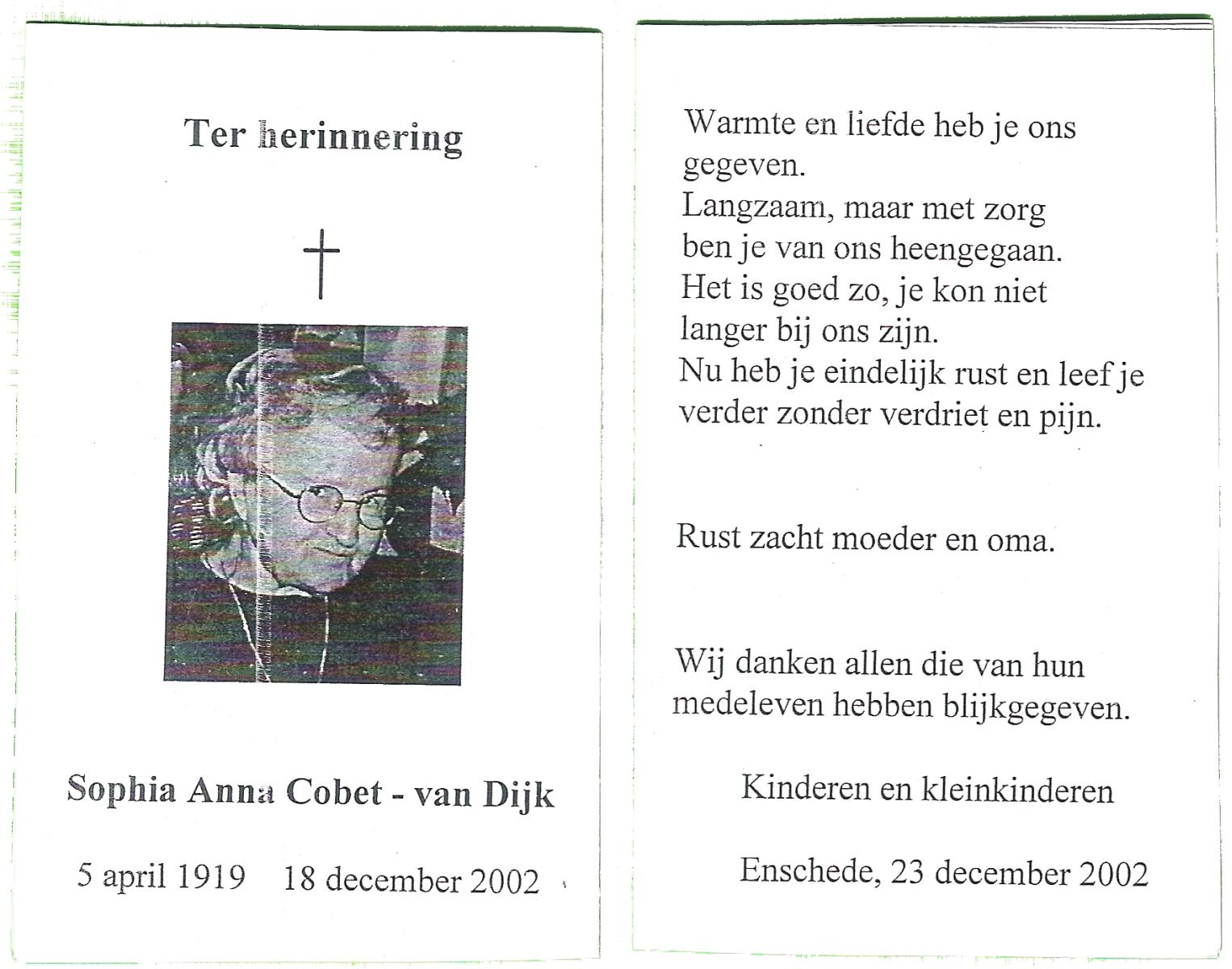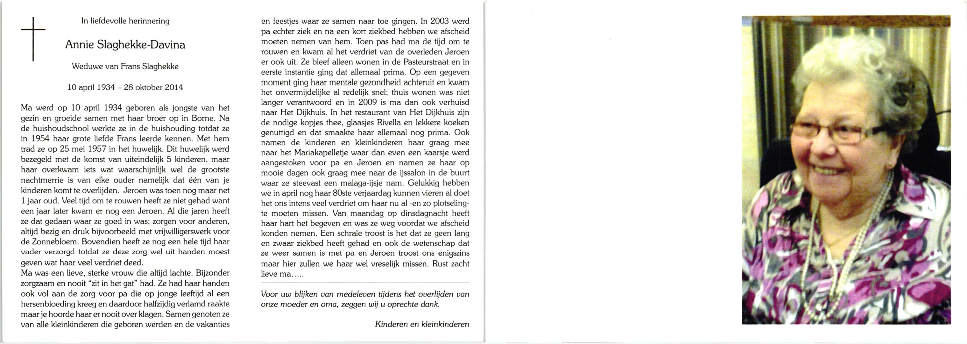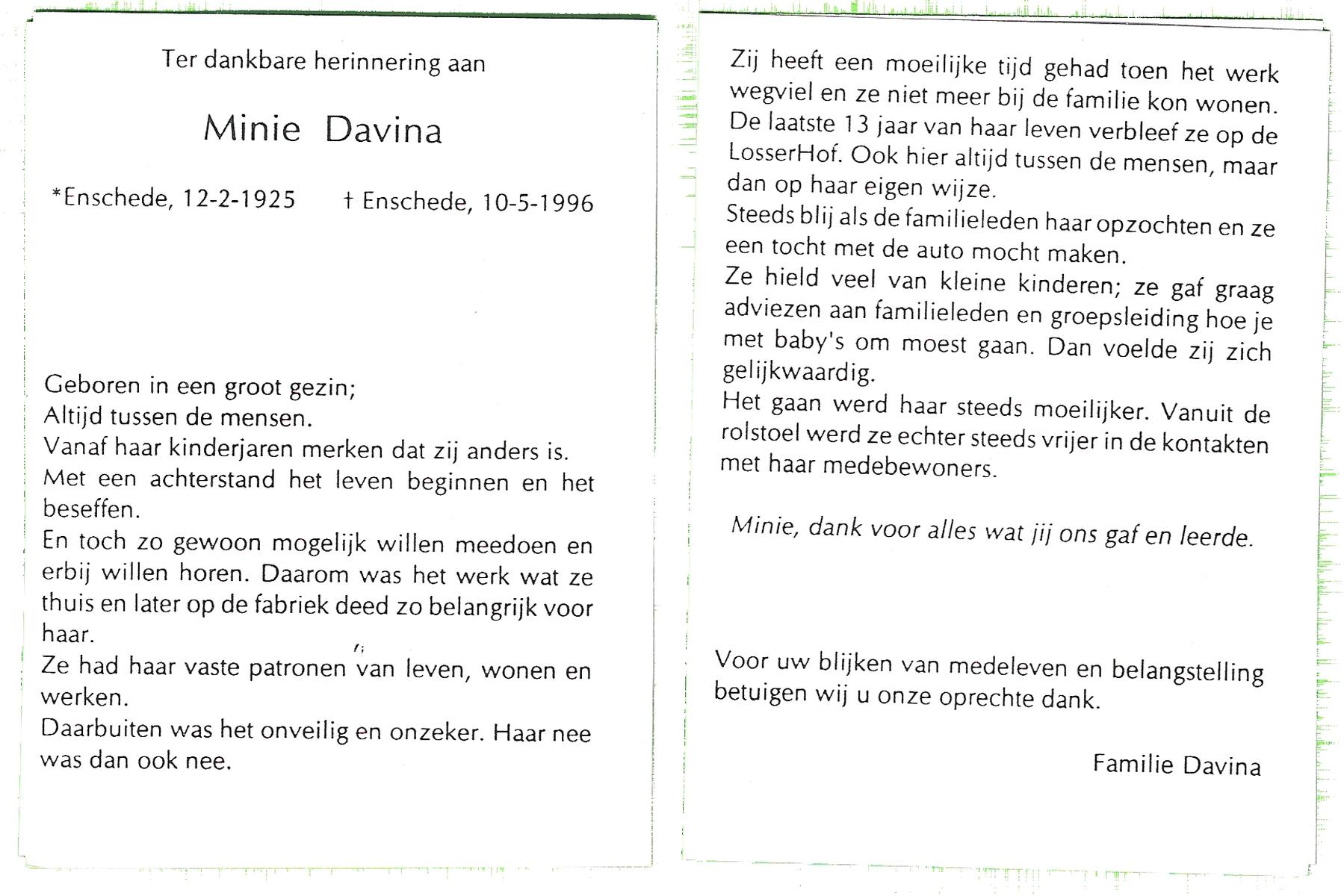 DAM, van, Maria Engelina, geboren op 23-1-1904 te Slagharen, overleden op 24-12-1995 te Enschede op 91-jarige leeftijd.