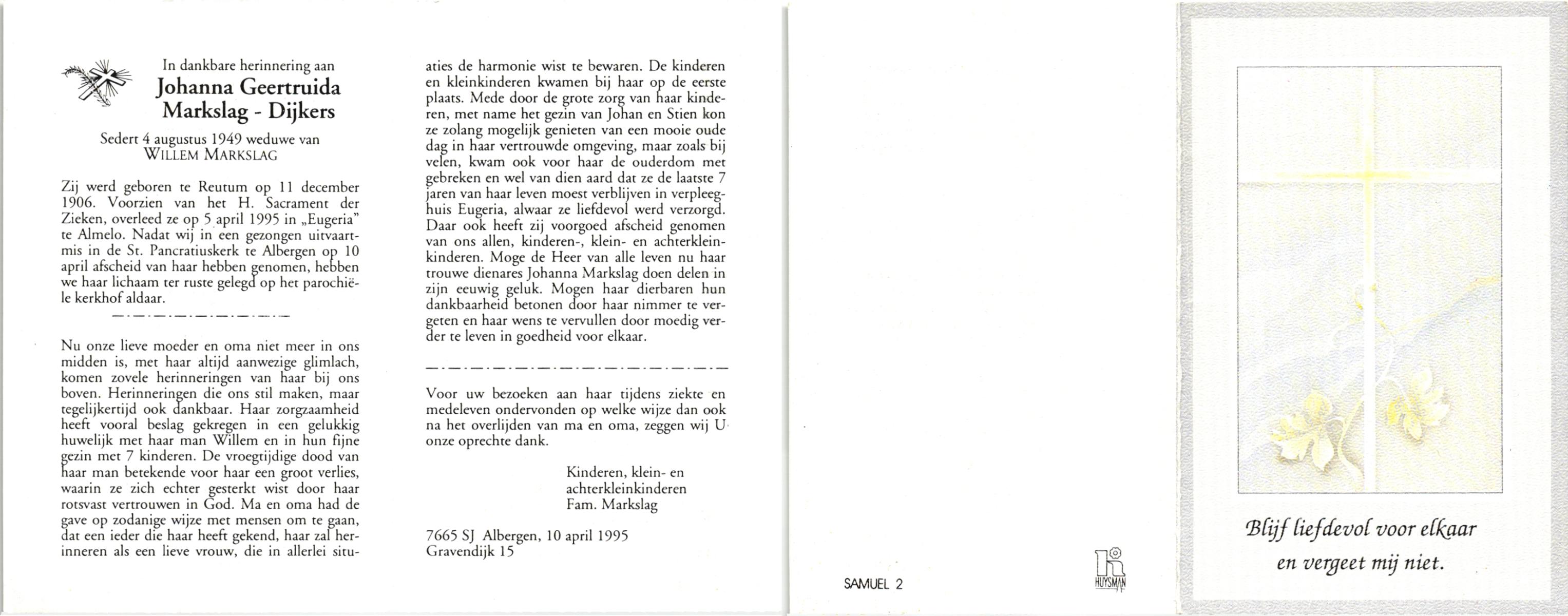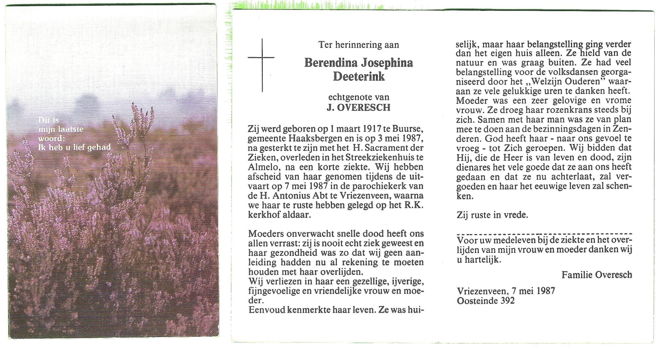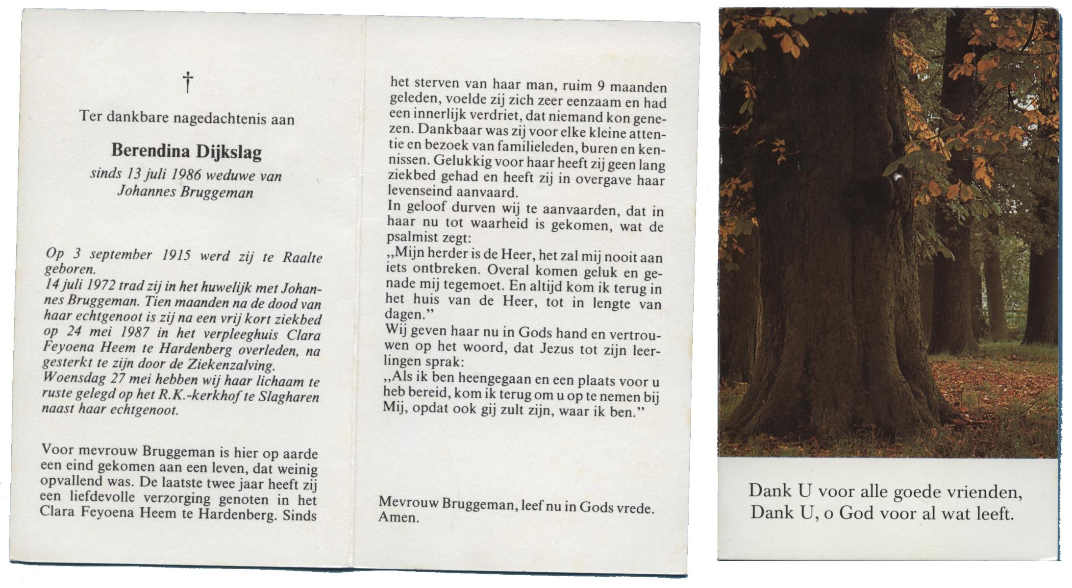 DIJKSLAG, Berendina, geboren op 3-9-1915 te Raalte, overleden op 24-5-1987 te Hardenberg op 71-jarige leeftijd, begraven op 27-5-1987 te Slagharen.