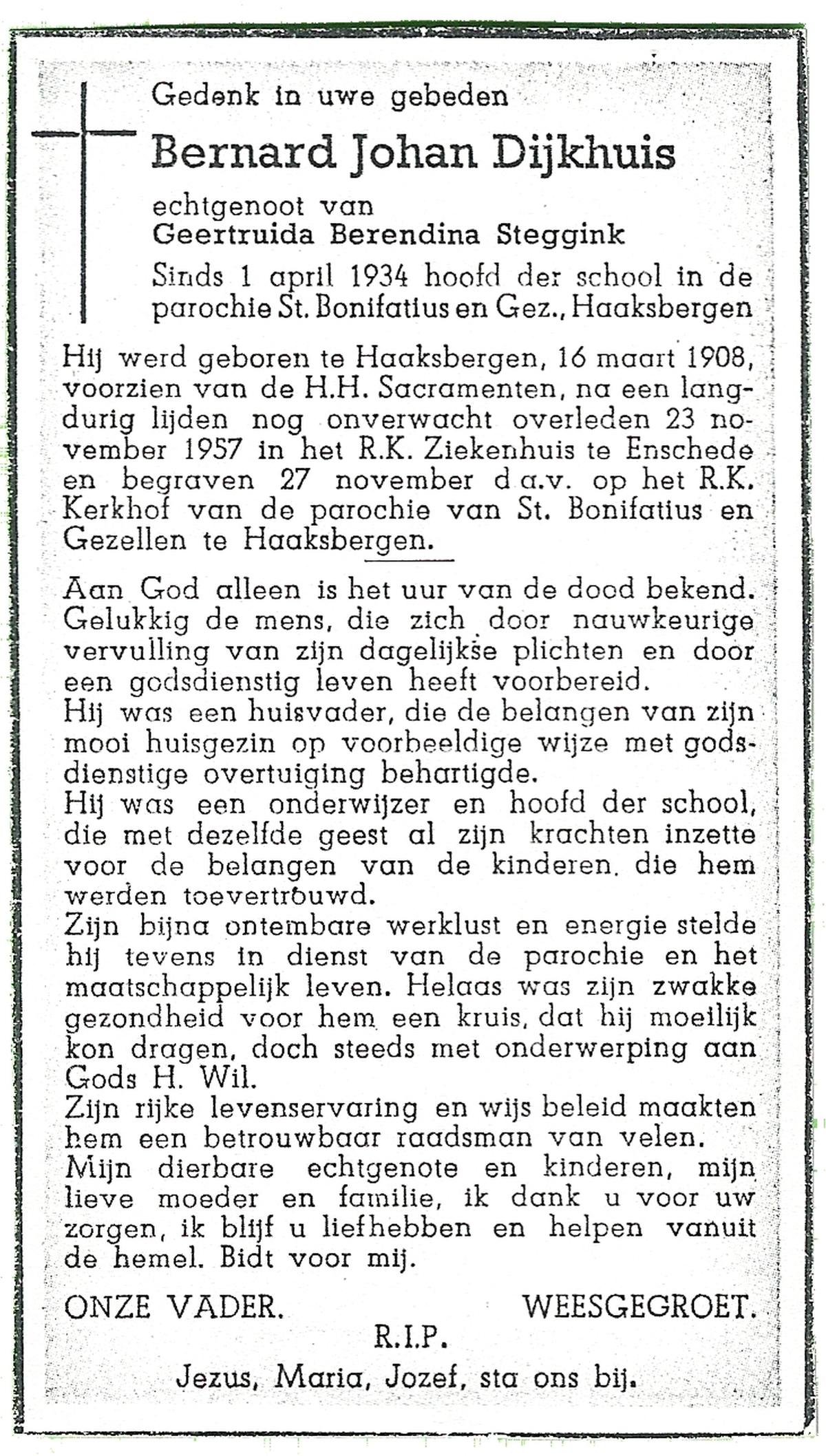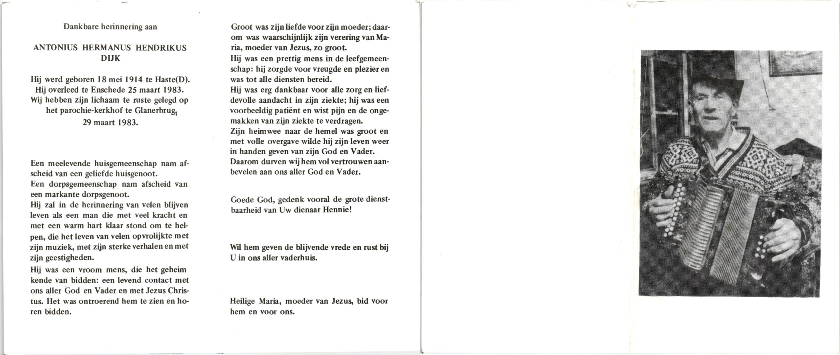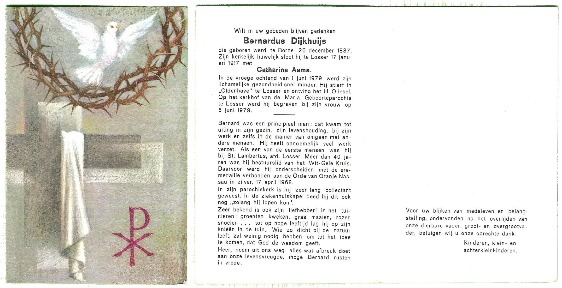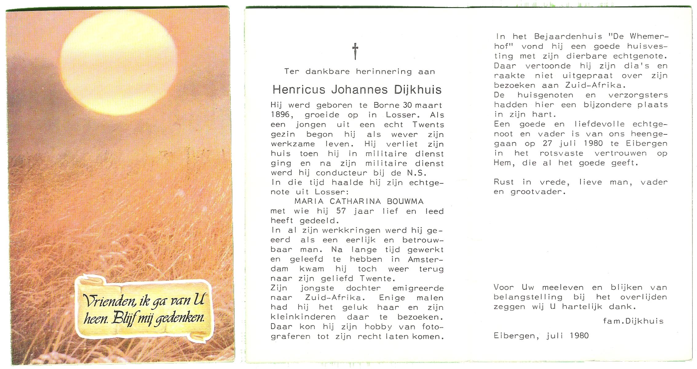 DIJKHUIS, Henricus Johannes, geboren op 30-03-1896 te Borne, overleden op 27-7-1980 te Eibergen op 84-jarige leeftijd.