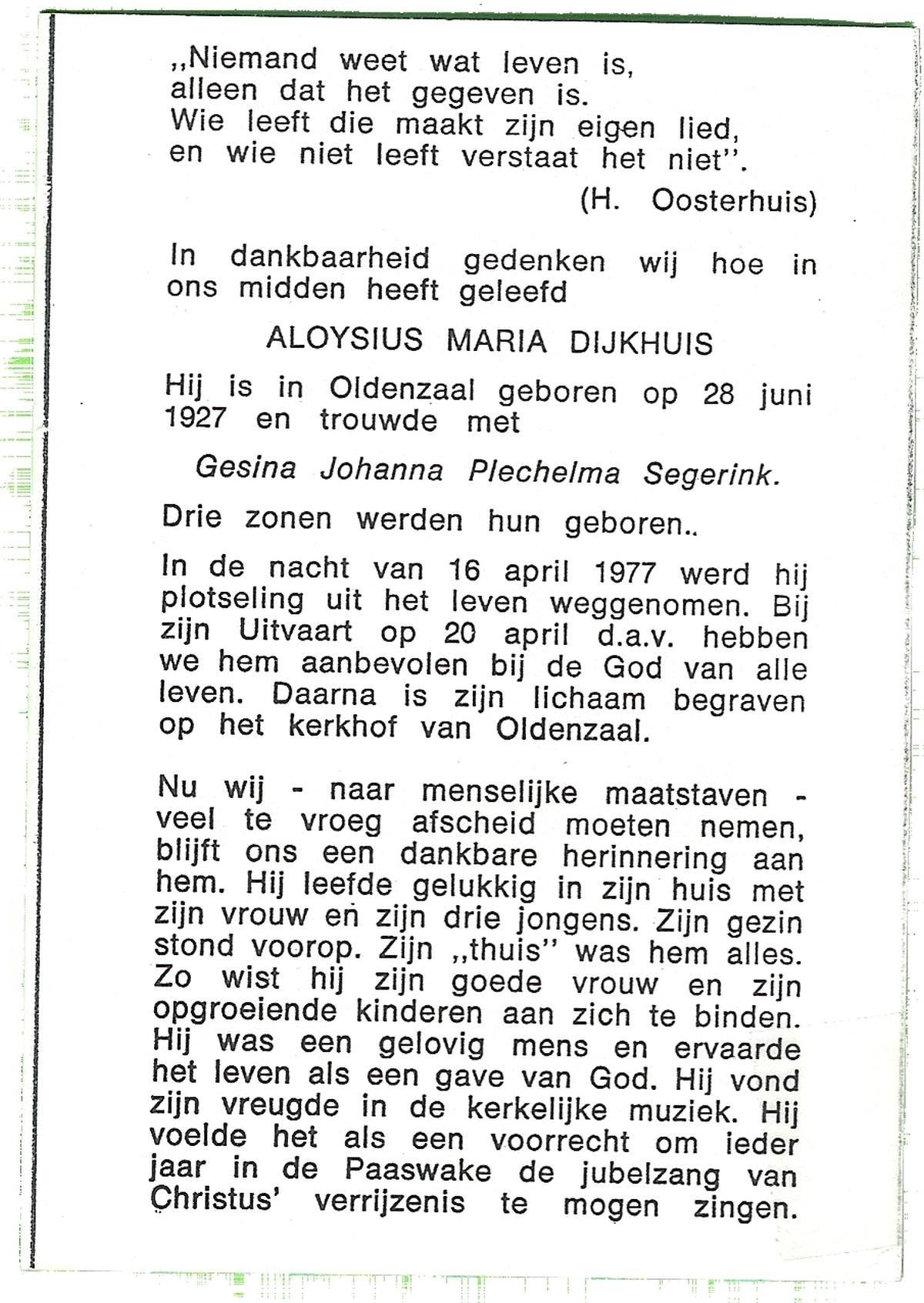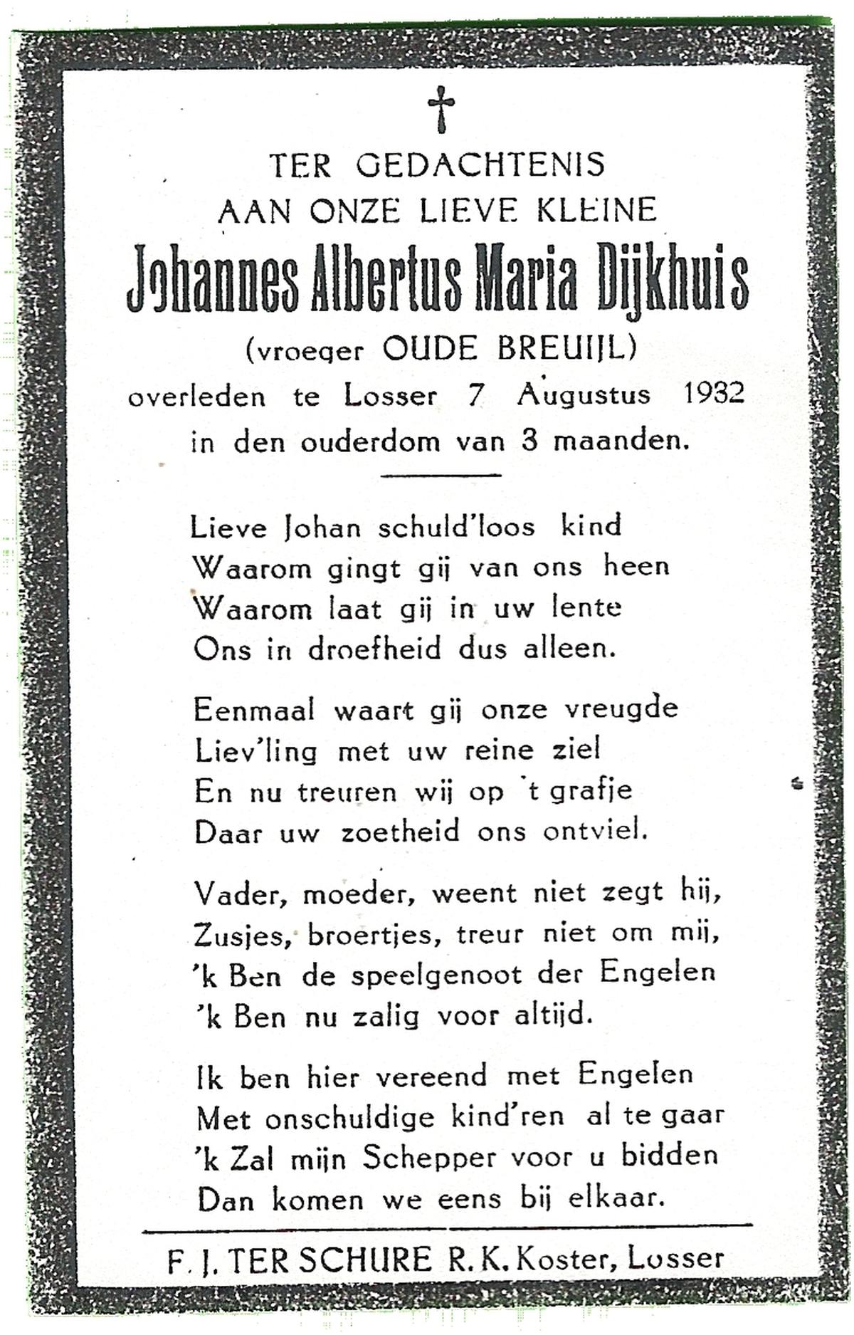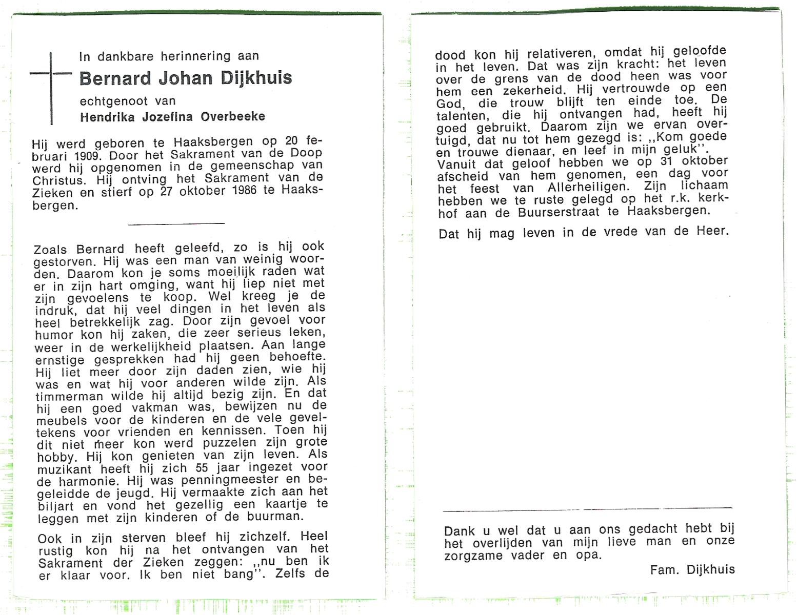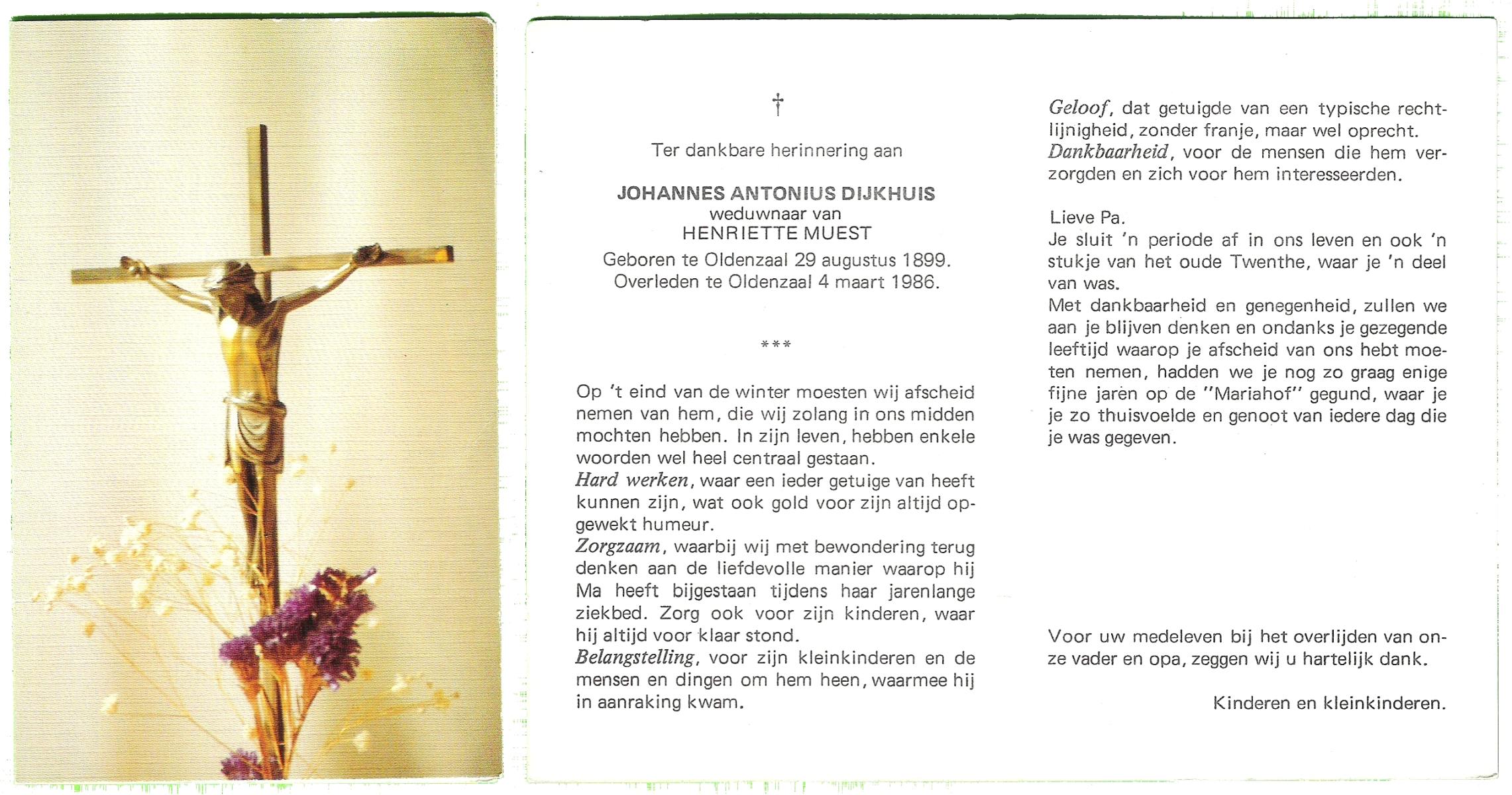 DIJKHUIS, Johannes Antonius, geboren op 29-08-1899 te Oldenzaal, overleden op 4-3-1986 te Oldenzaal op 86-jarige leeftijd.
