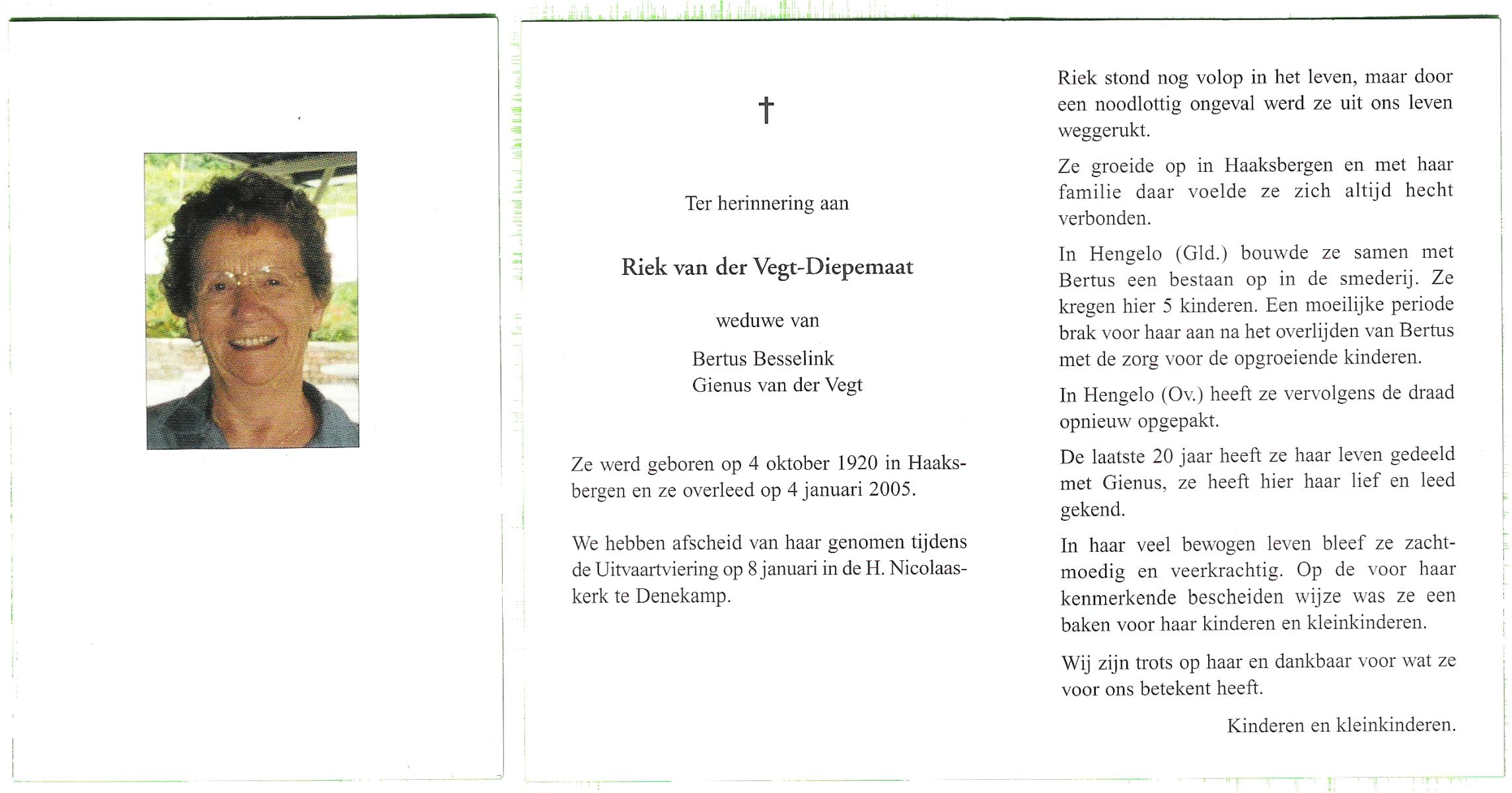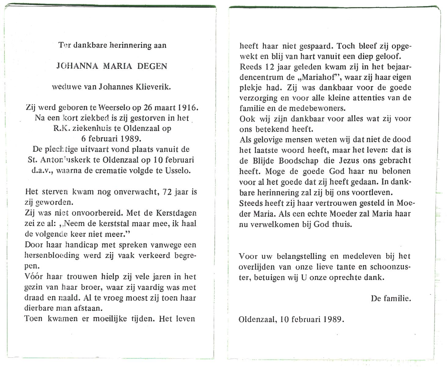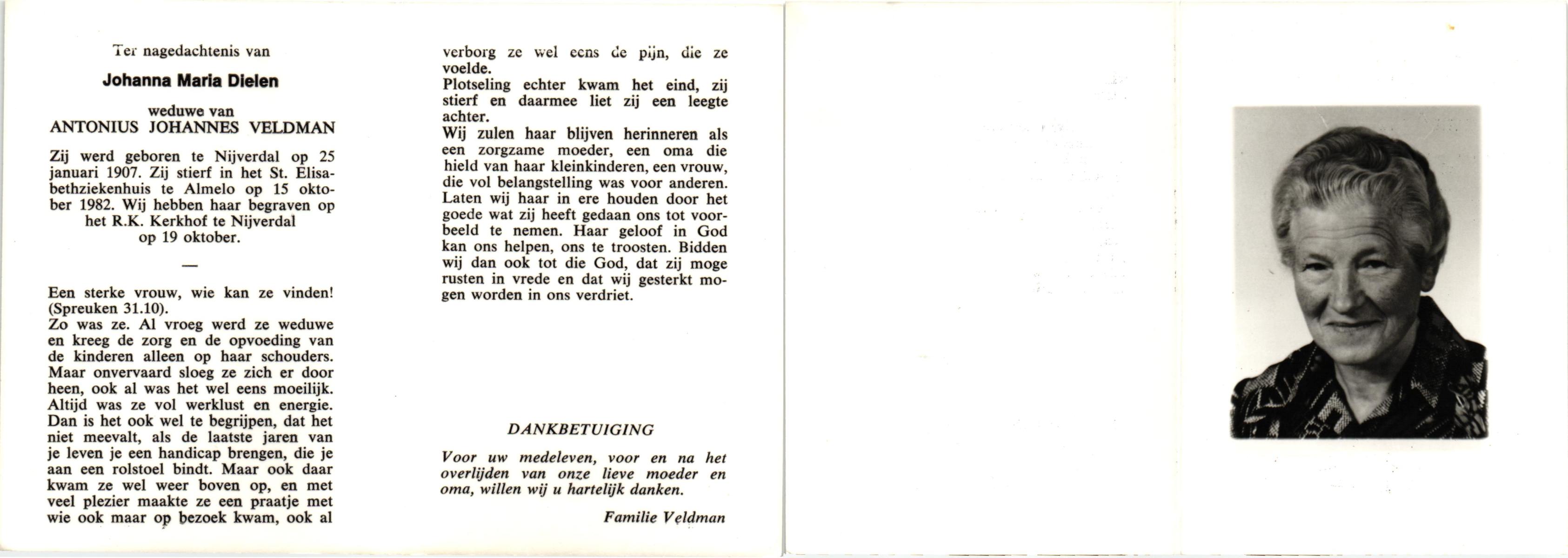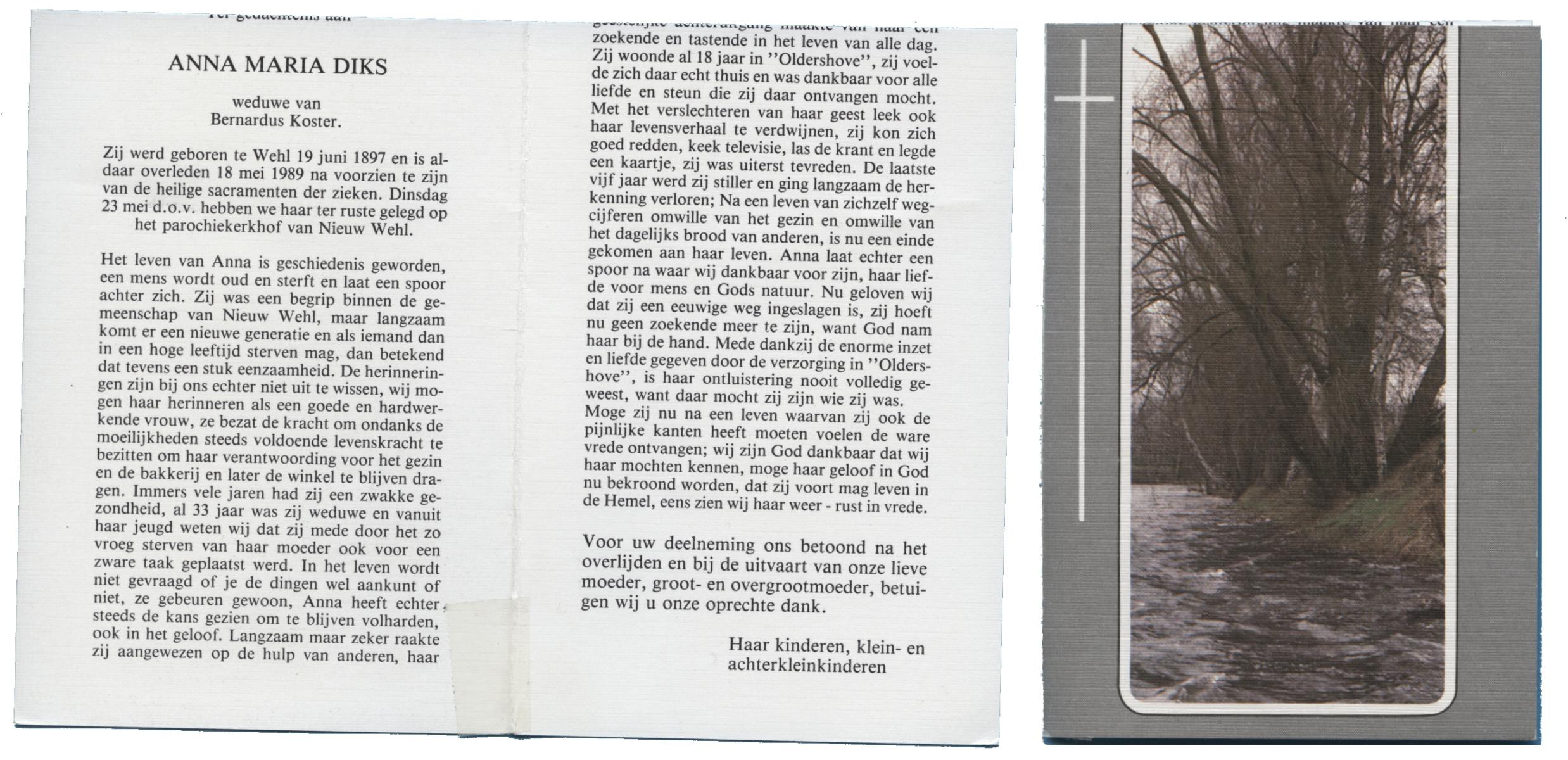 DIKS, Anna Maria, geboren op 19-06-1897 te Wehl, overleden op 18-5-1989 te Wehl op 91-jarige leeftijd, begraven op 23-5-1989 te Nieuw Wehl.