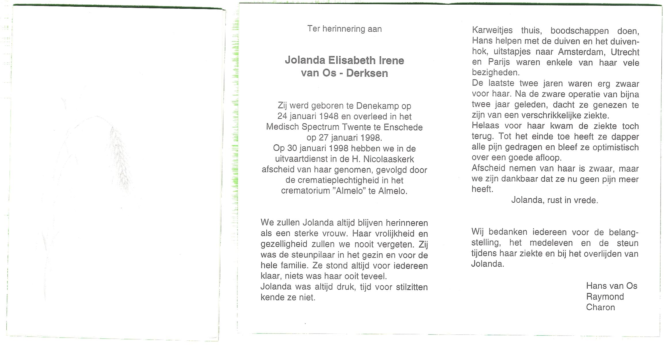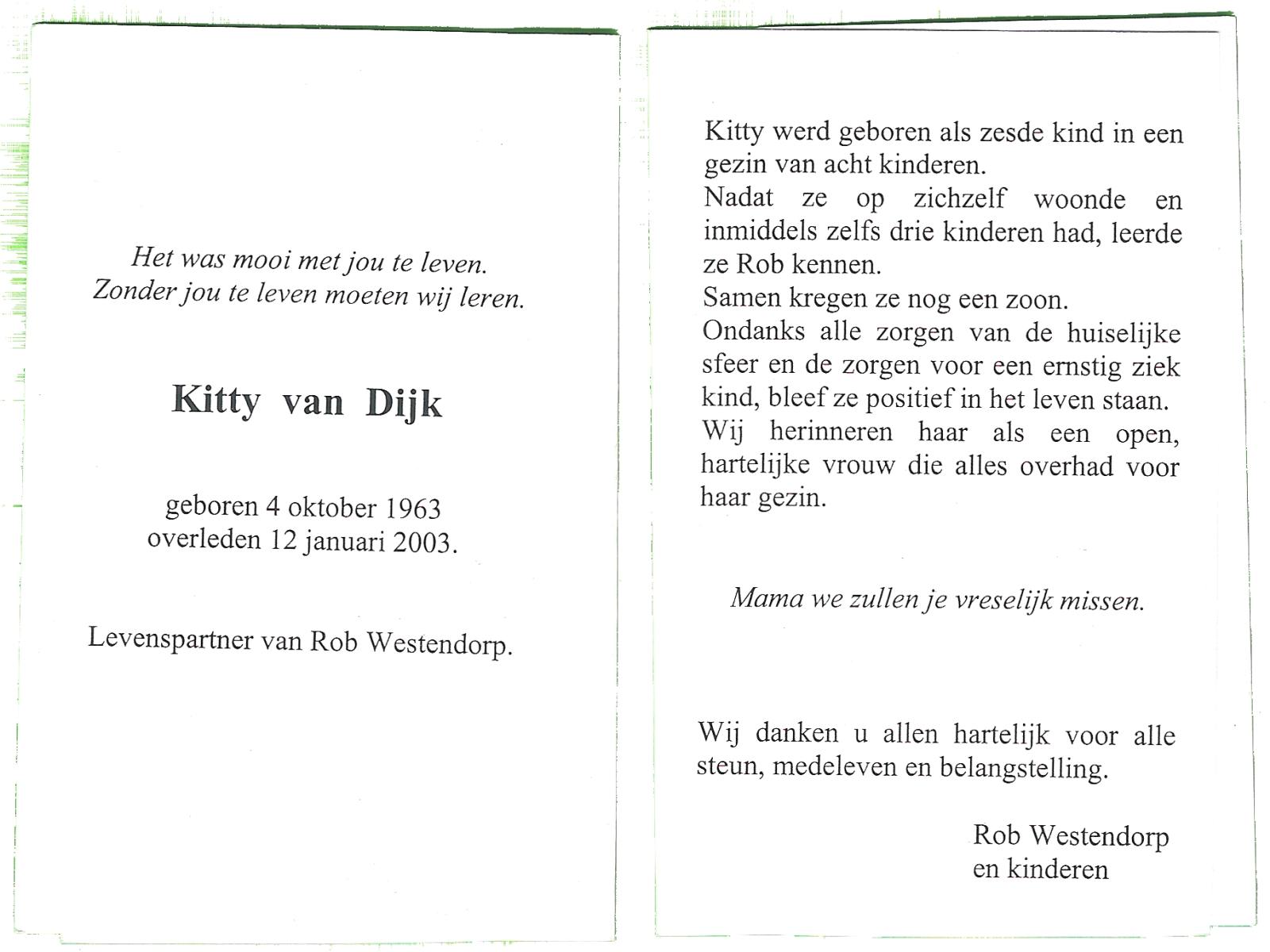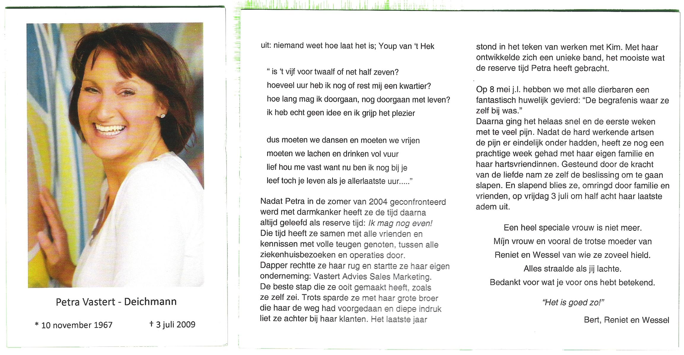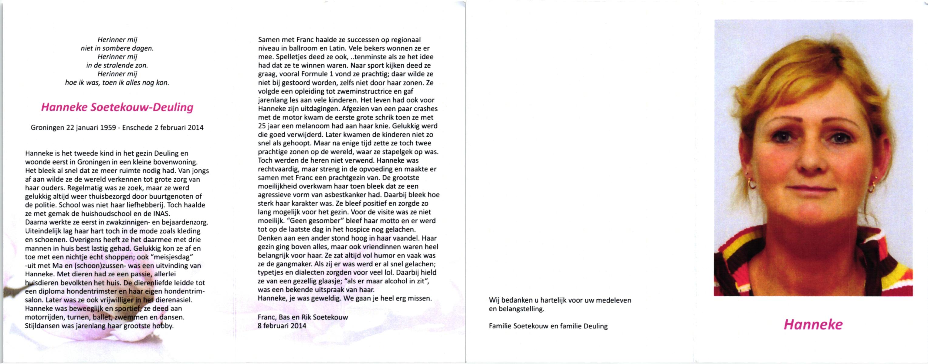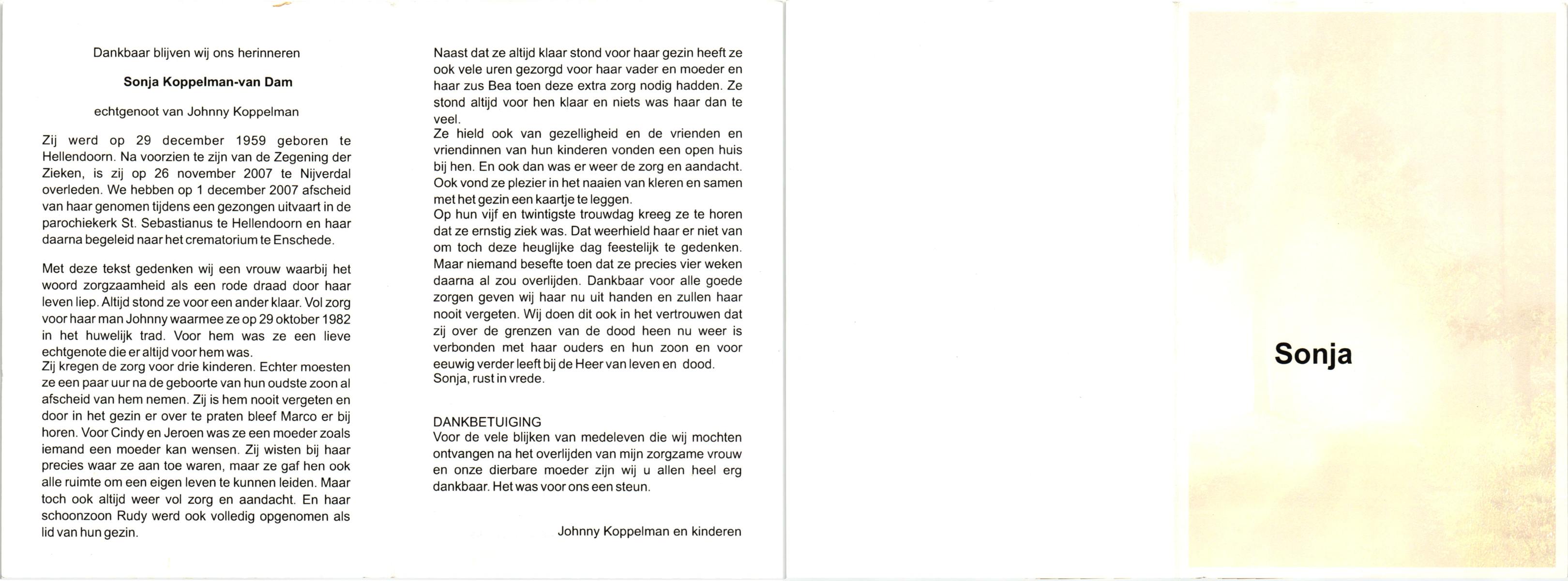 DAM, van, Sonja, geboren op 29-12-1959 te Hellendoorn, overleden op 26-11-2007 te Hellendoorn, Nijverdal op 47-jarige leeftijd, gecremeerd op 1-12-2007 te Usselo.