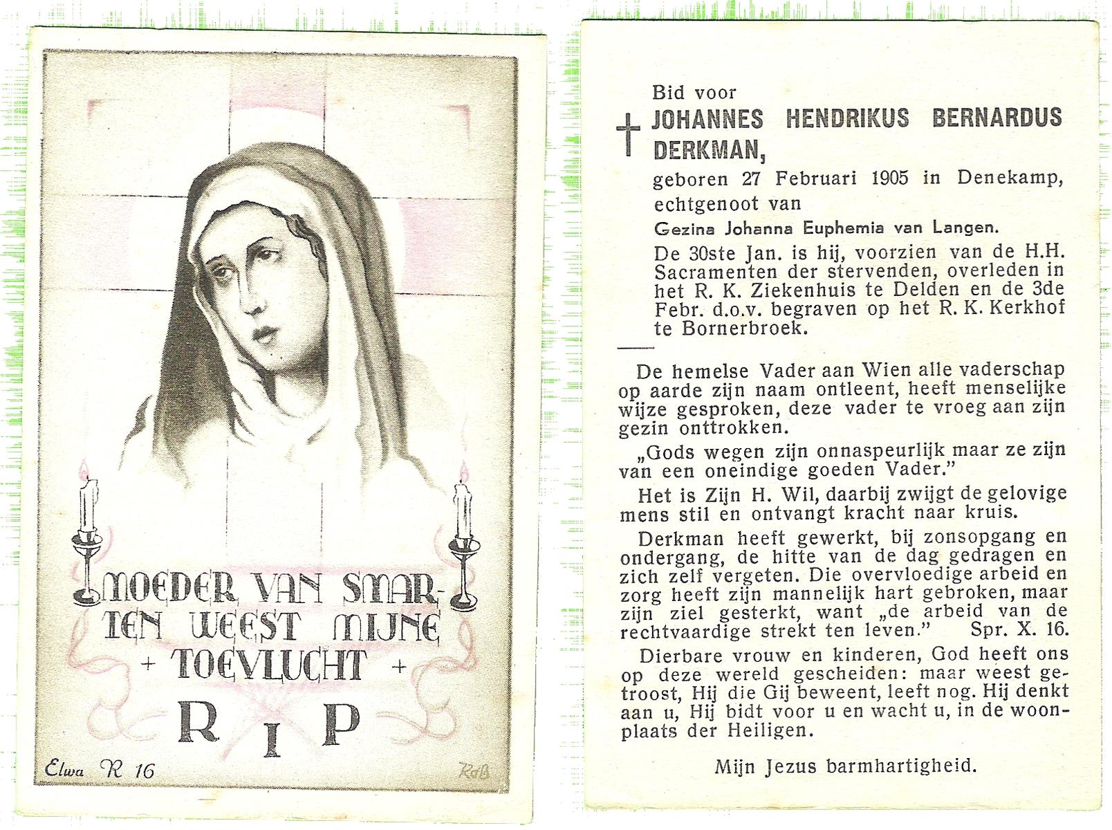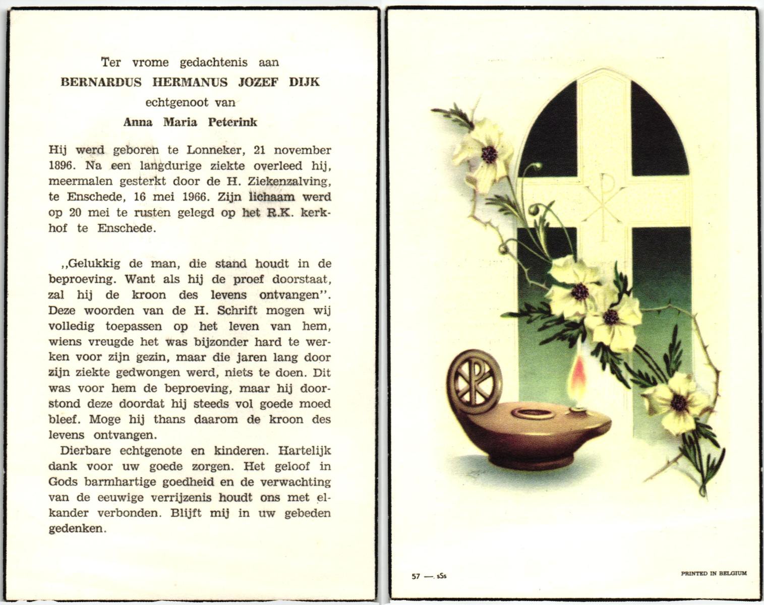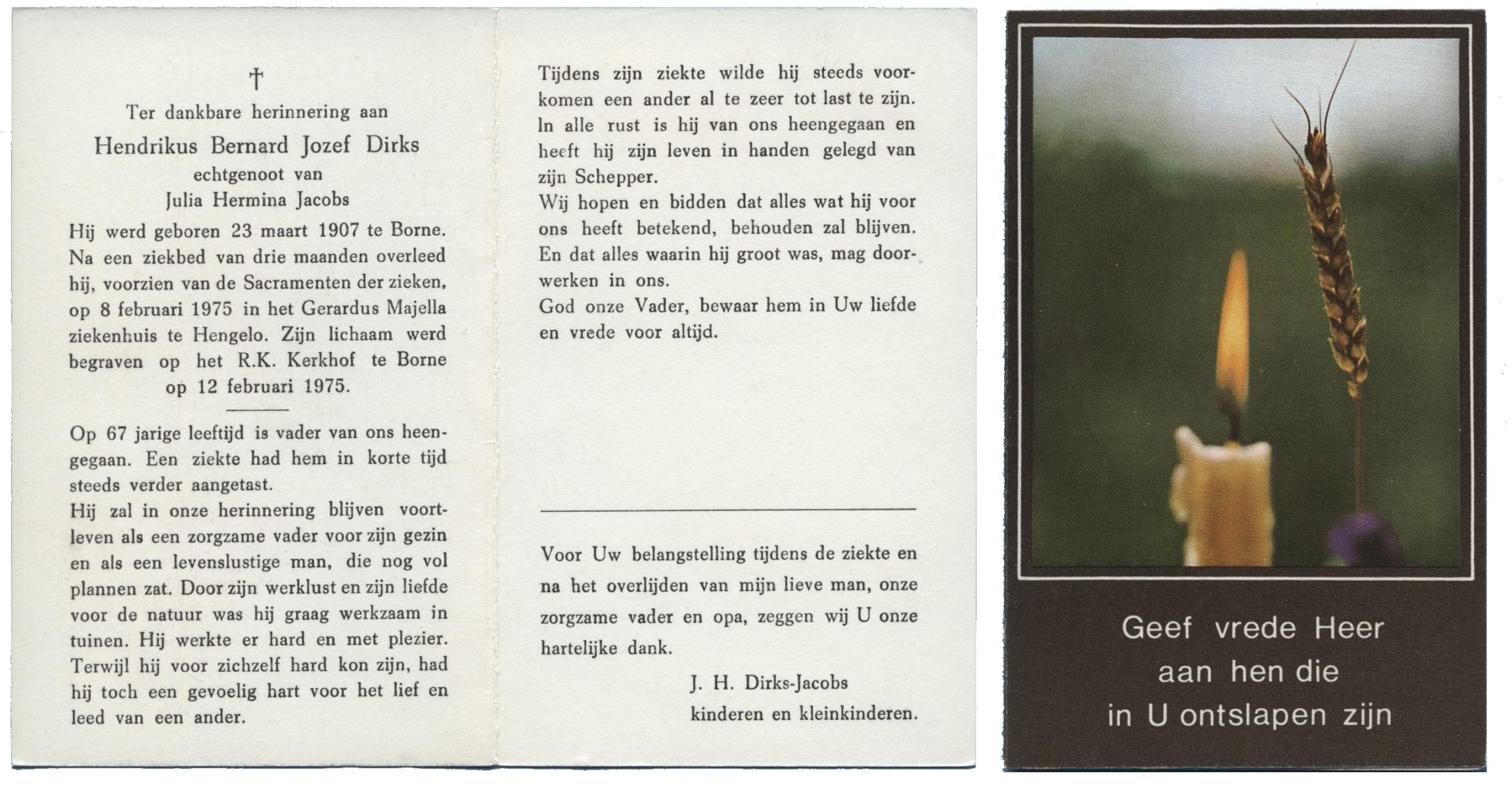 DIRKS, Hendrikus Bernard Jozef, geboren op 23-3-1907 te Borne, overleden op 8-2-1975 te Hengelo (Ov.) op 67-jarige leeftijd, begraven op 12-2-1975 te Borne.