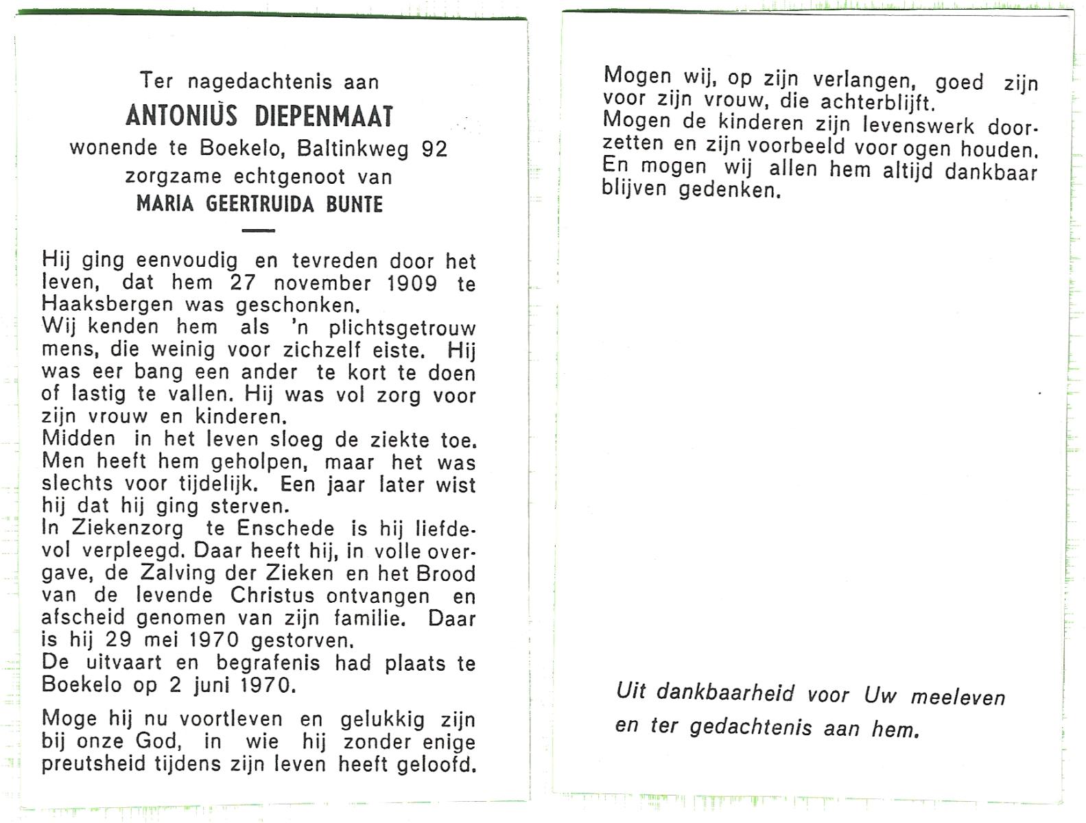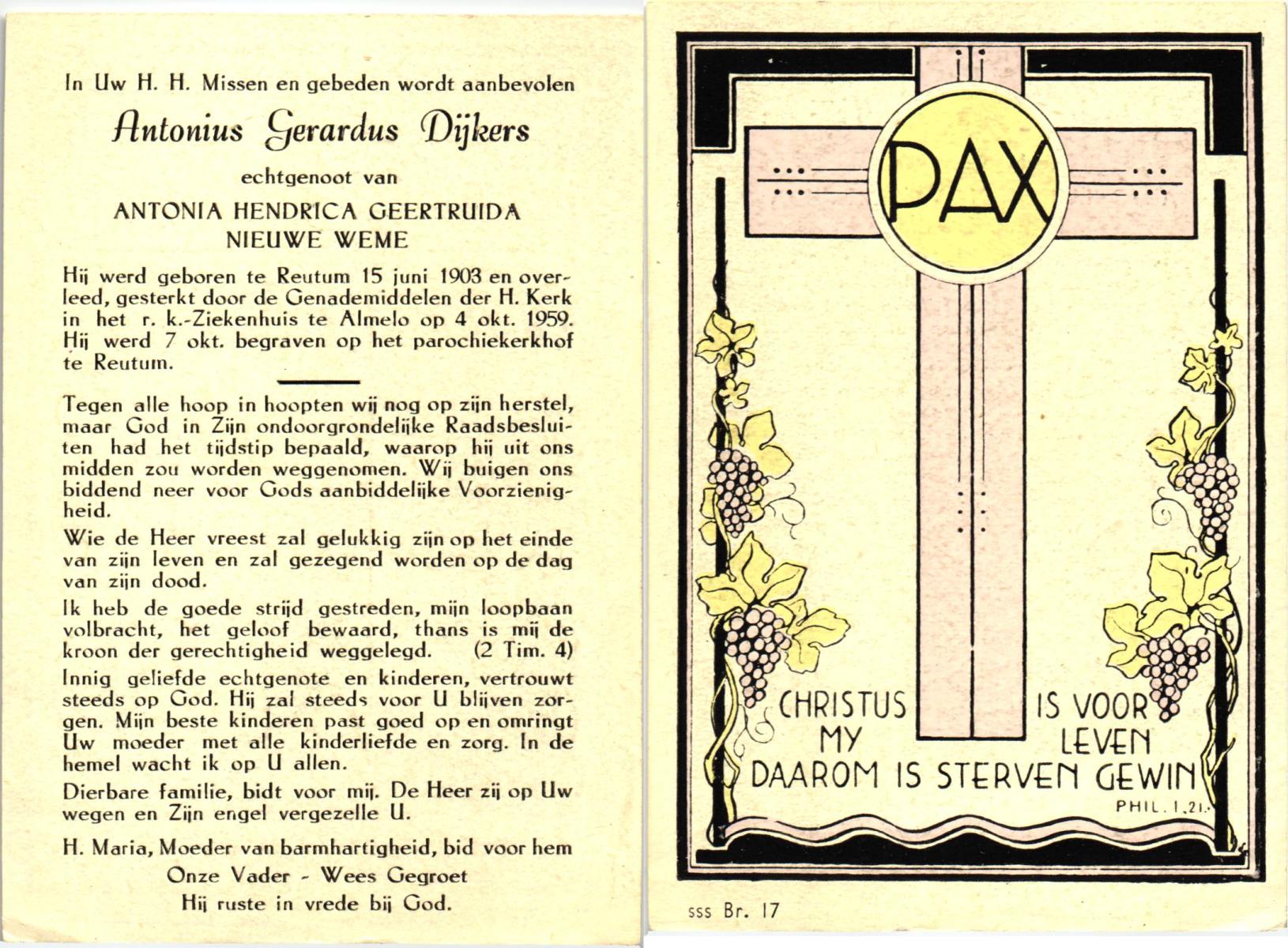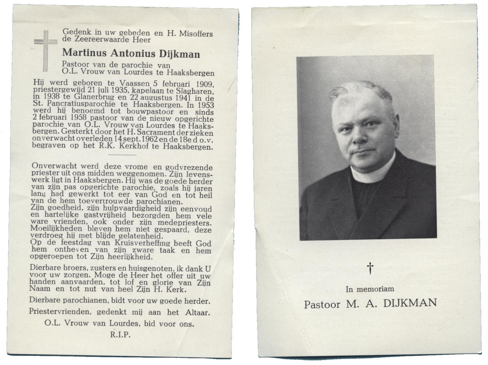 DIJKMAN, Martinus Antonius, geboren op 5-2-1909 te Vaassen, overleden op 14-9-1962 te Haaksbergen op 53-jarige leeftijd, begraven op 18-9-1962 te Haaksbergen.