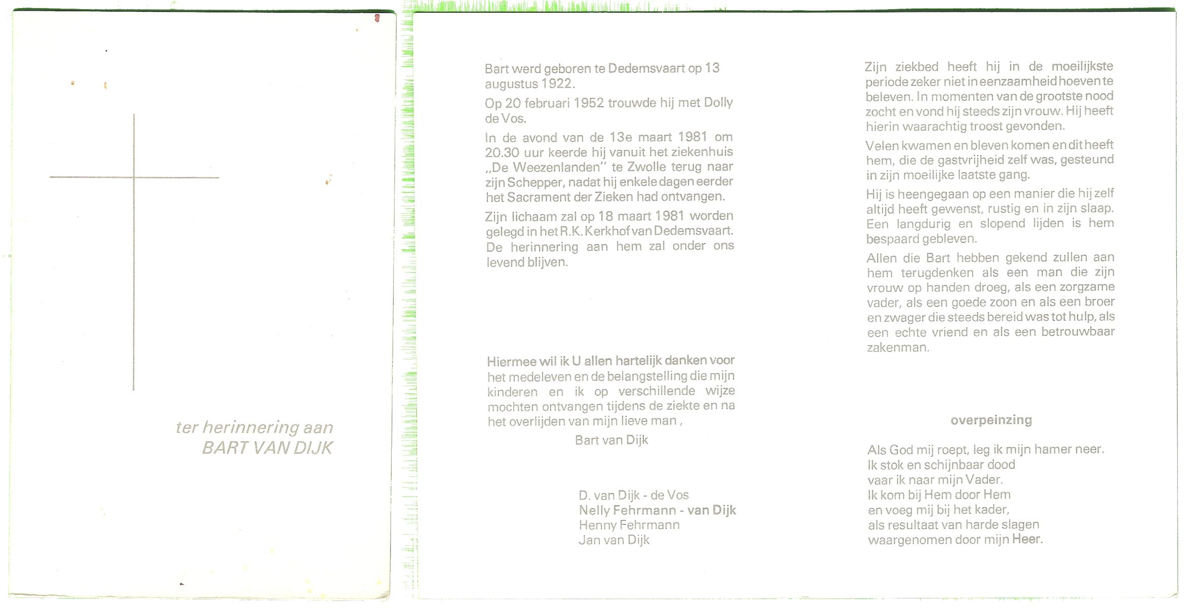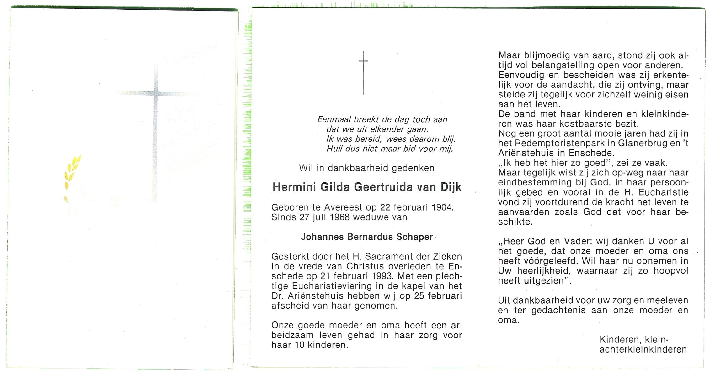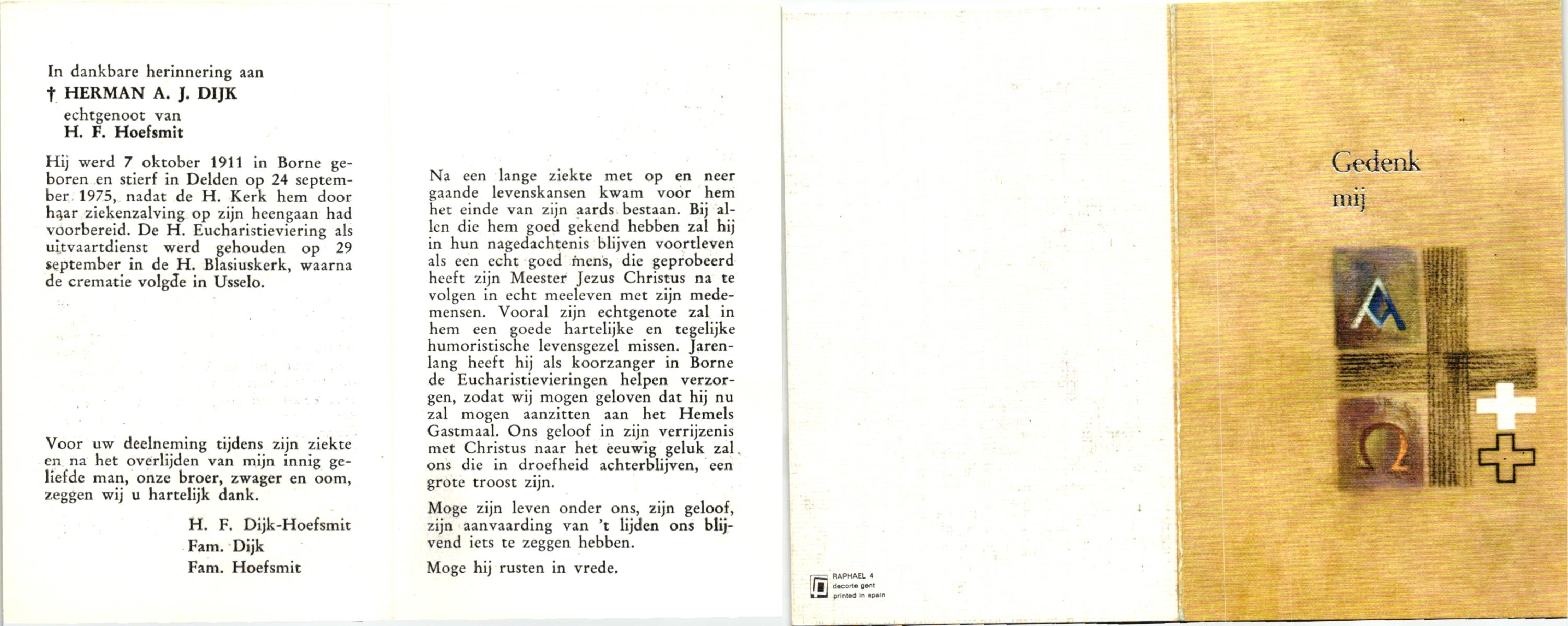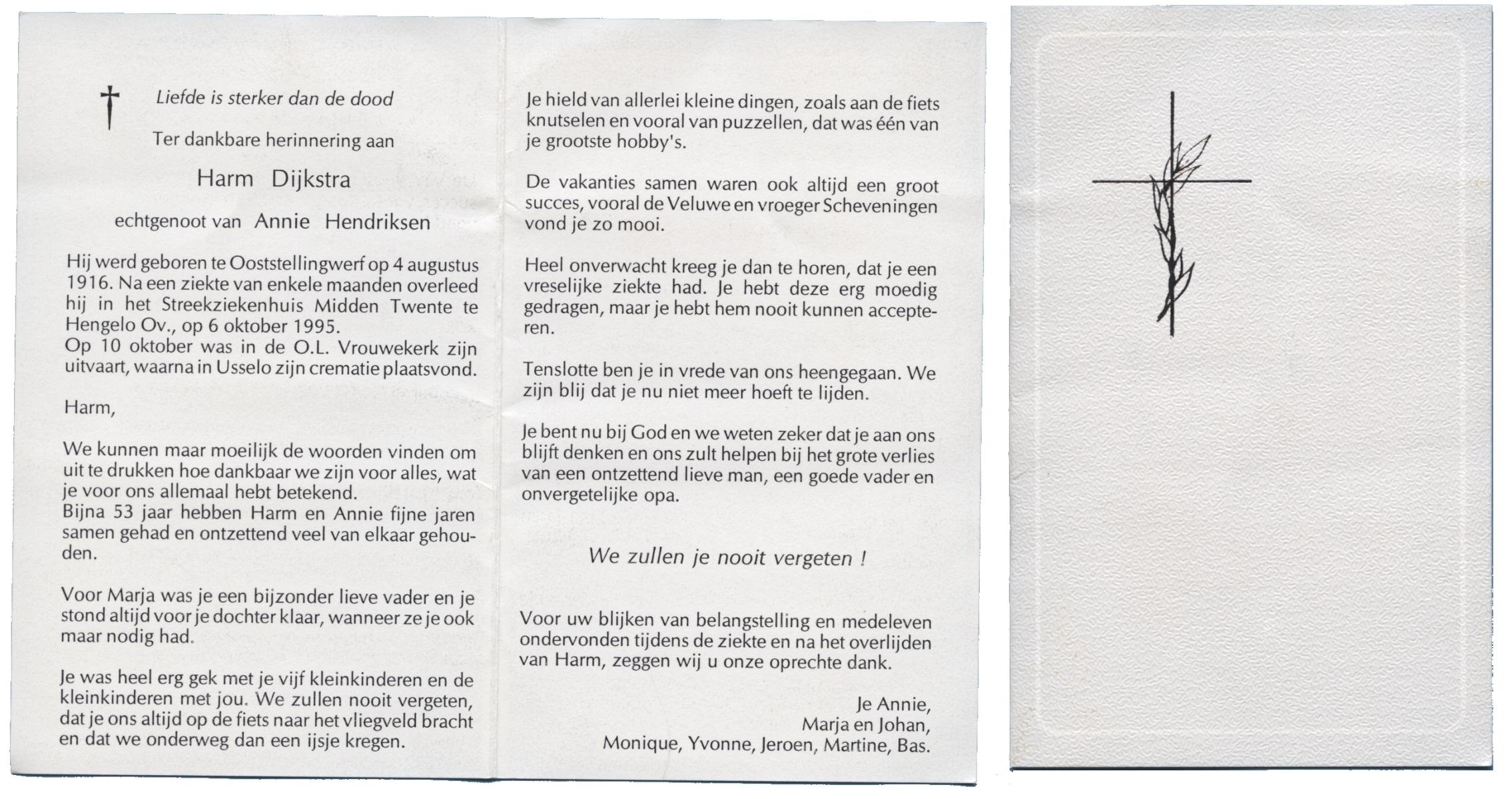 DIJKSTRA, Harm, geboren op 4-8-1916 te Ooststellingwef, overleden op 6-10-1995 te Hengelo (Ov.) op 79-jarige leeftijd, gecremeerd op 10-10-1995 te Usselo.