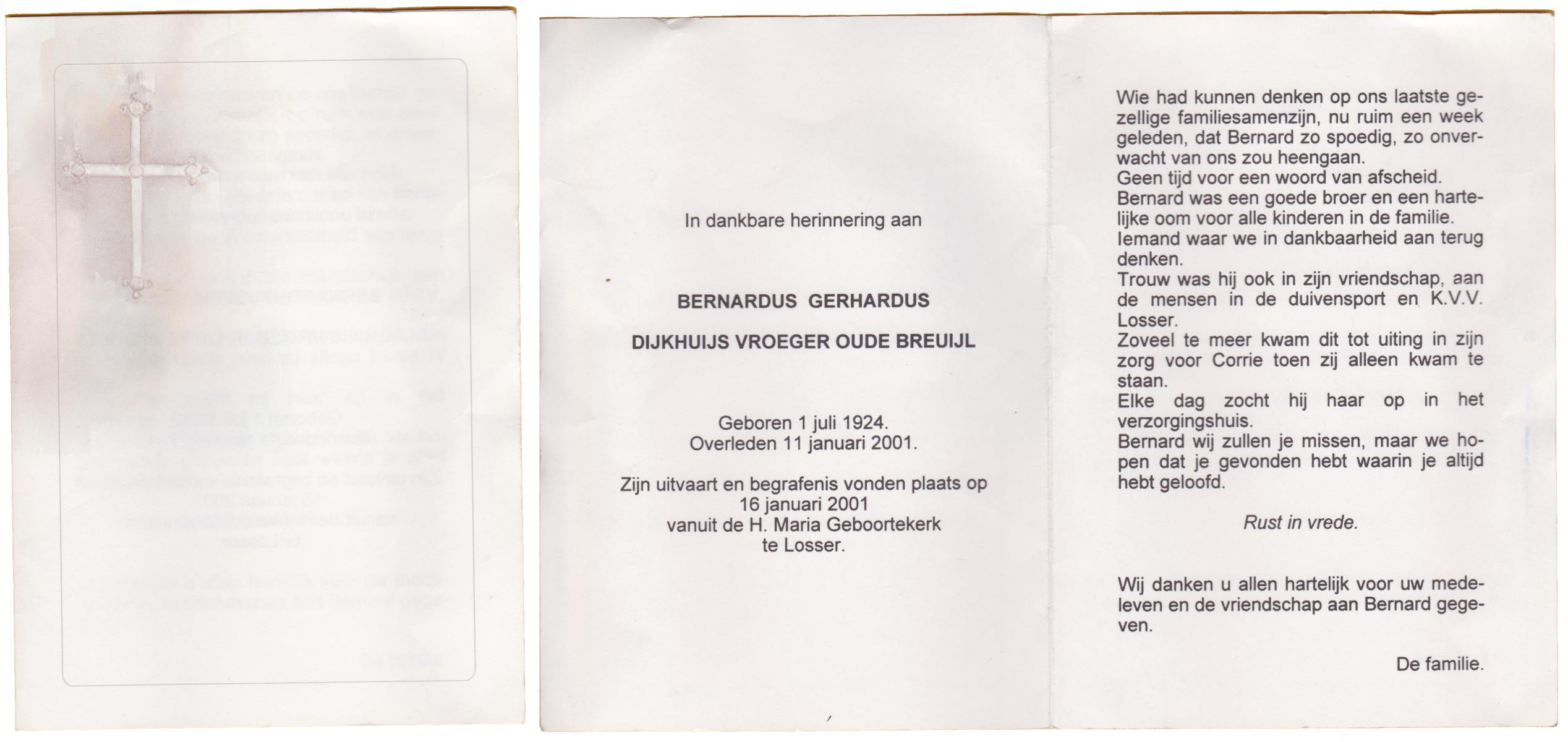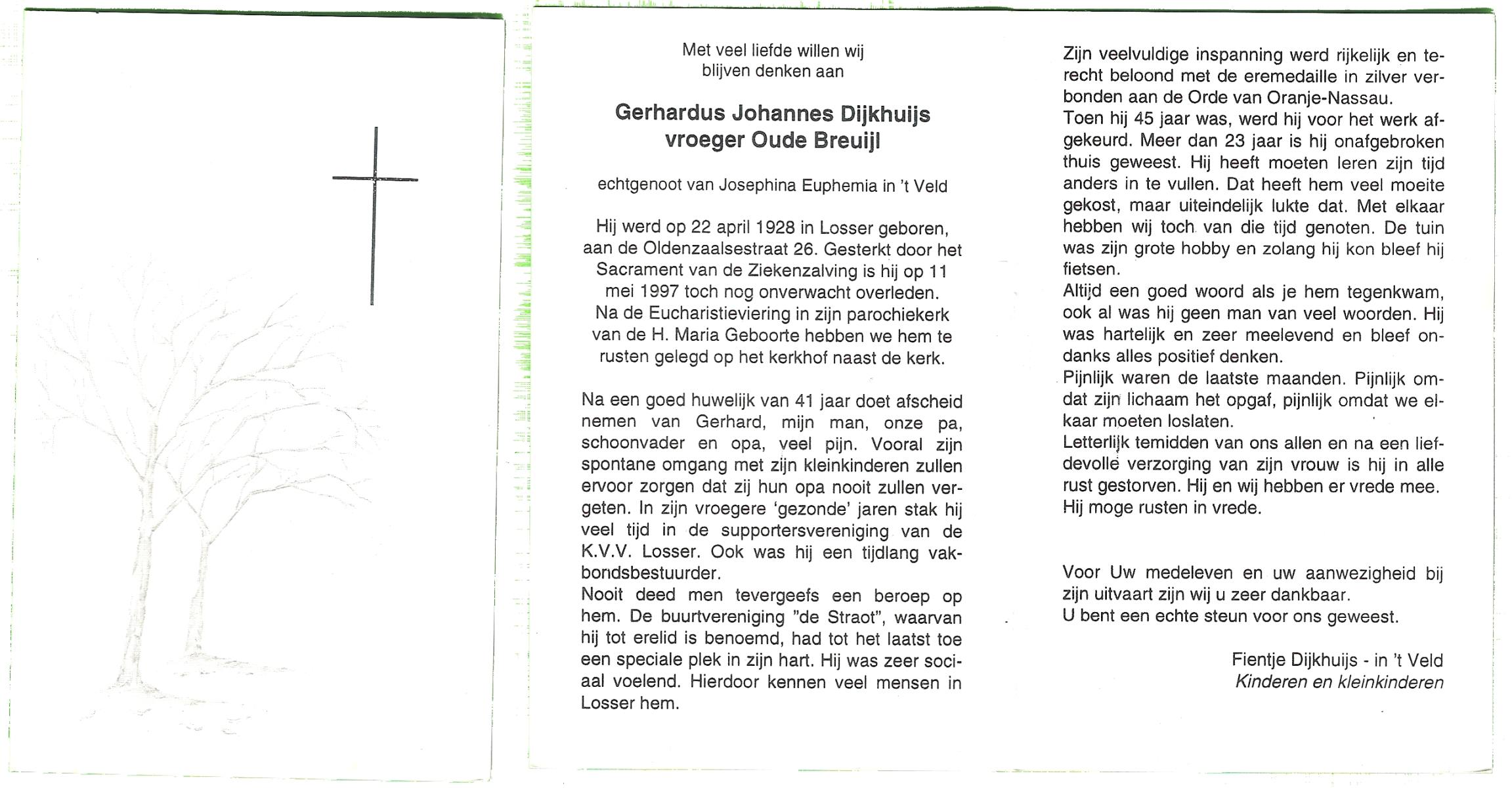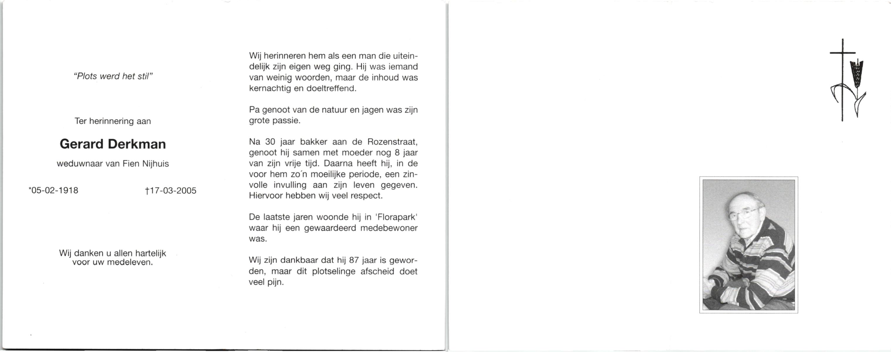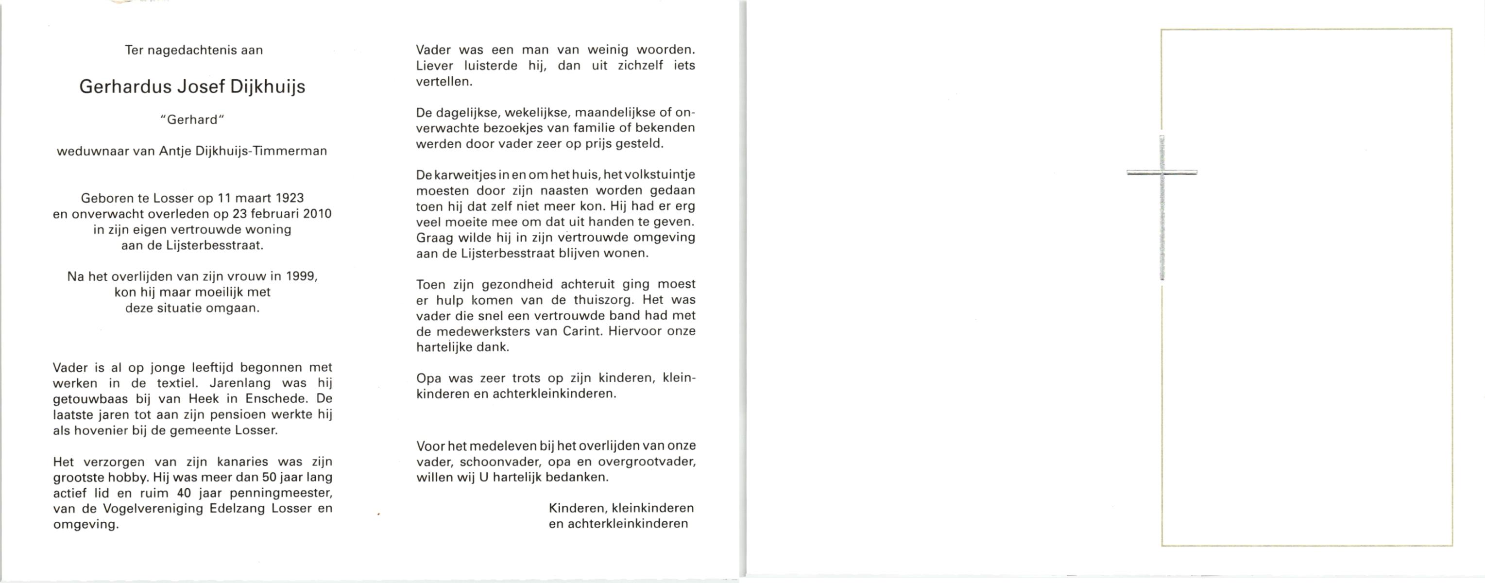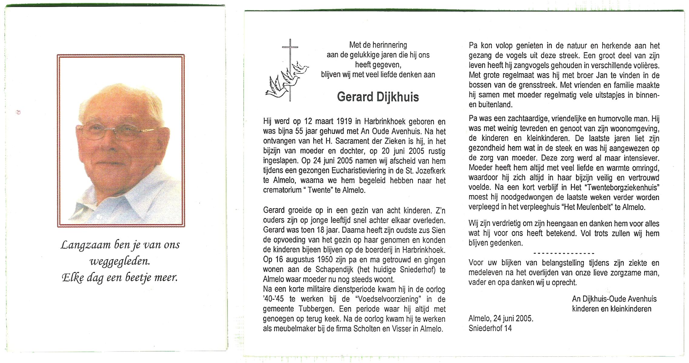 DIJKHUIS, Gerard, geboren op 12-3-1919 te Harbrinkhoek, overleden op 20-6-2005 op 86-jarige leeftijd, gecremeerd op 24-6-2005 te Almelo.