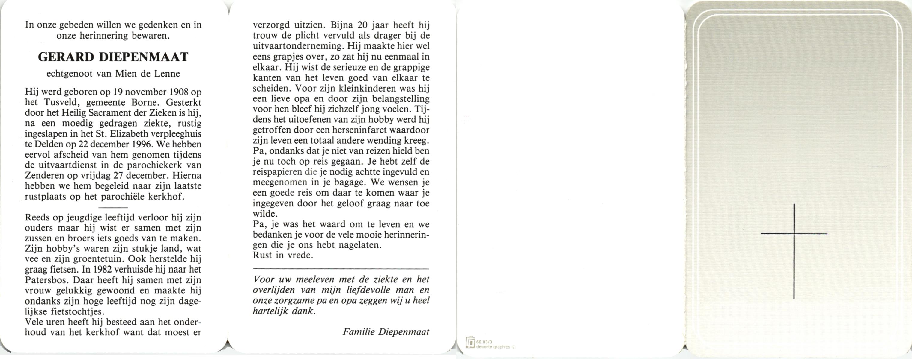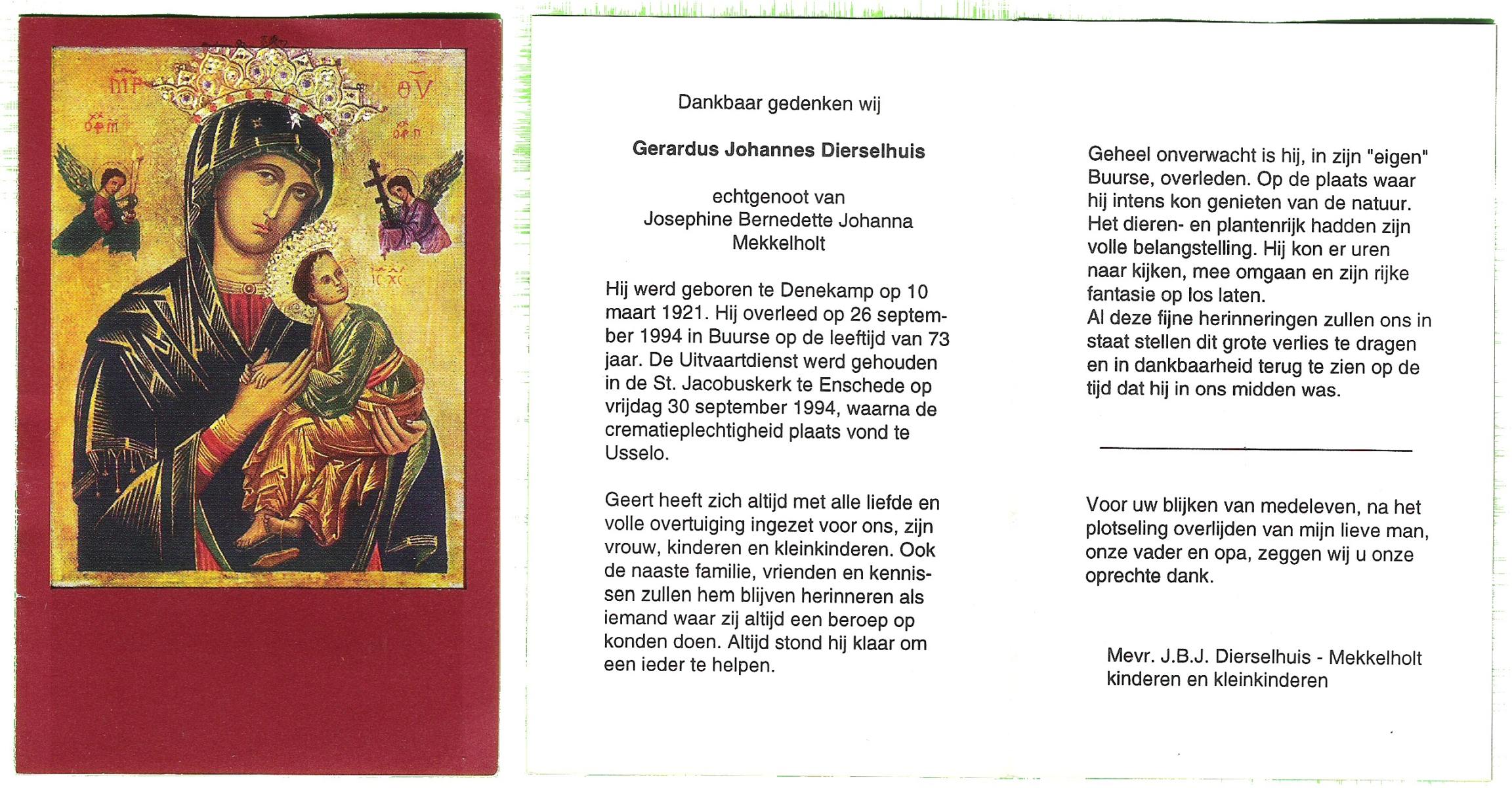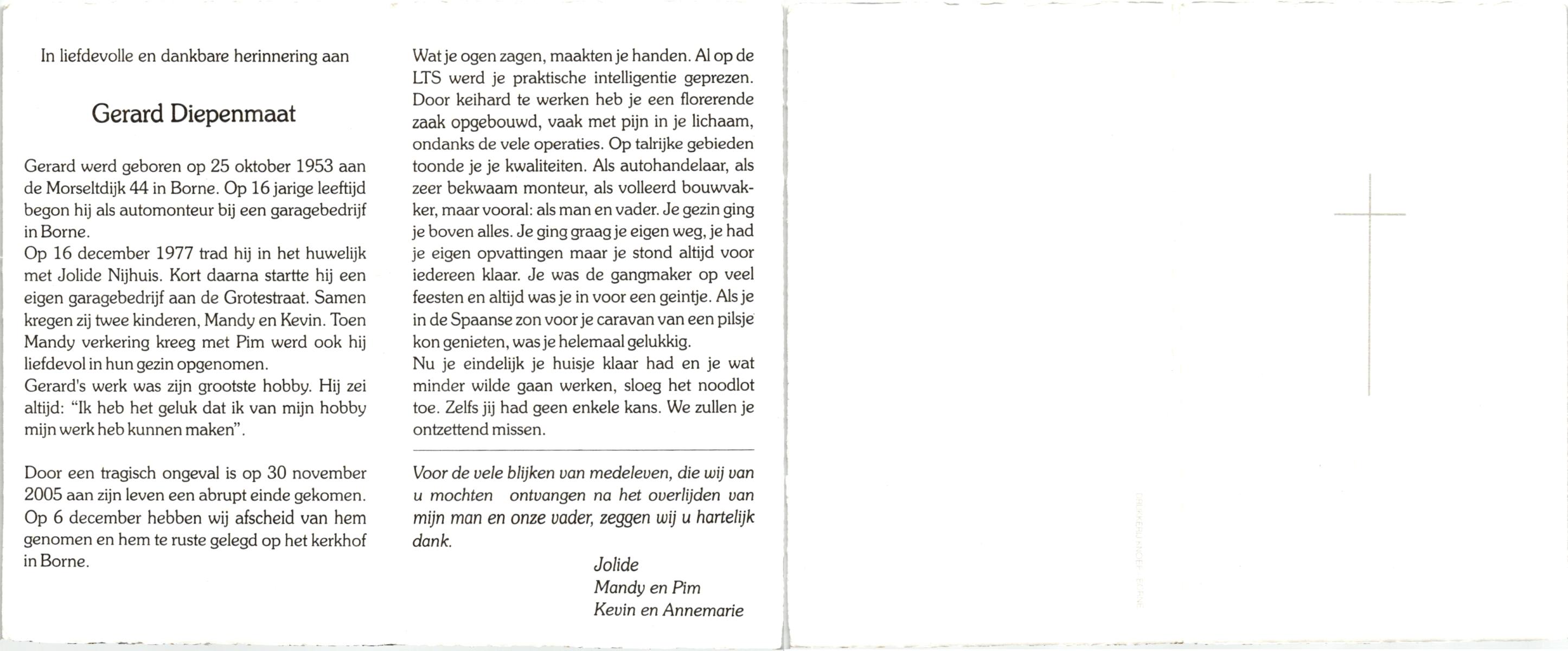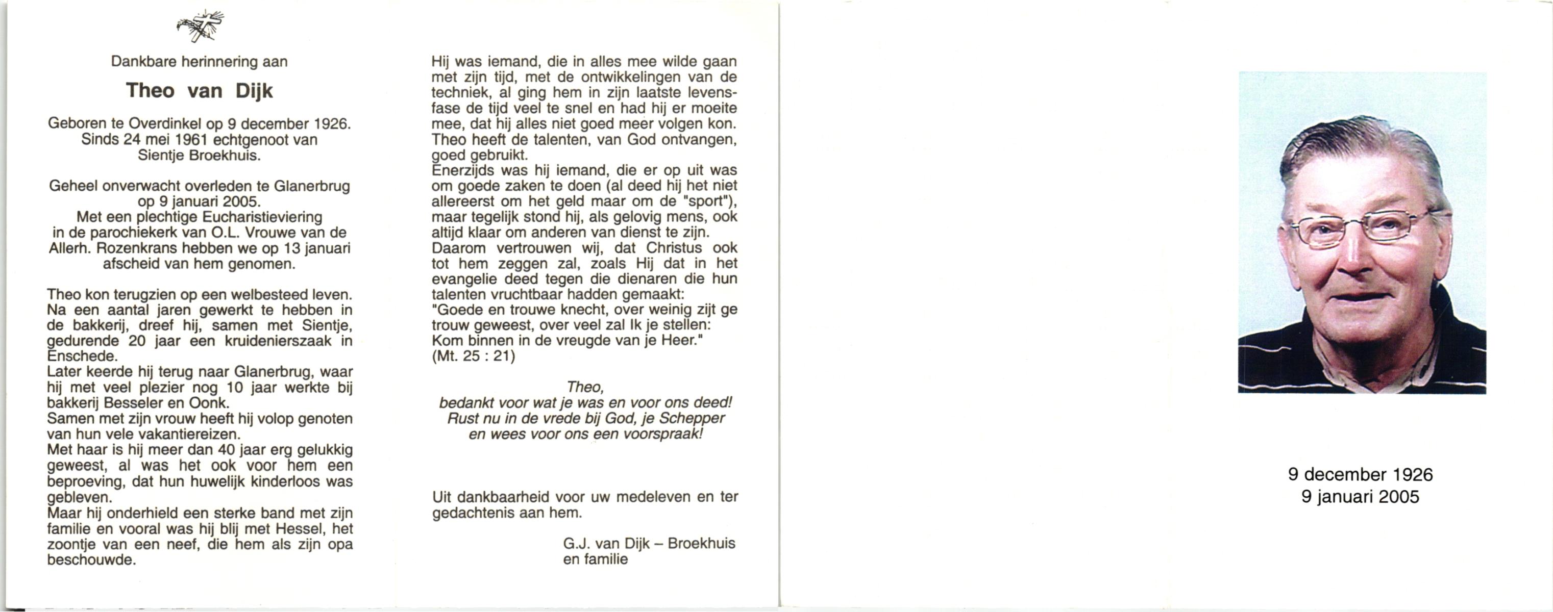 DIJKHUIS, Gerard, geboren op 12-3-1919 te Harbrinkhoek, overleden op 20-6-2005 op 86-jarige leeftijd, gecremeerd op 24-6-2005 te Almelo.