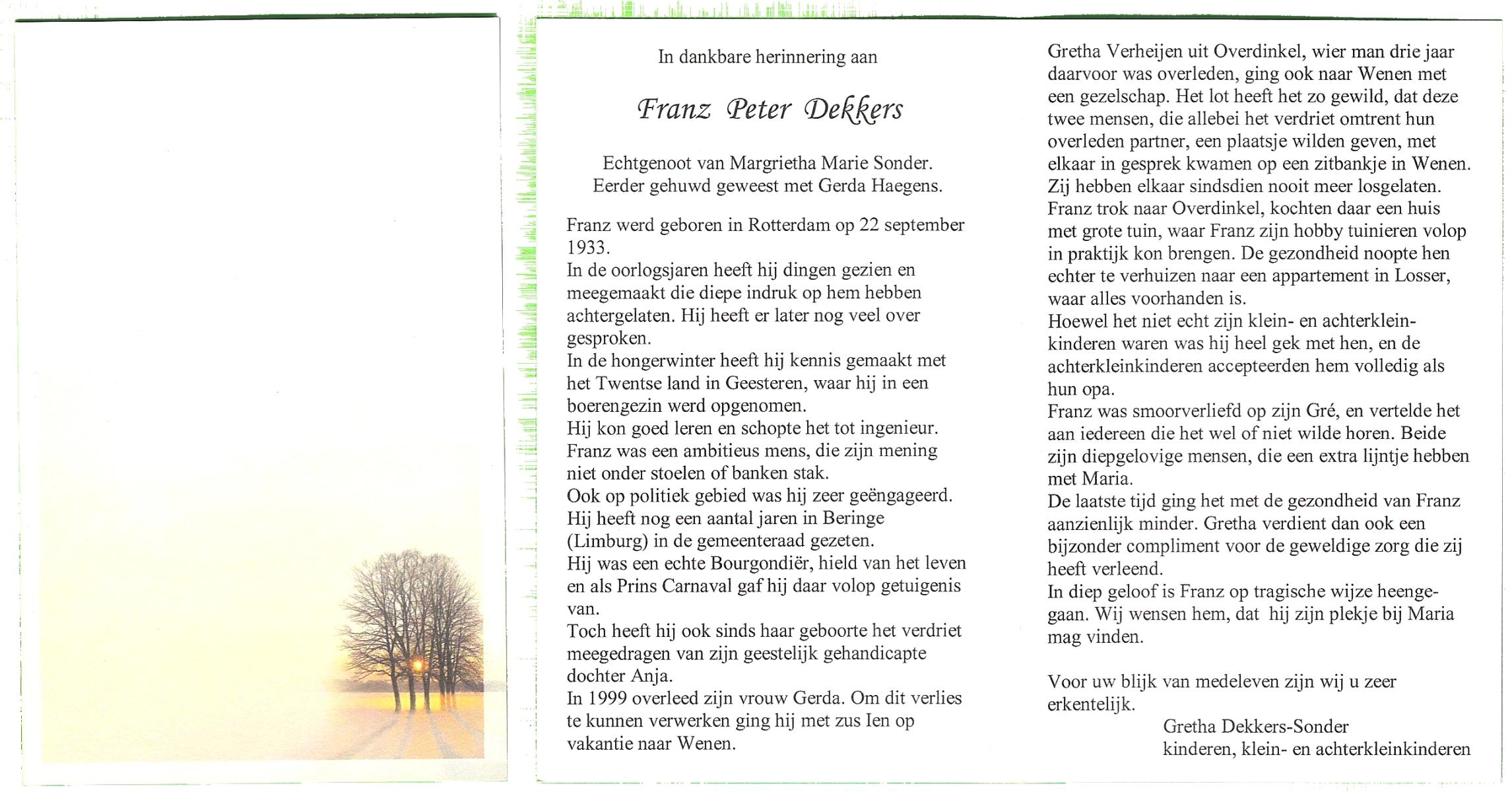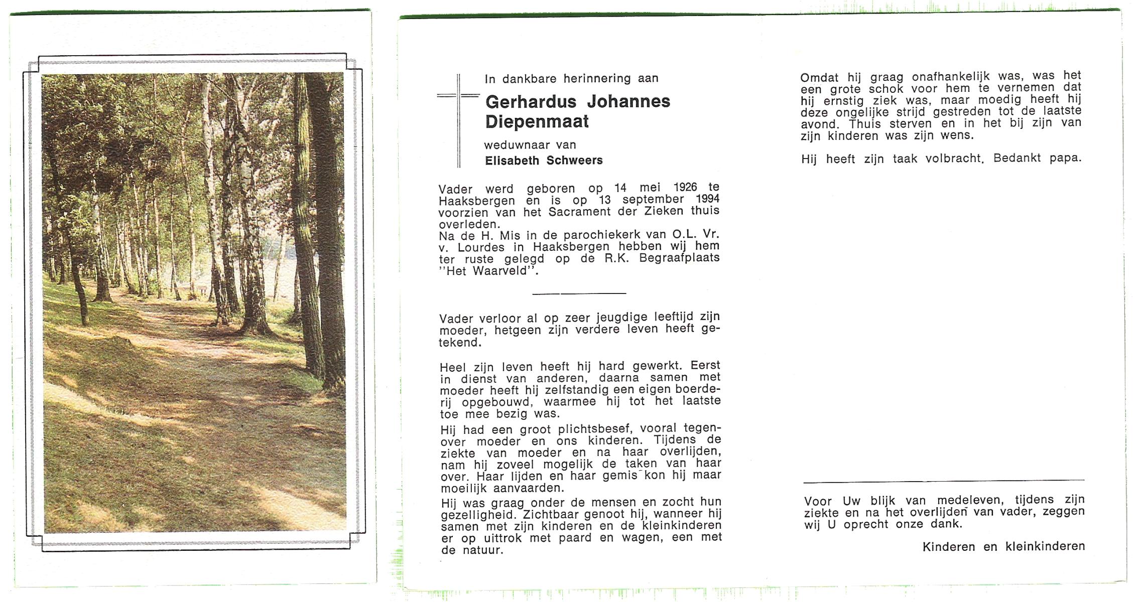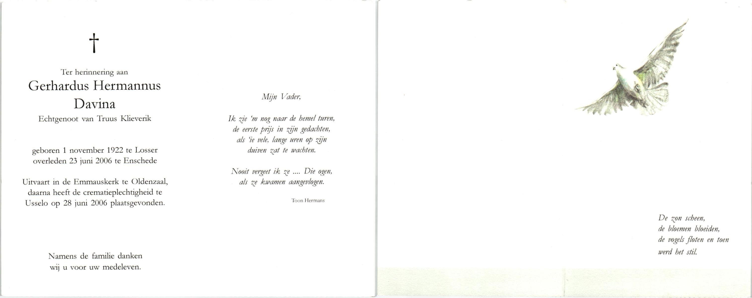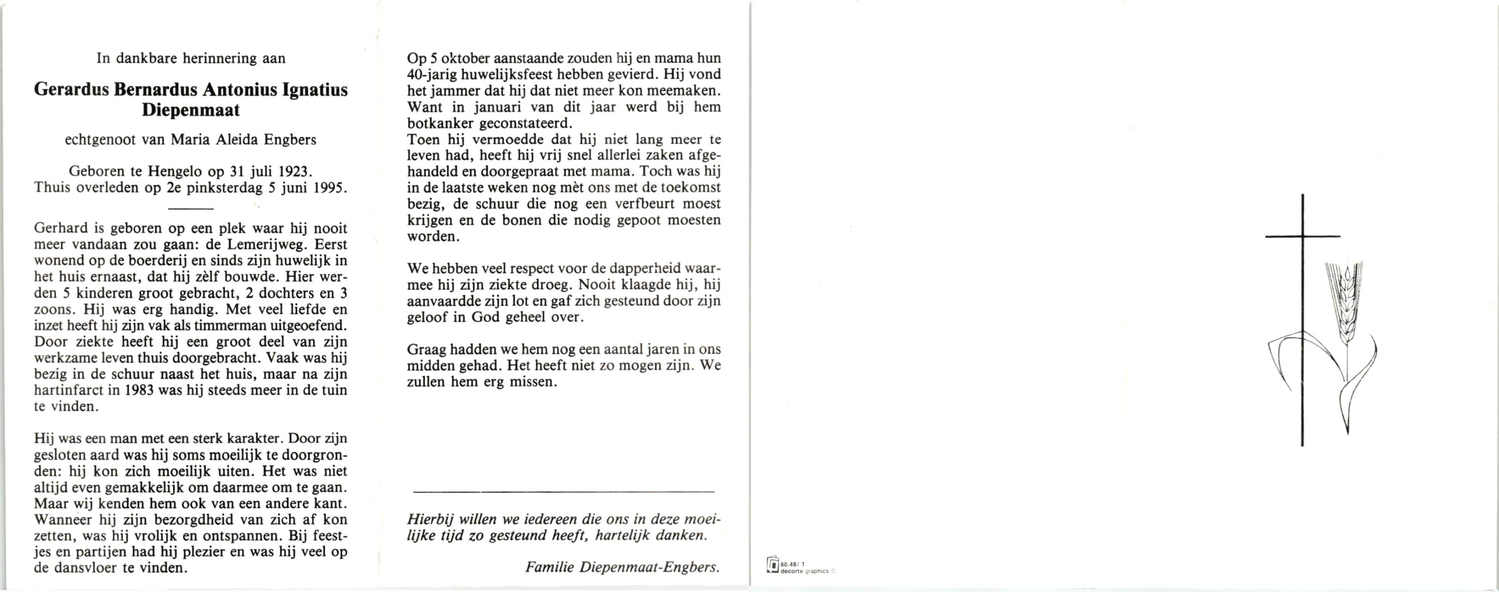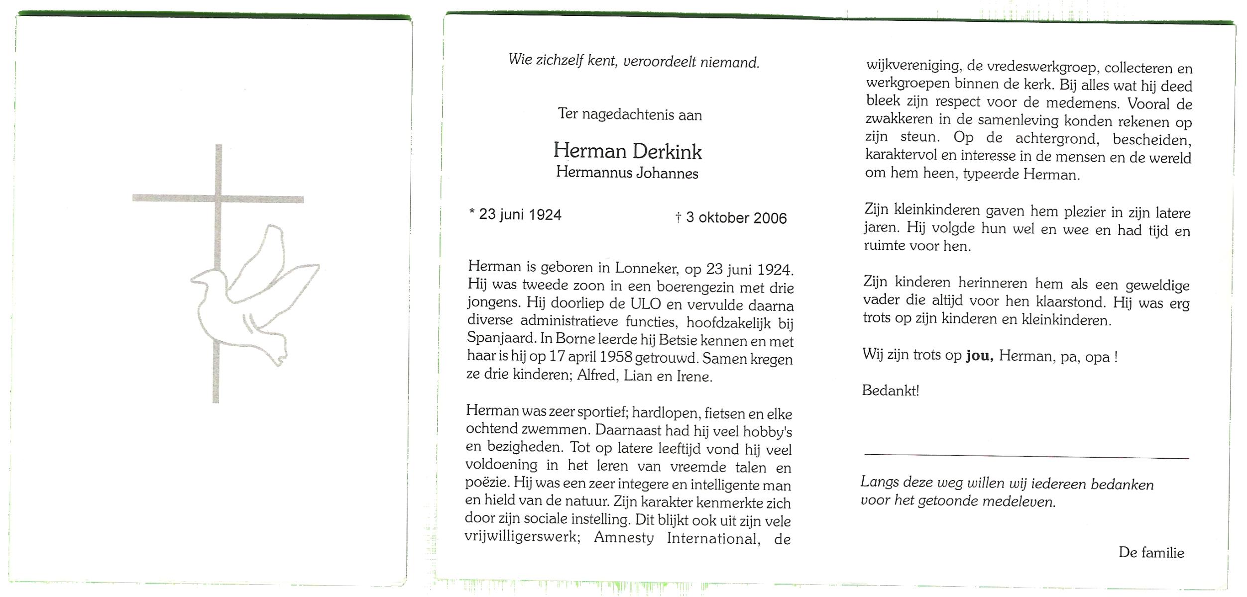 DIJKHUIS, Gerard, geboren op 12-3-1919 te Harbrinkhoek, overleden op 20-6-2005 op 86-jarige leeftijd, gecremeerd op 24-6-2005 te Almelo.
