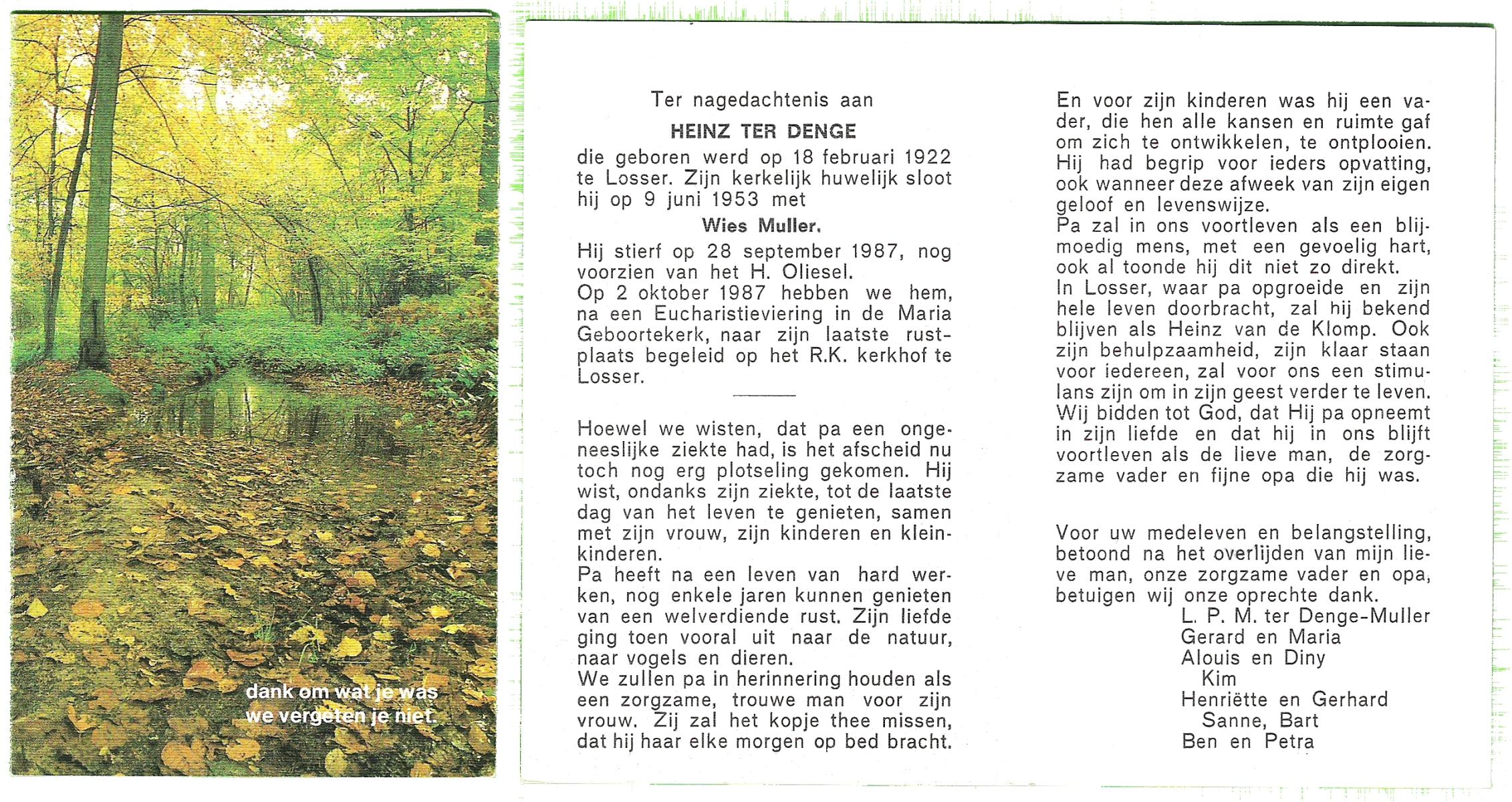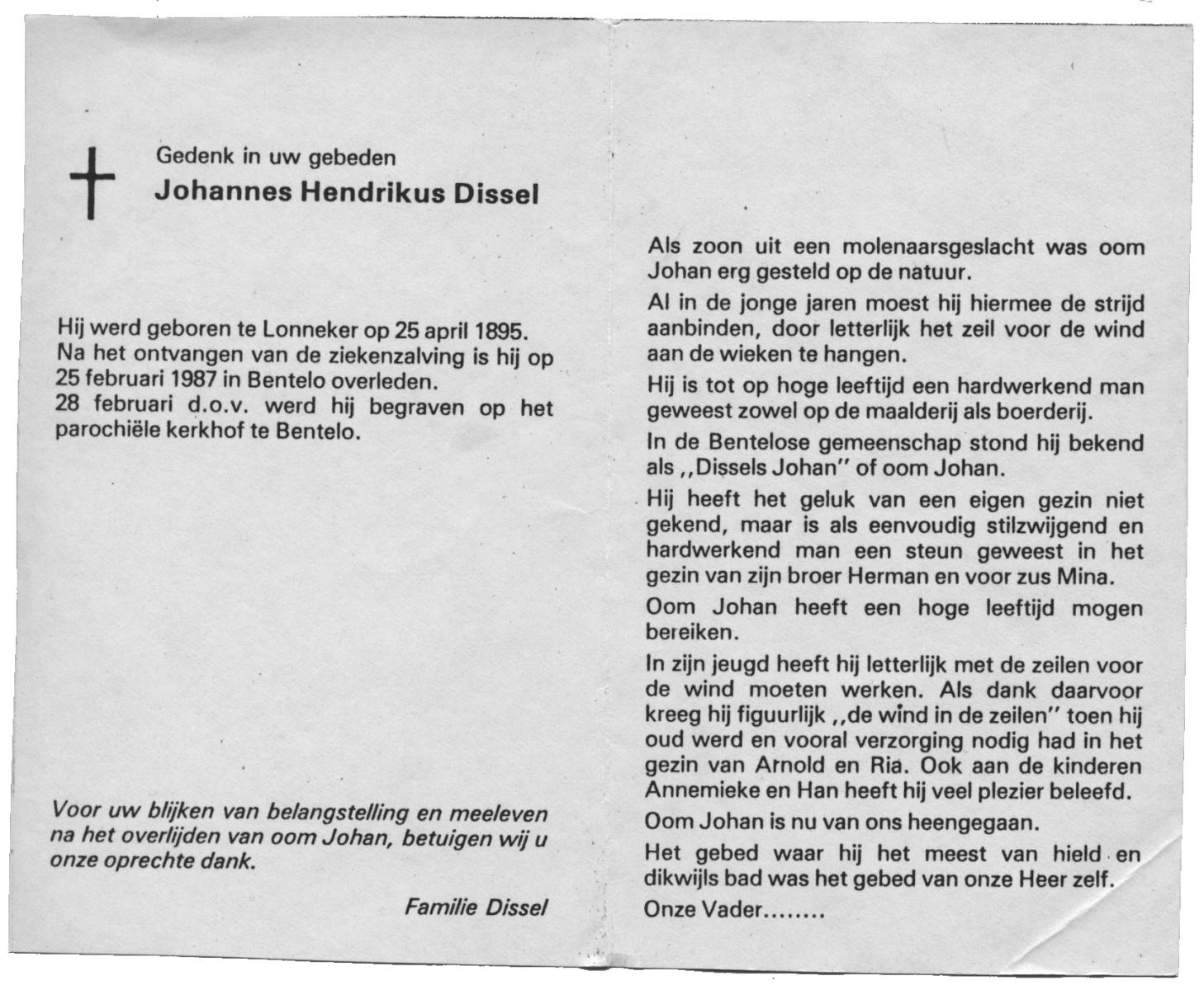 DISSEL, Johannes Hendrikus, geboren op 25-04-1895 te Lonneker, overleden op 25-2-1987 te Bentelo op 91-jarige leeftijd, begraven op 28-2-1987 te Bentelo.