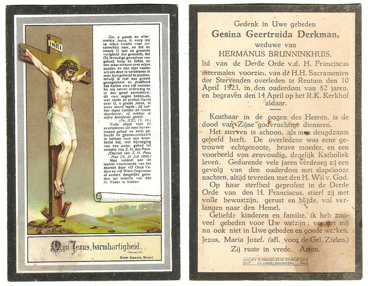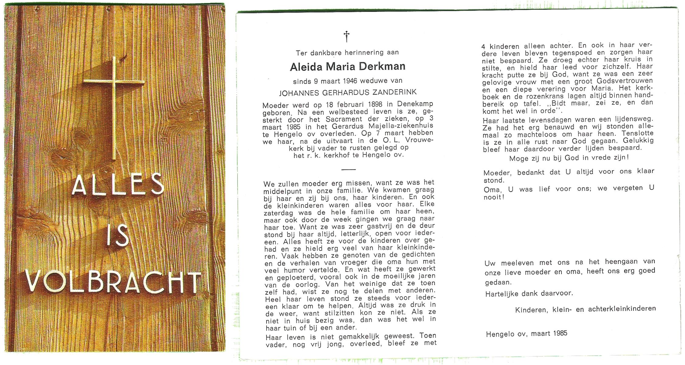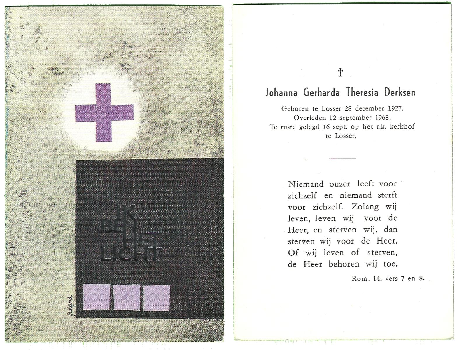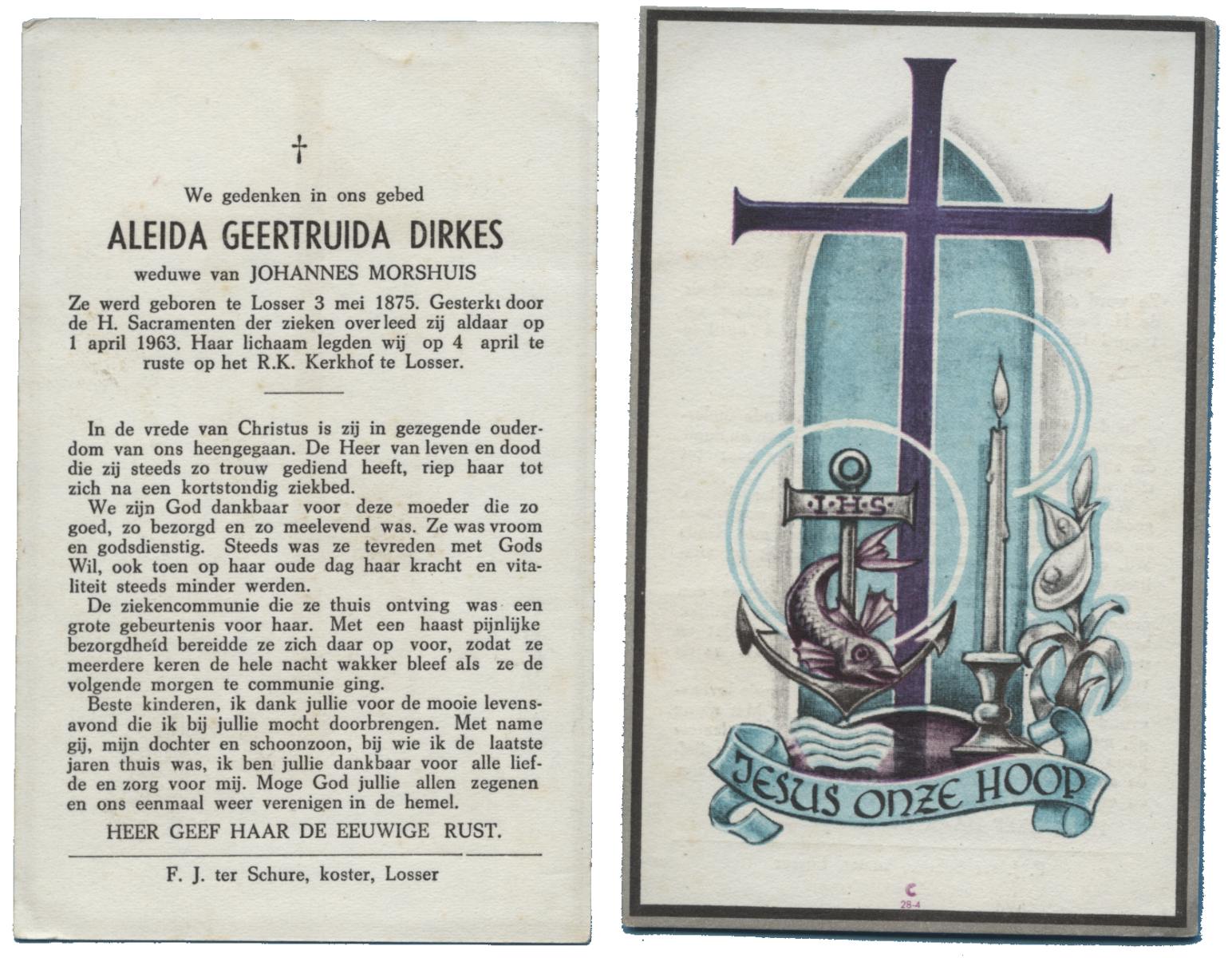 DIRKES, Aleida Geertruida, geboren op 03-05-1875 te Losser, overleden op 1-4-1963 te Losser op 87-jarige leeftijd, begraven op 4-4-1963 te Losser.