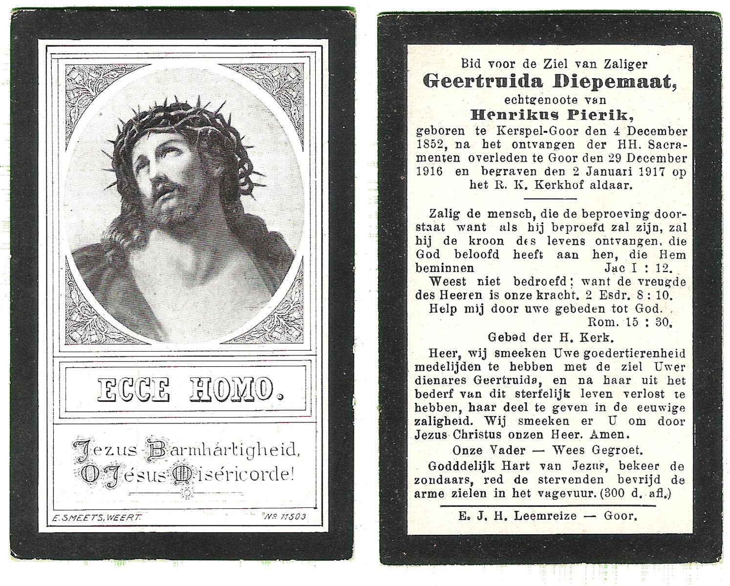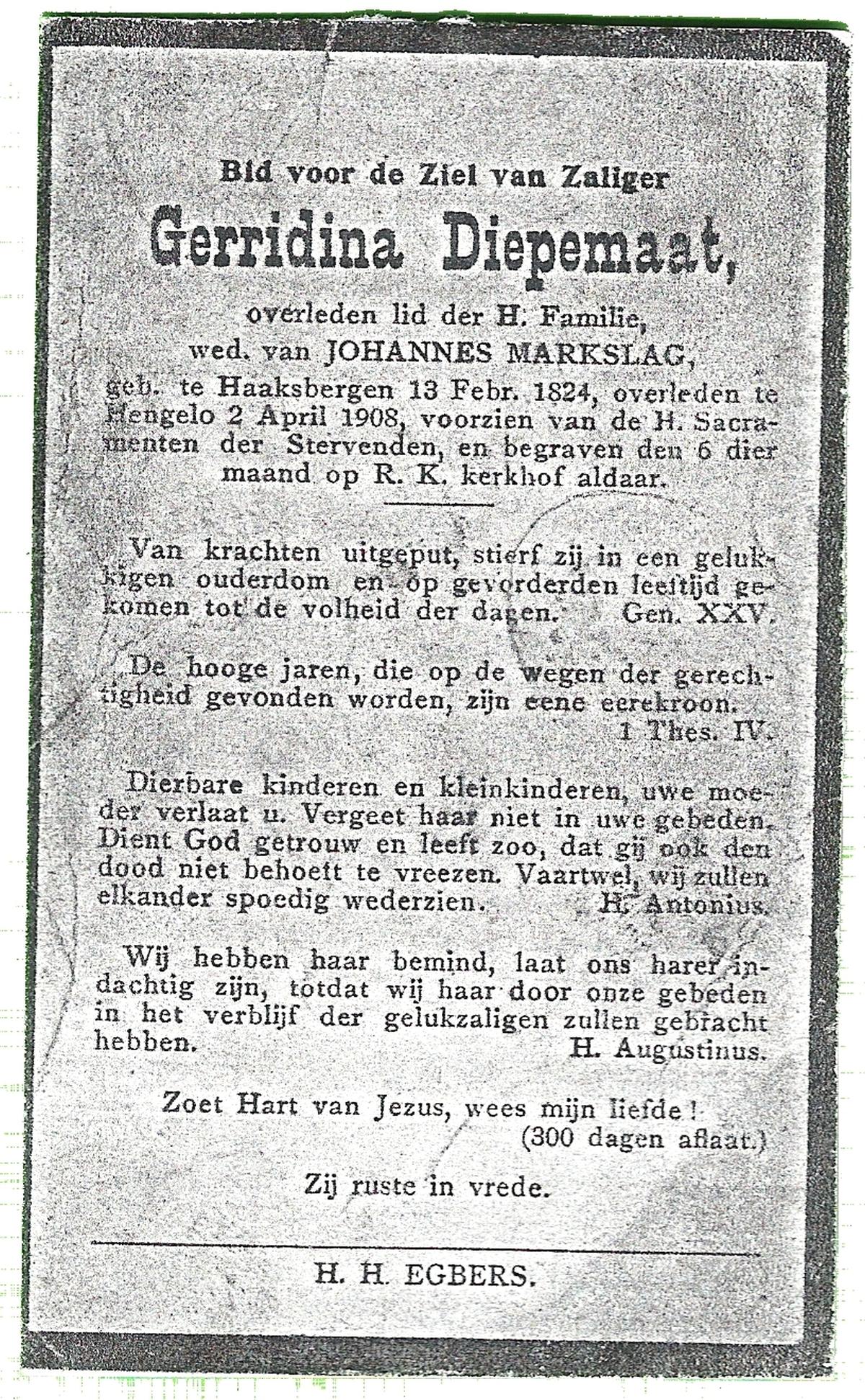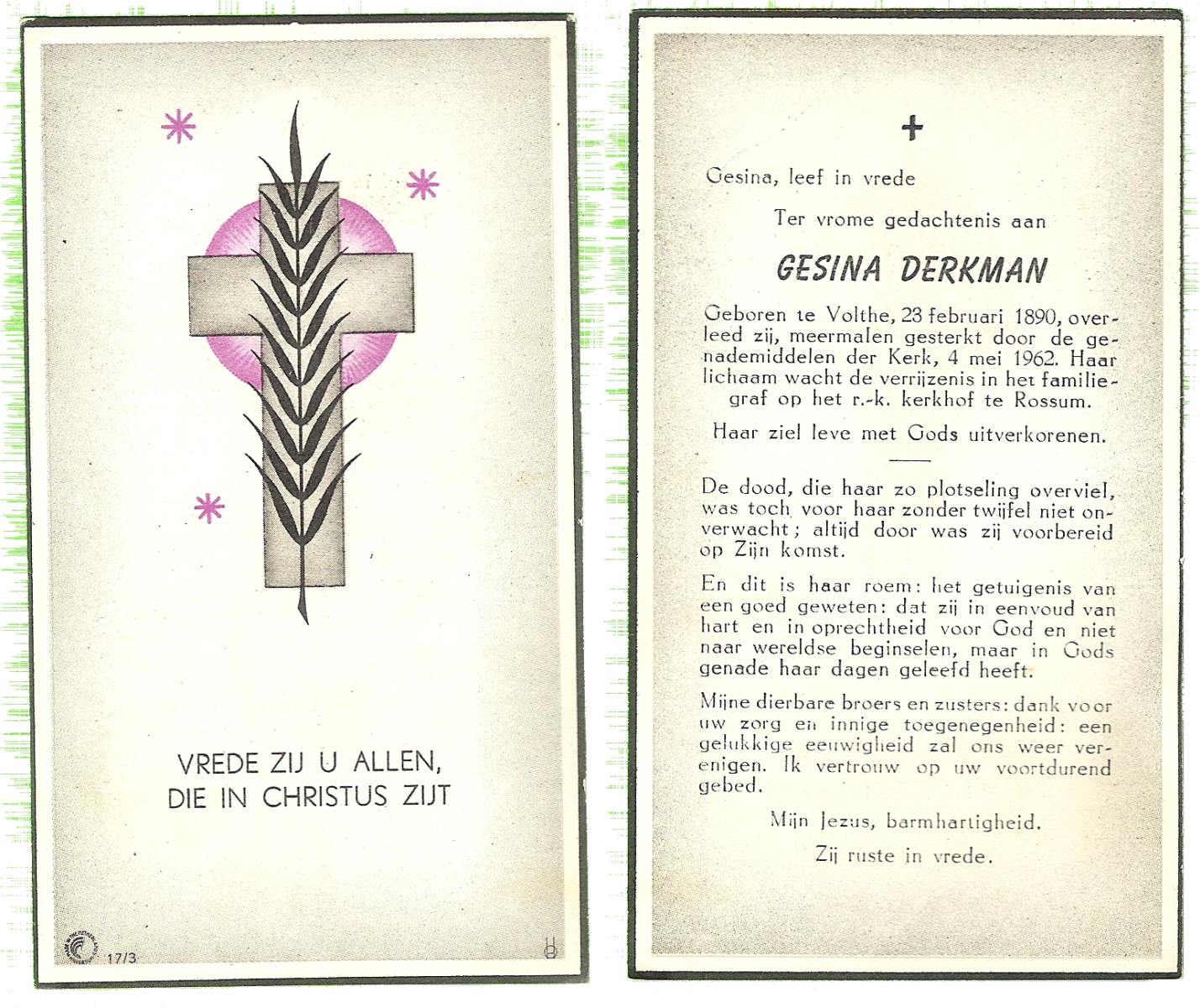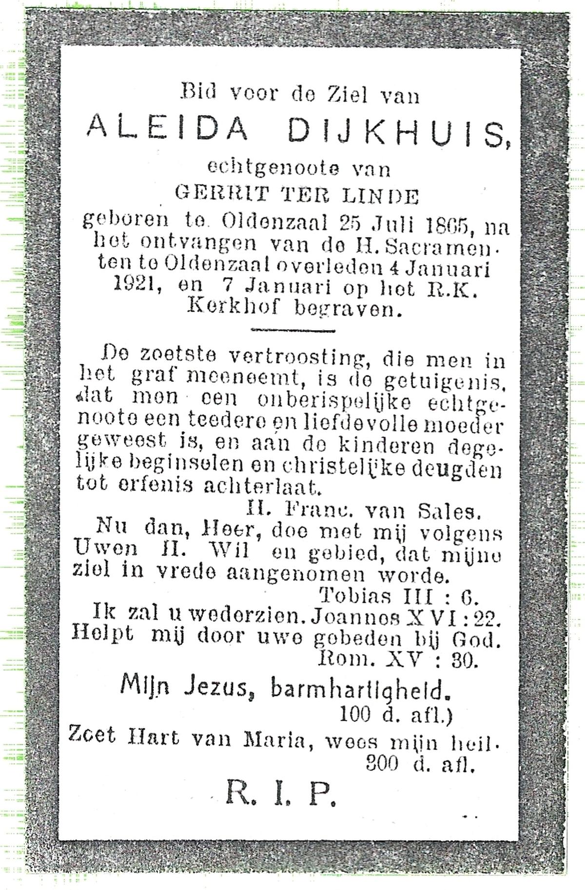 DIRKES, Aleida Geertruida, geboren op 03-05-1875 te Losser, overleden op 1-4-1963 te Losser op 87-jarige leeftijd, begraven op 4-4-1963 te Losser.