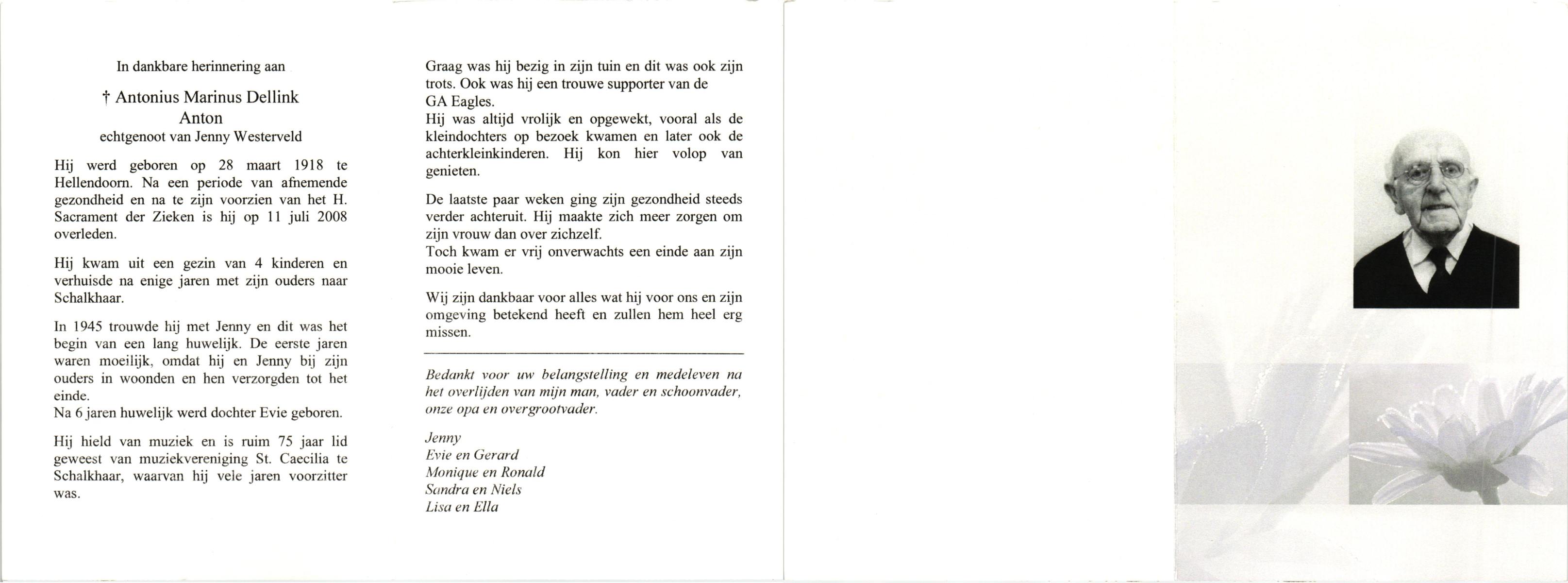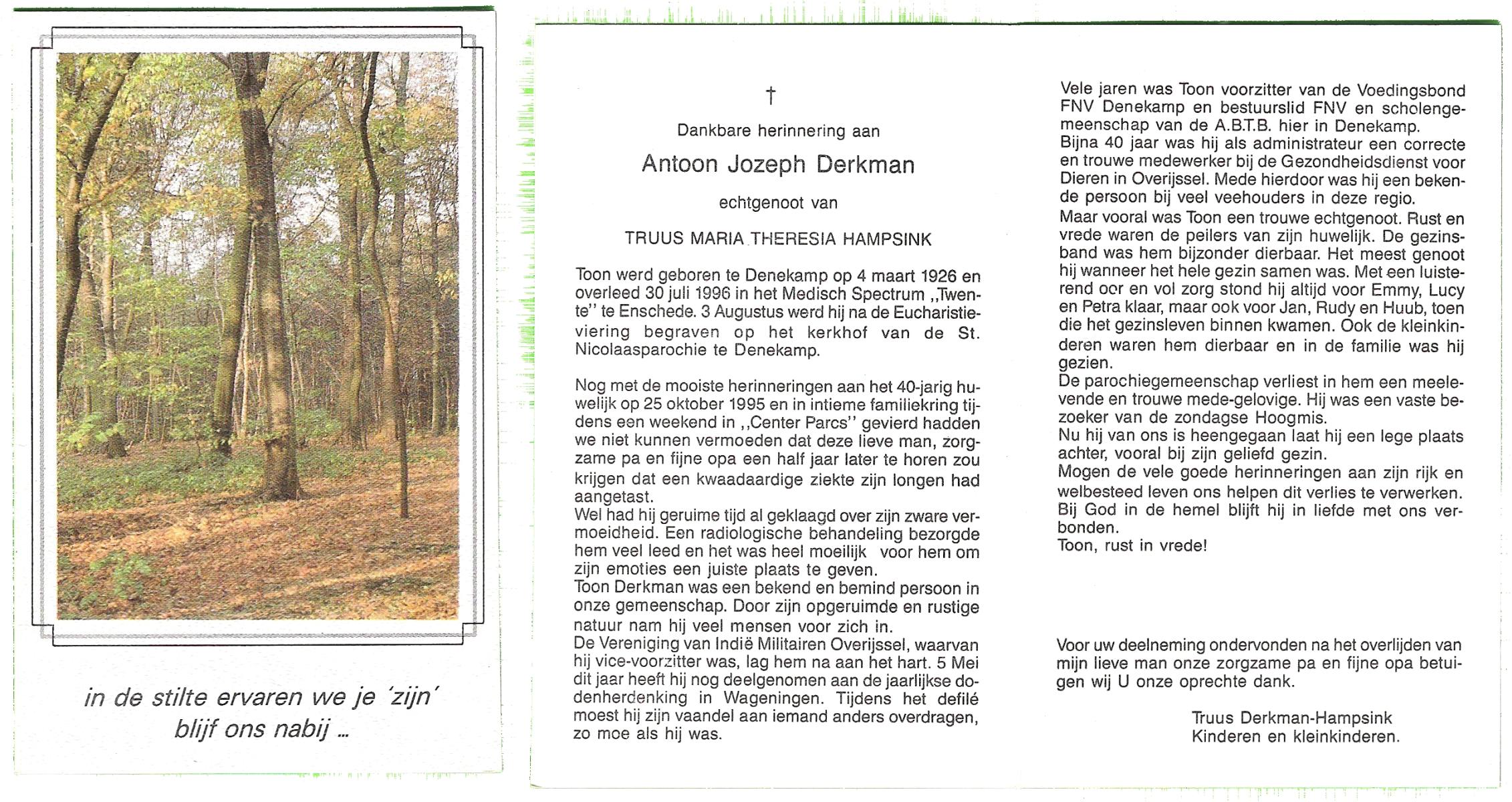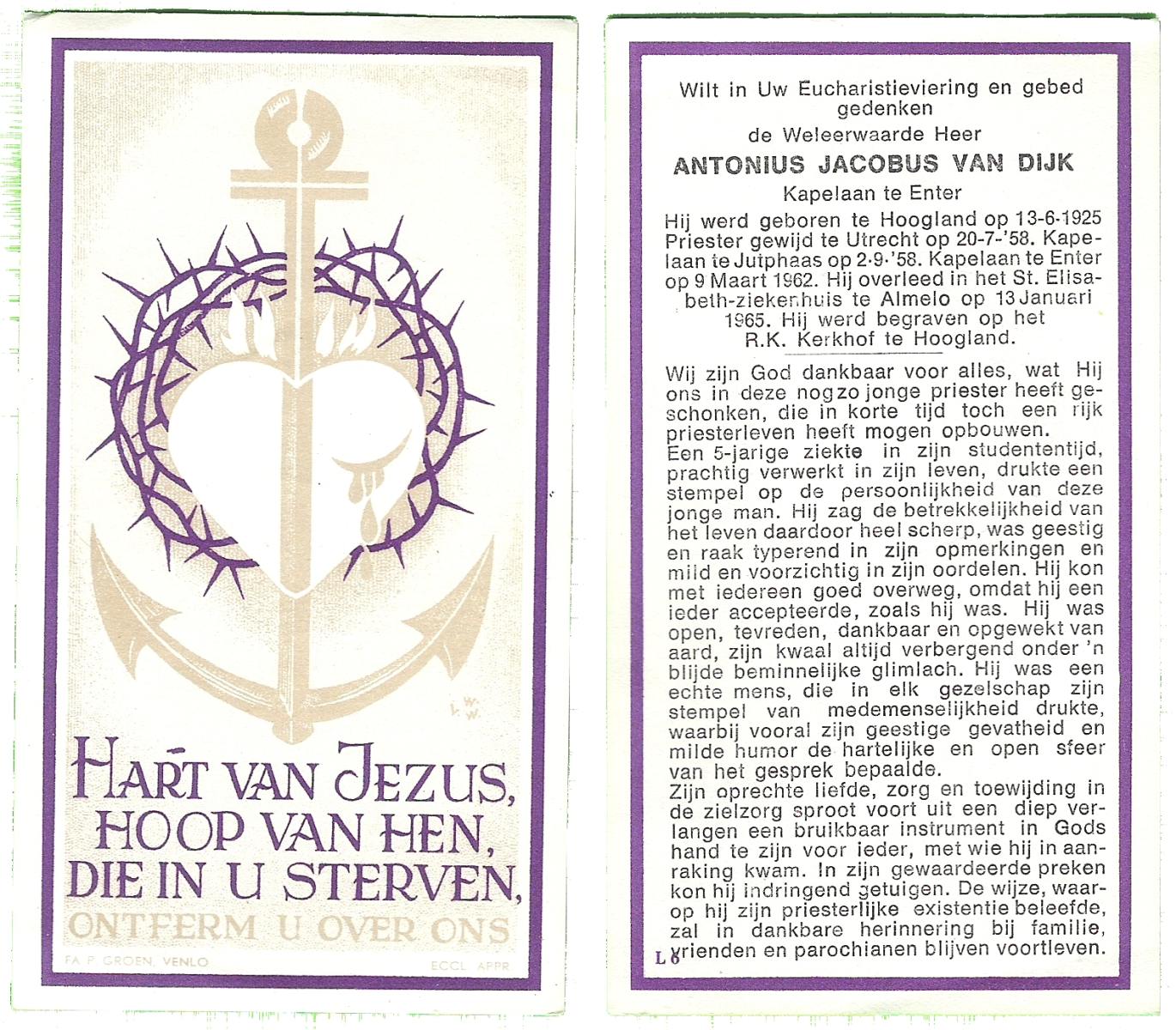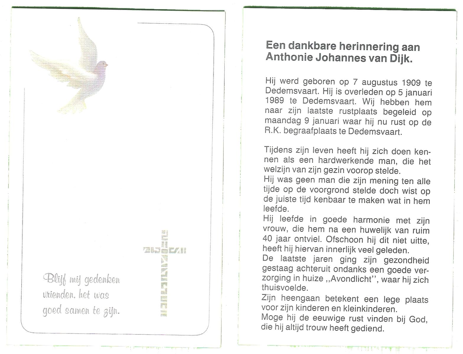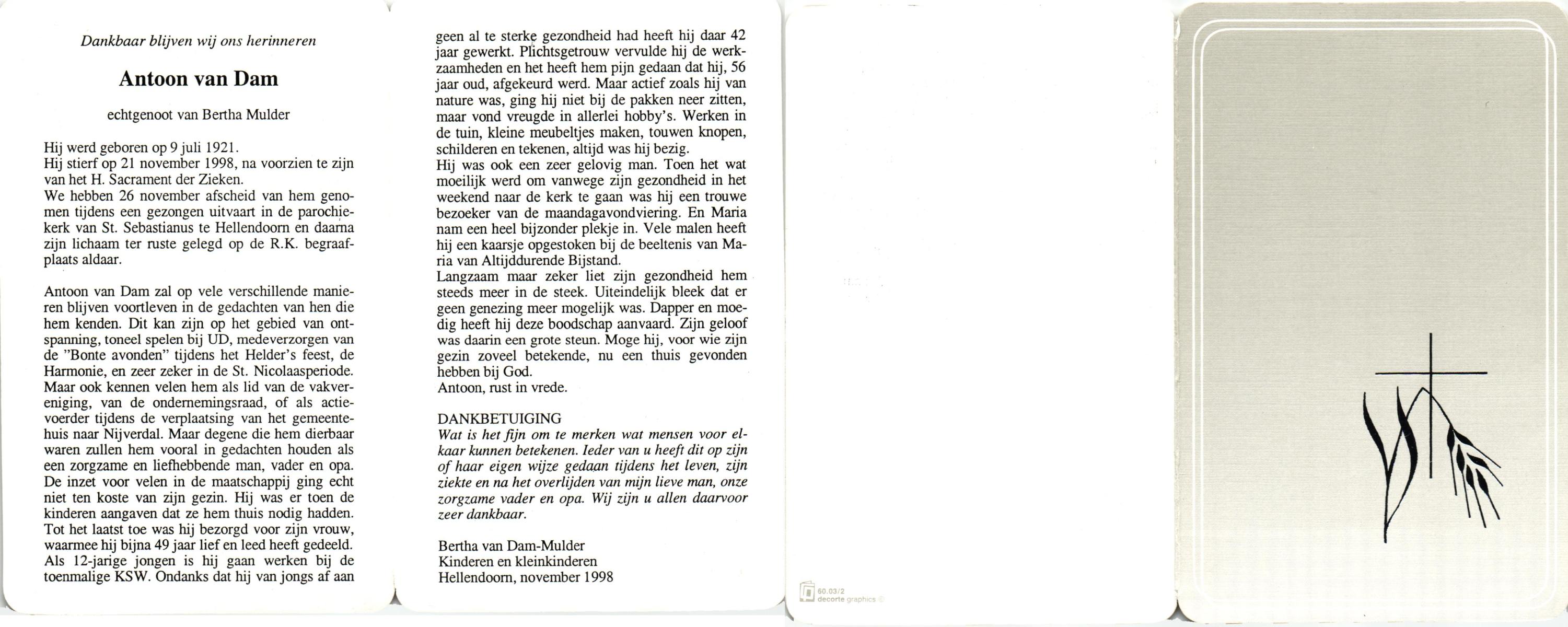 DAM, van, Antoon, geboren op 9-7-1921, overleden op 21-11-1998 op 77-jarige leeftijd, begraven op 26-11-1998 te Hellendoorn, rk.