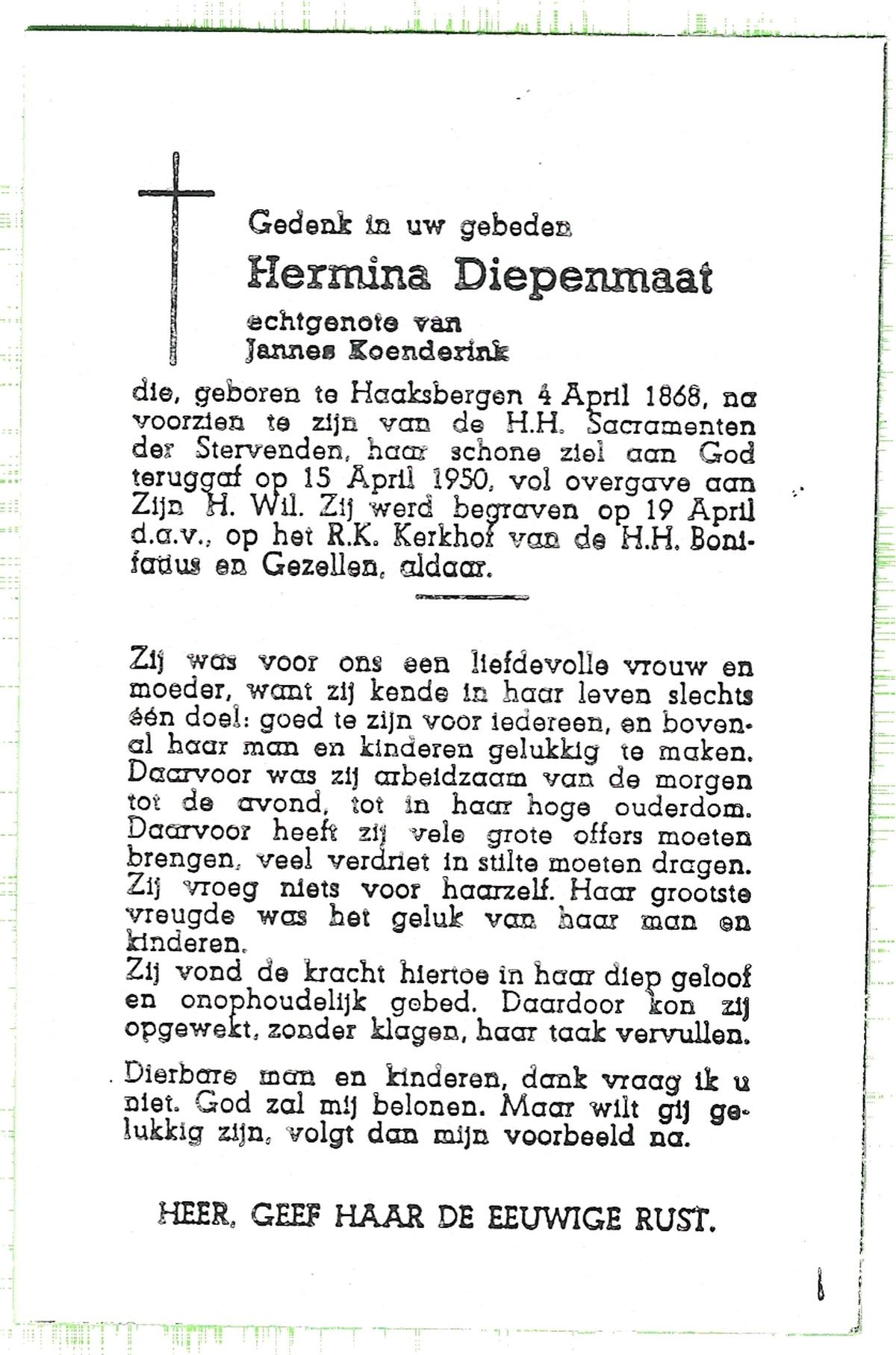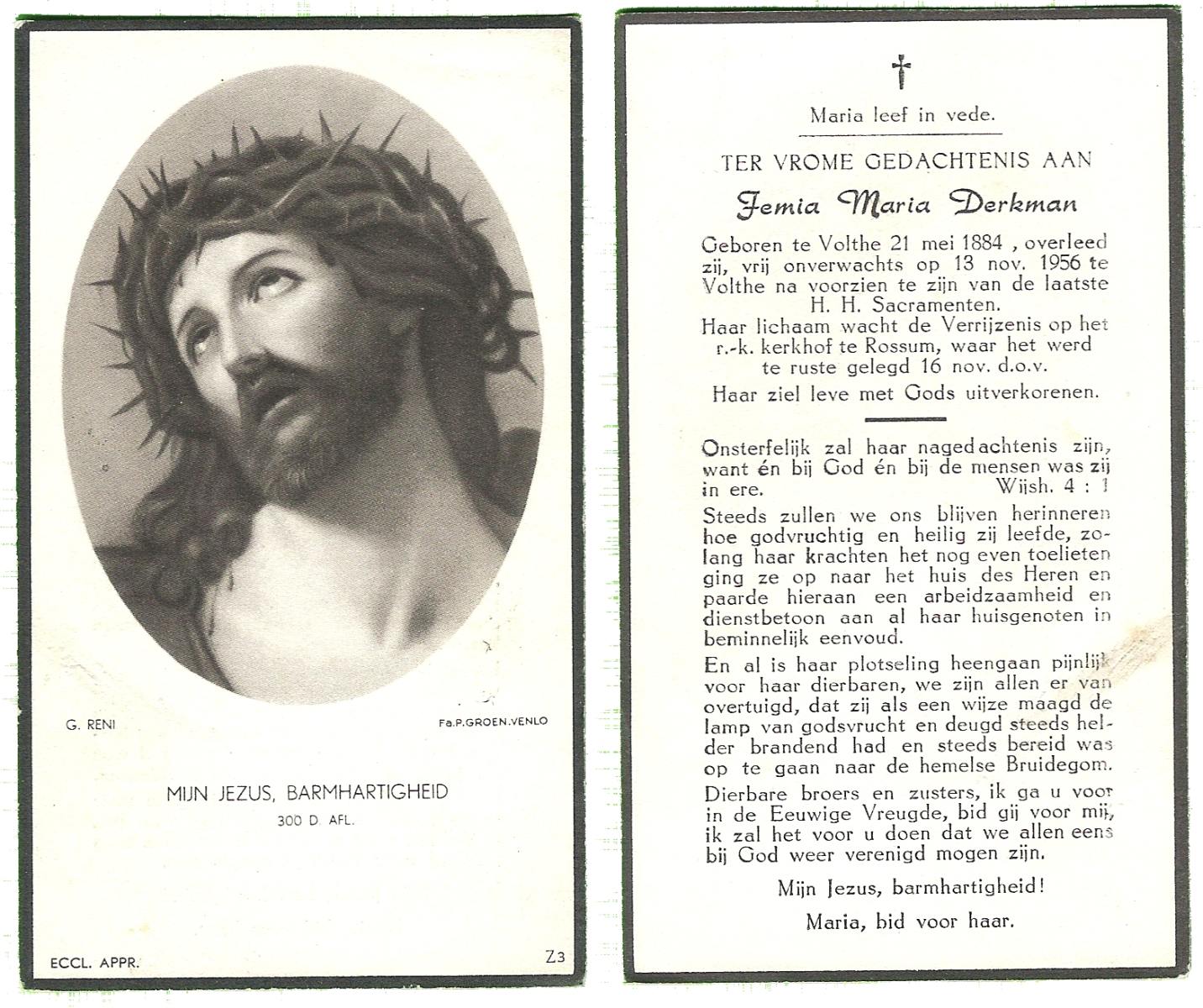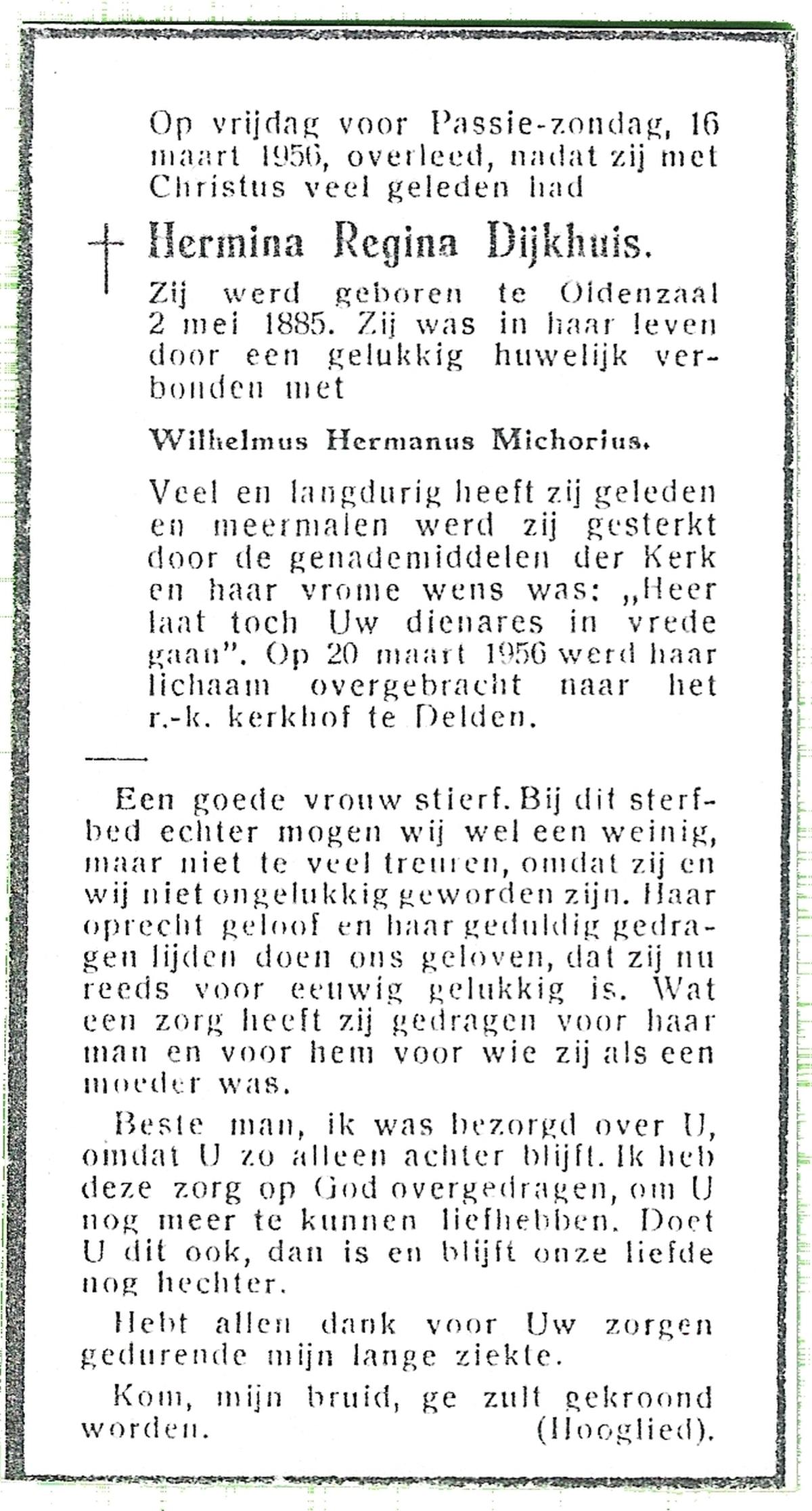 DIJKHUIS, Hermina Regina, geboren op 02-05-1885 te Oldenzaal op 70-jarige leeftijd, begraven op 20-3-1956 te Delden.