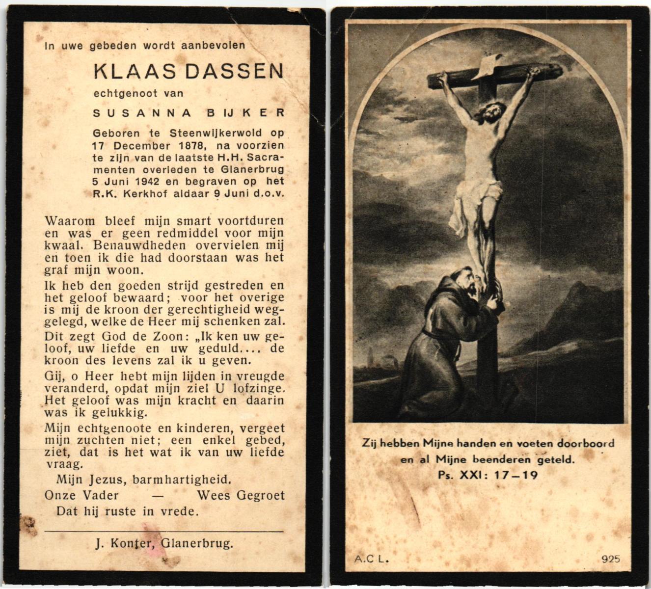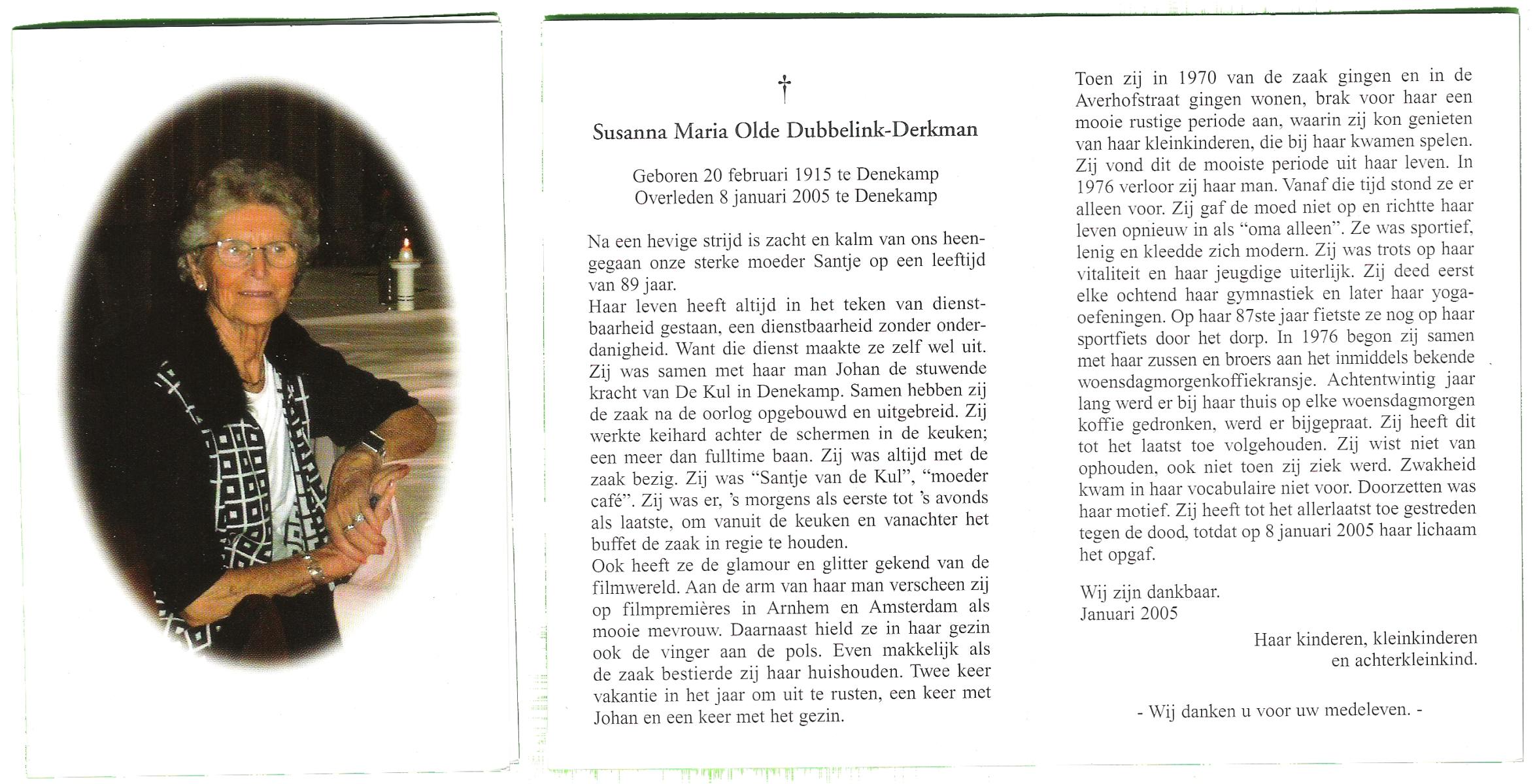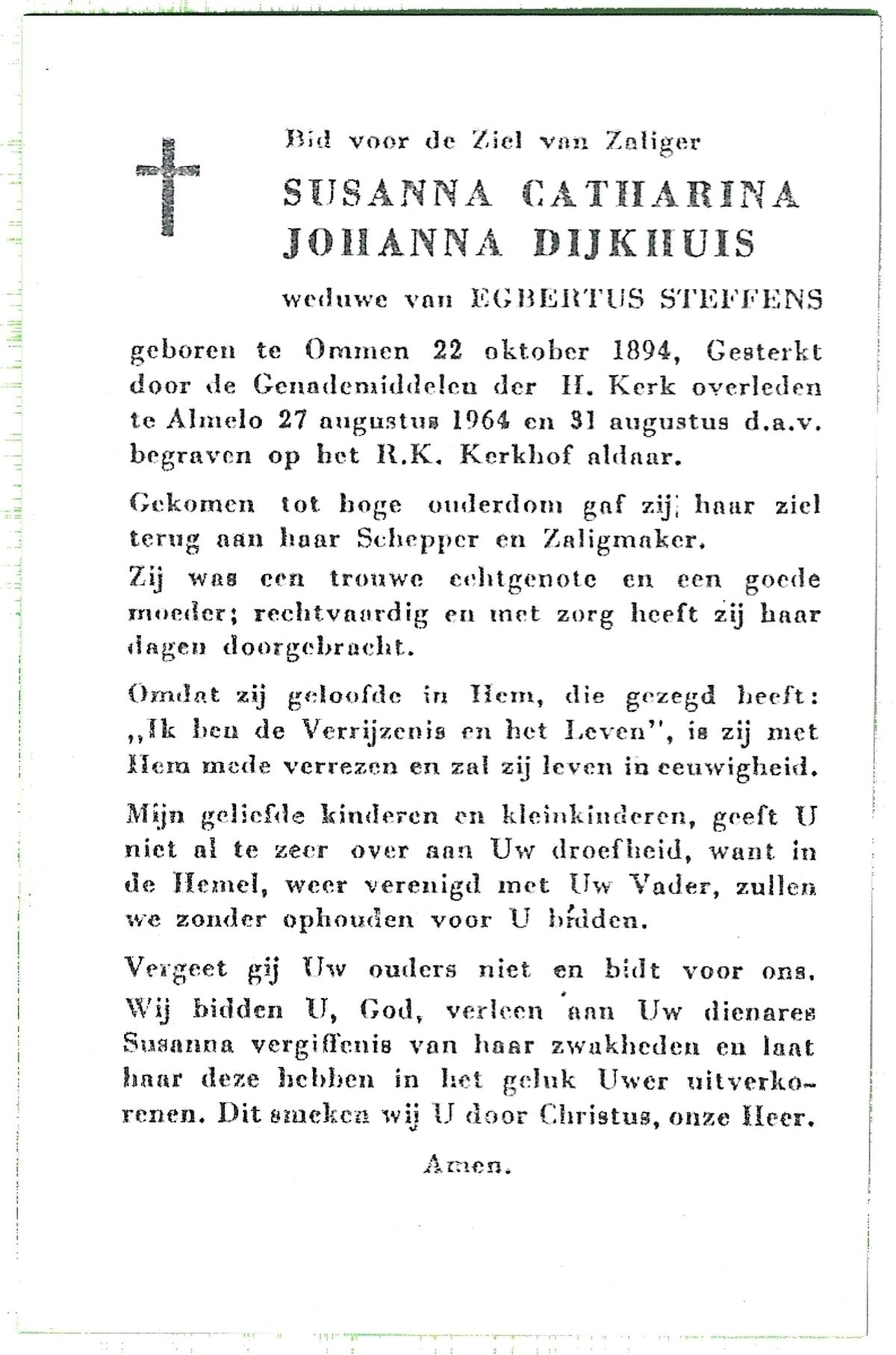 DIJKHUIS, Susanna Catharina Johanna, geboren op 22-10-1894 te Ommen, overleden op 27-8-1964 te Almelo op 69-jarige leeftijd, begraven op 31-8-1964 te Almelo.