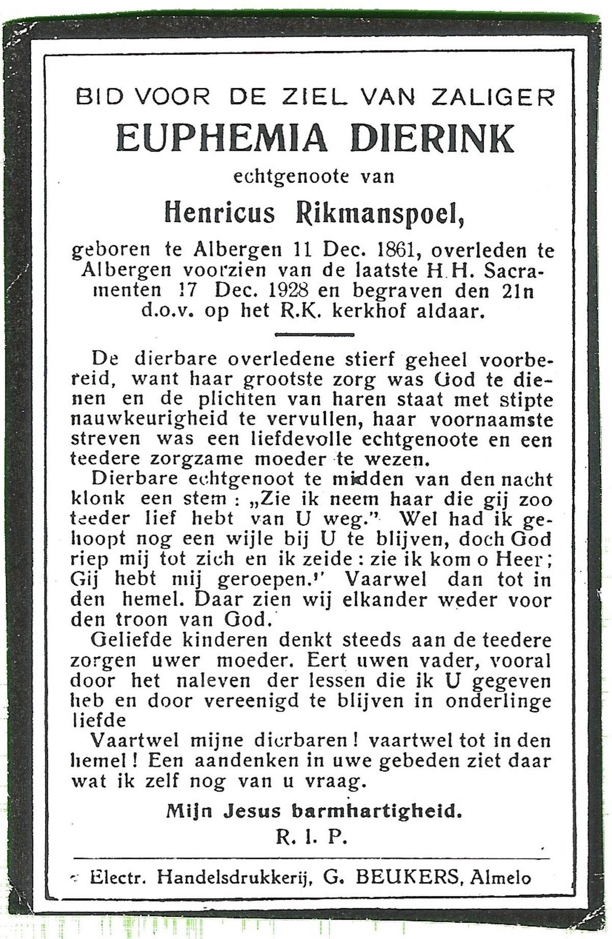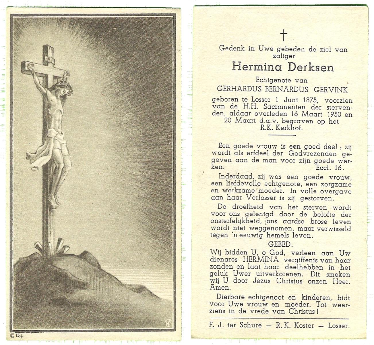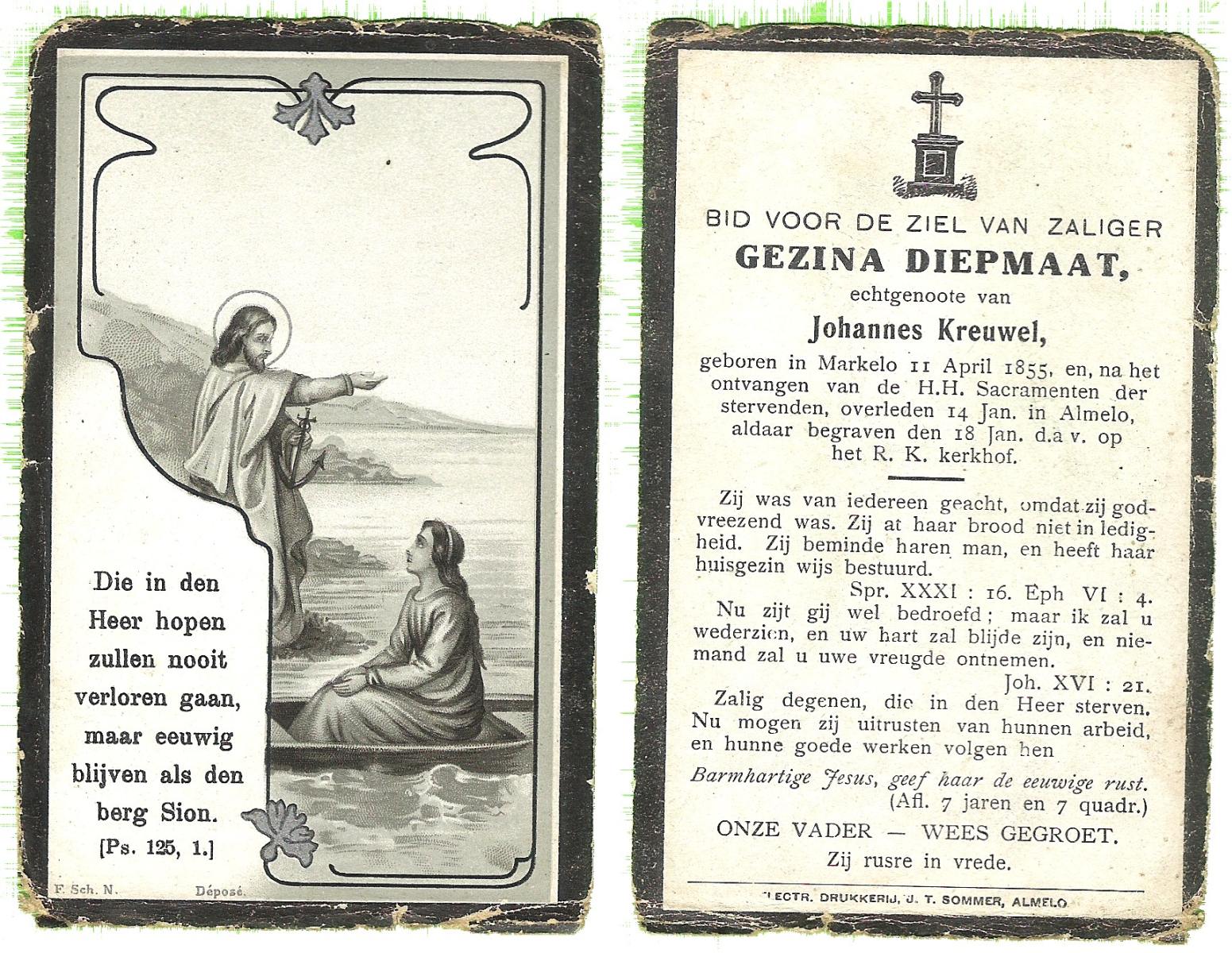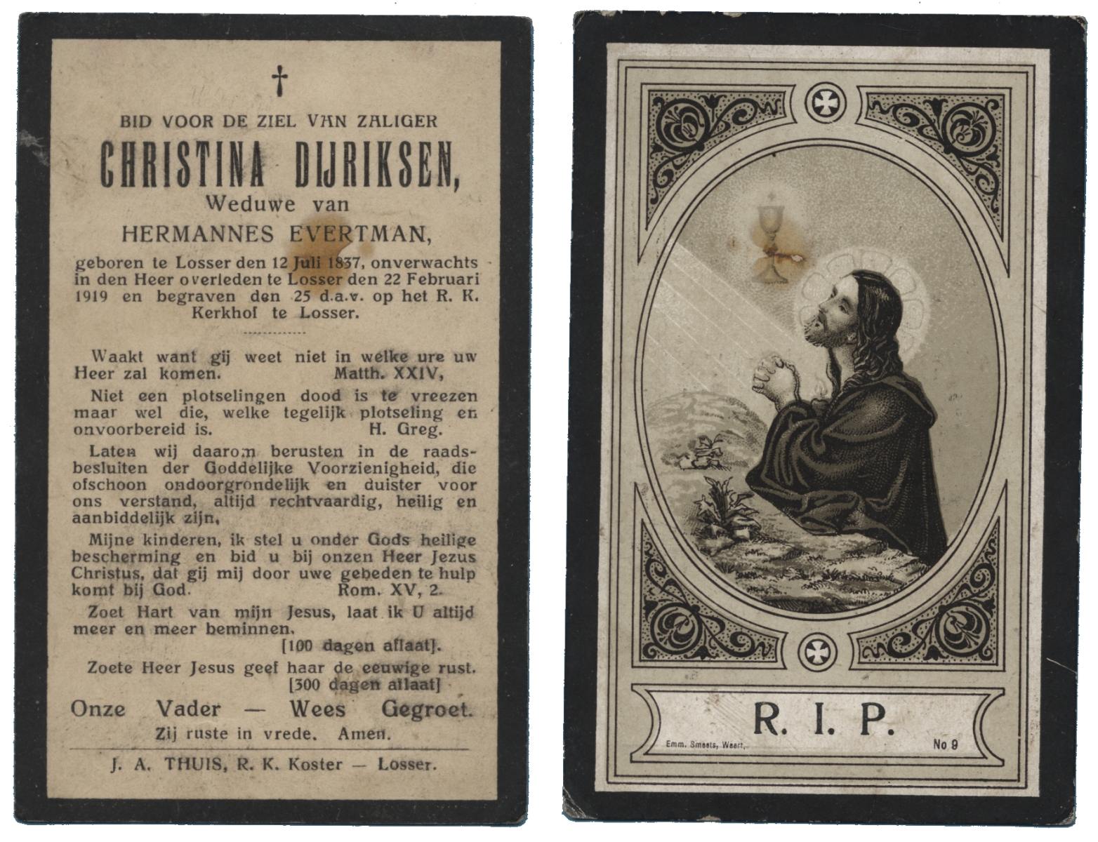 DIJRIKSEN, Christina, geboren op 12-07-1837 te Losser, overleden op 22-2-1919 te Losser op 81-jarige leeftijd, begraven op 25-2-1919 te Losser.