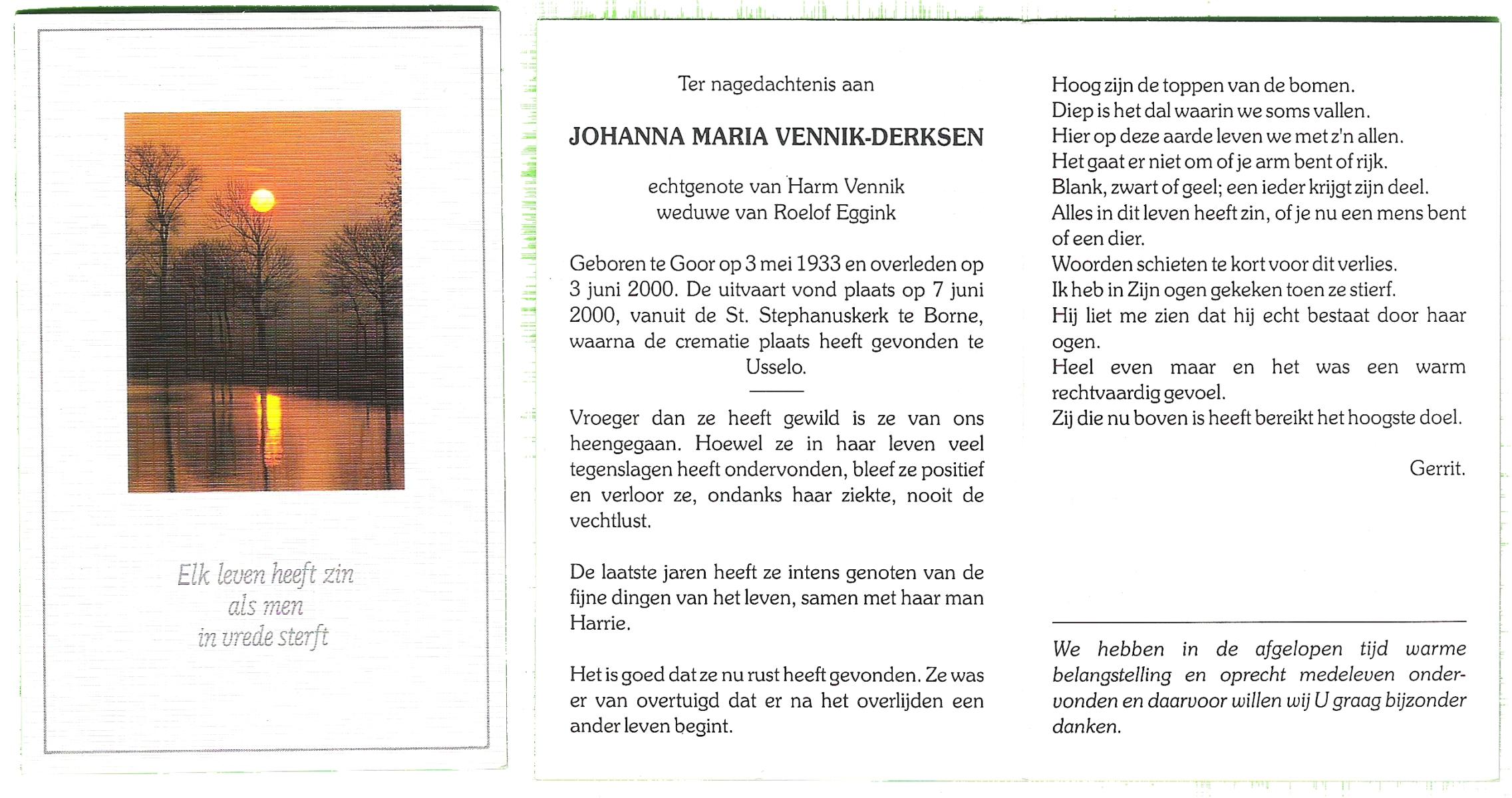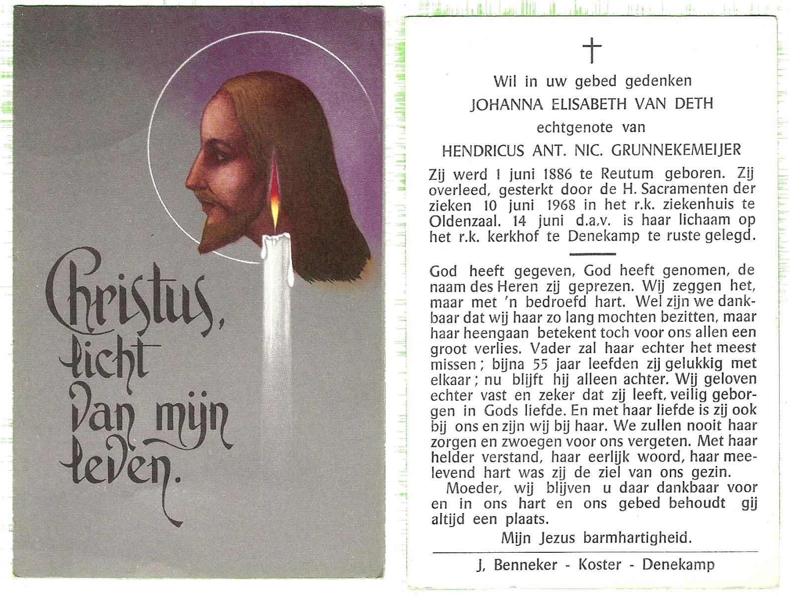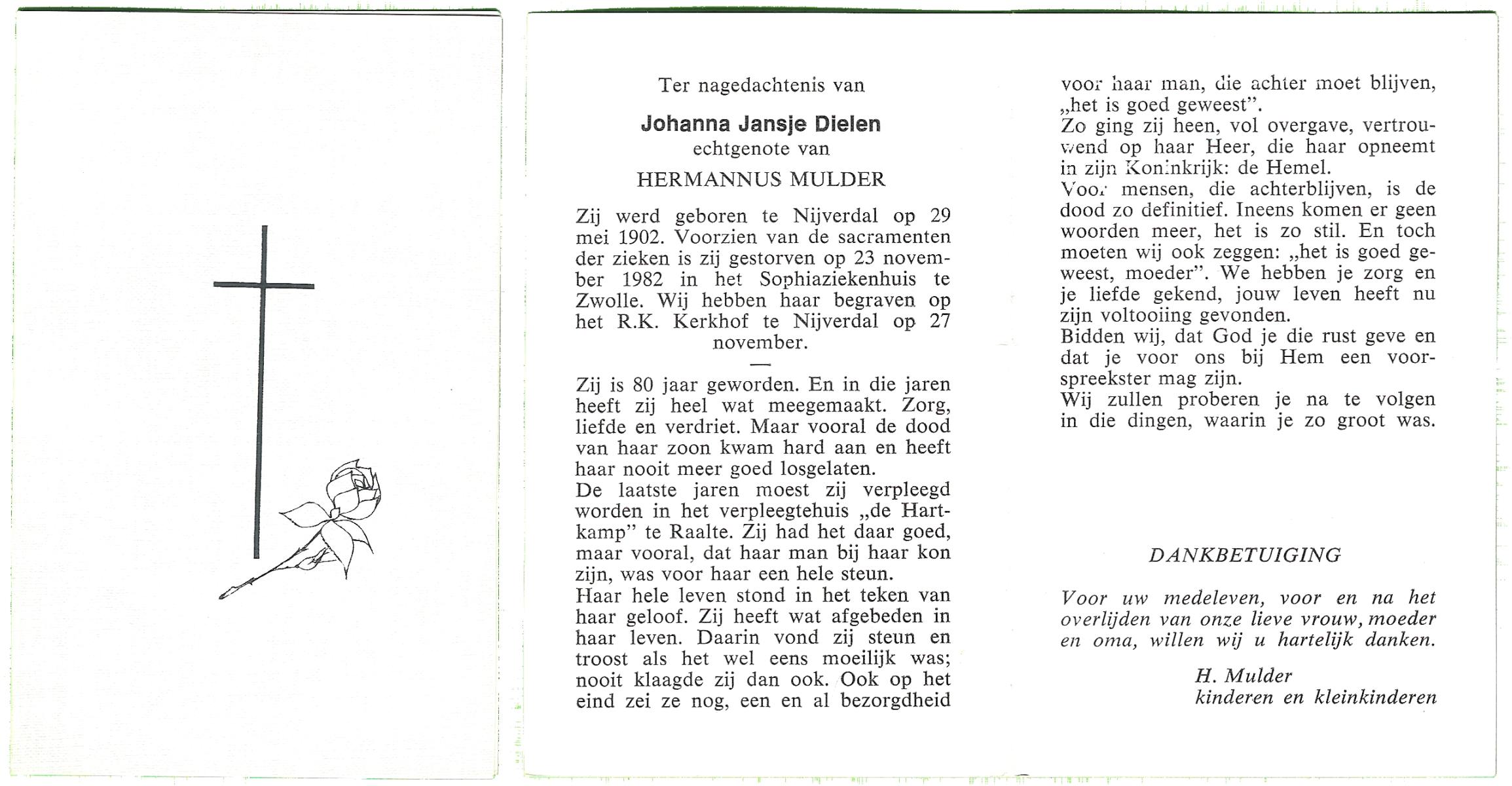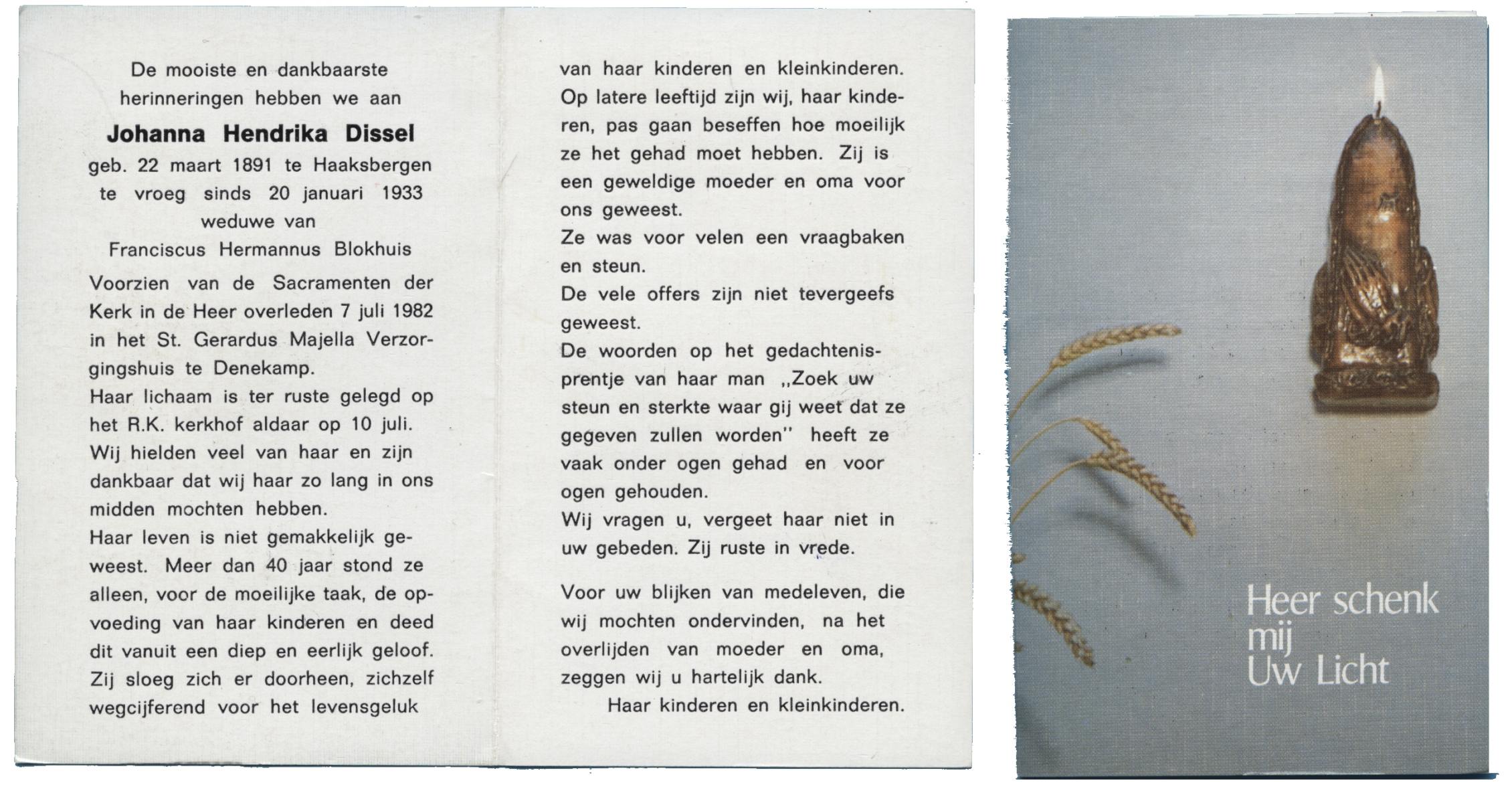 DISSEL, Johanna Hendrika, geboren op 22-03-1891 te Haaksbergen, overleden op 7-7-1982 te Denekamp op 91-jarige leeftijd, begraven op 10-7-1982 te Denekamp.