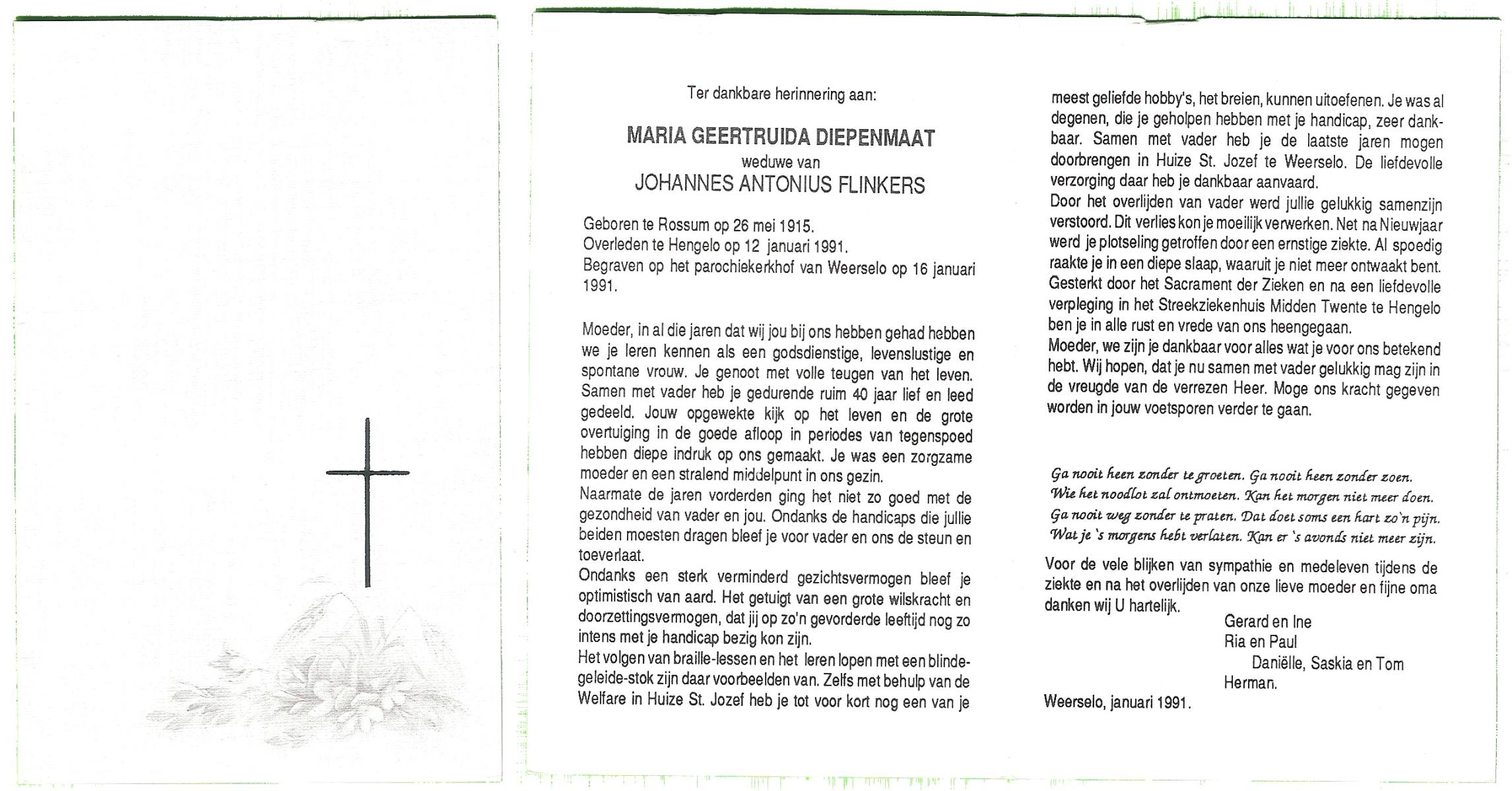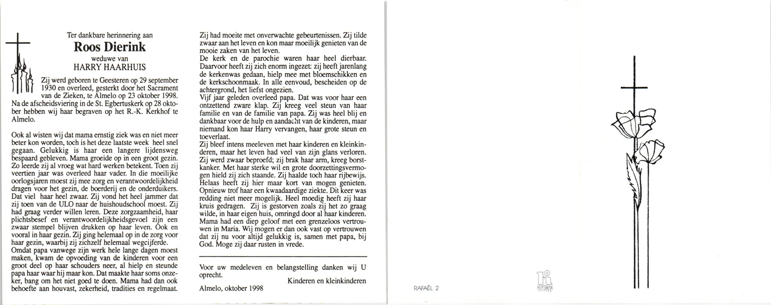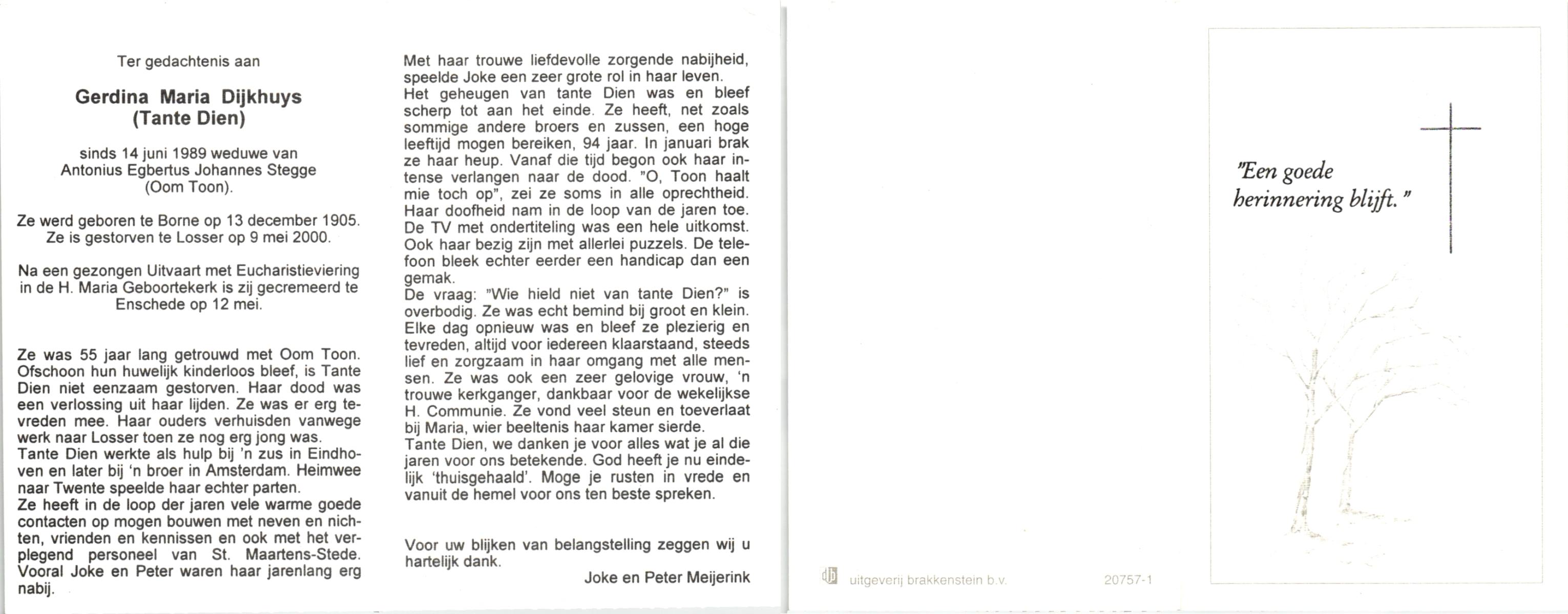 DIJKHUYS, , Gerdina Maria, geboren op 13-12-1905 te Borne, overleden op 9-5-2000 te Losser op 94-jarige leeftijd, gecremeerd op 12-5-2000 te Usselo.