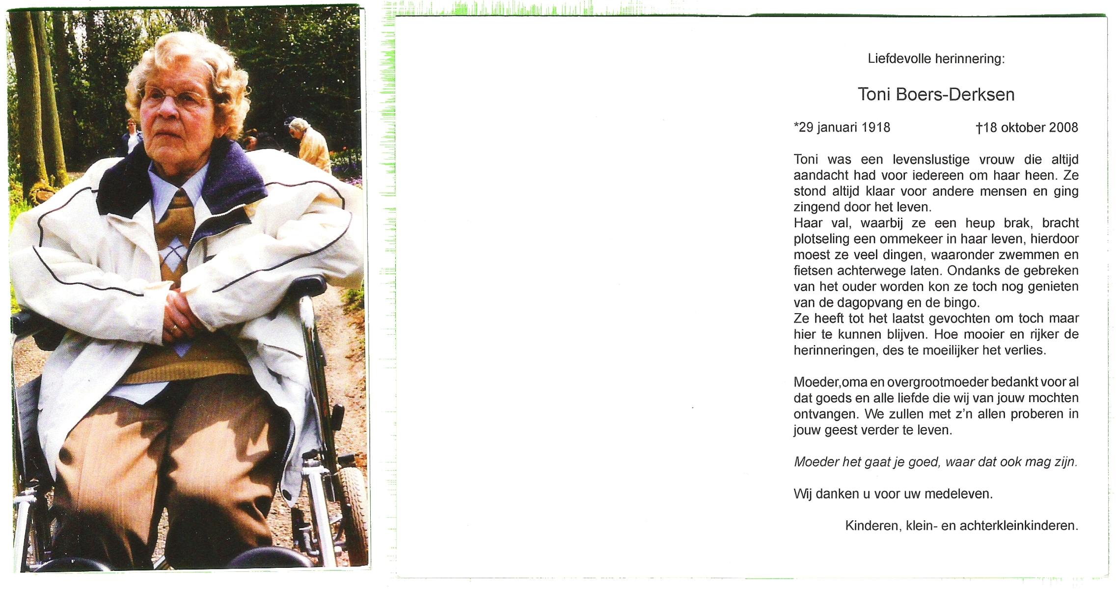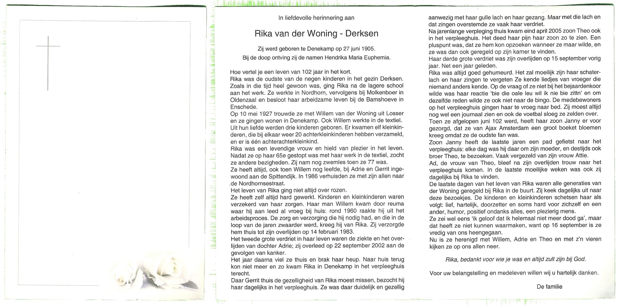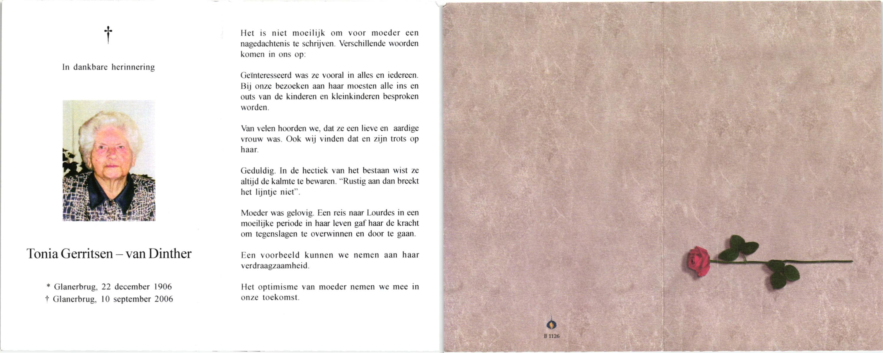DINTHER, van, Tonia, geboren op 22-12-1906 te Glanerbrug, overleden op 10-9-2006 te Glanerbrug op 99-jarige leeftijd.