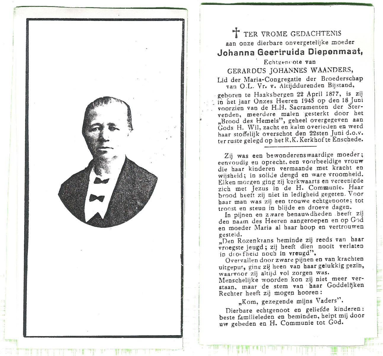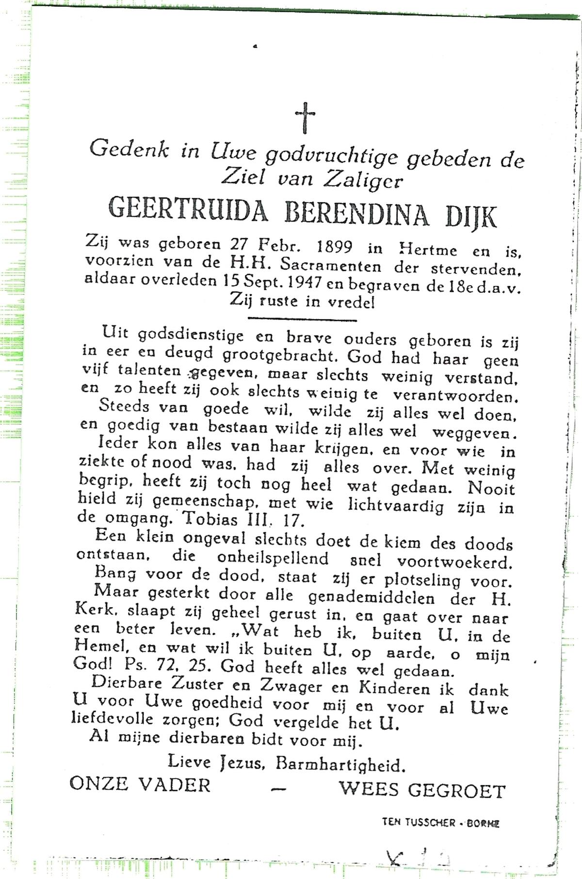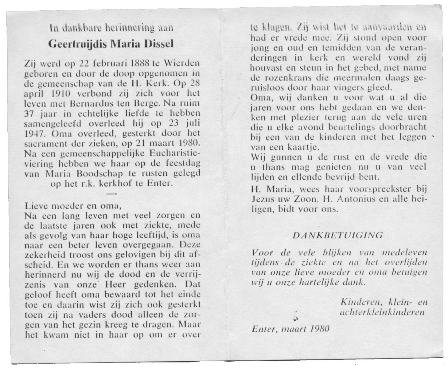 DISSEL, Geertruijdis Maria, geboren op 22-02-1888 te Wierden, overleden op 21-3-1980 op 92-jarige leeftijd, begraven te Enter.