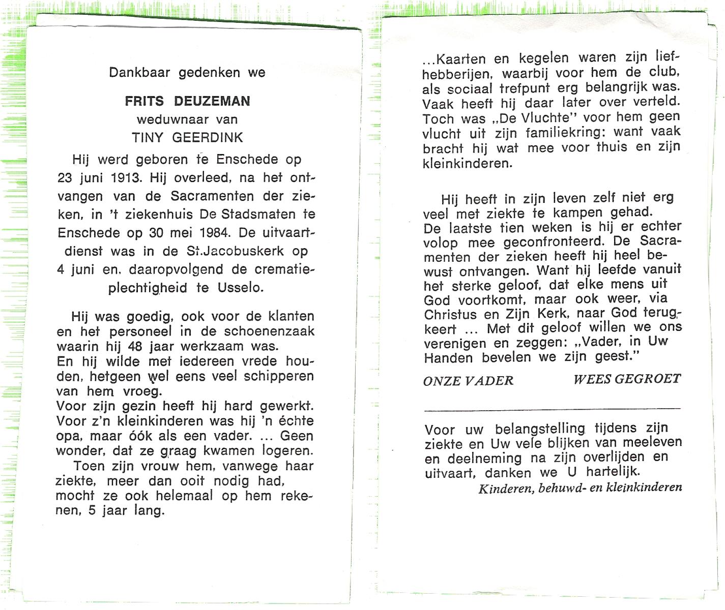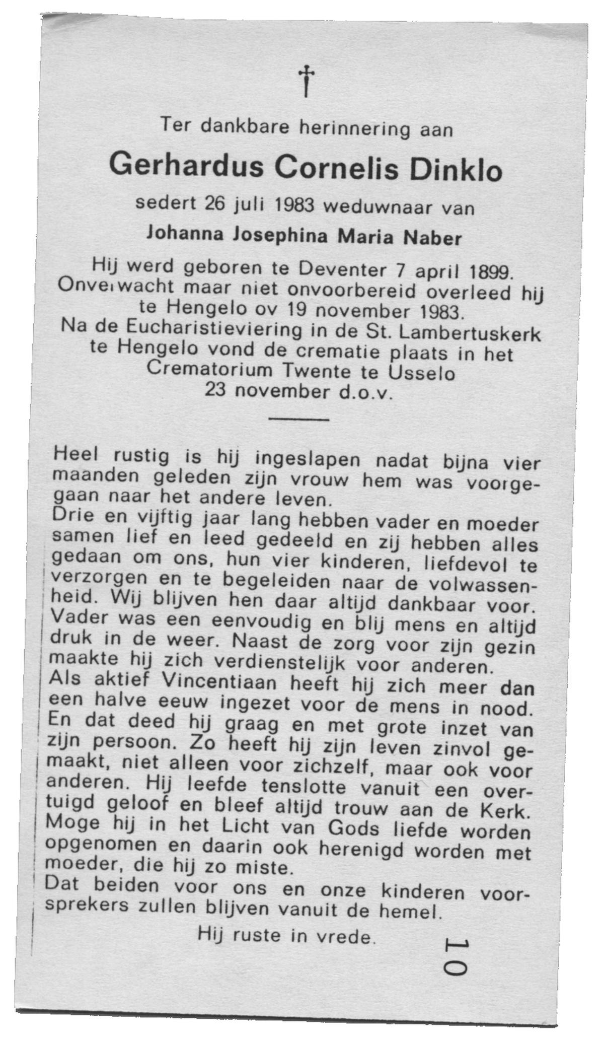 DINKLO, Gerhardus Cornelis, geboren op 07-04-1899 te Deventer, overleden op 19-11-1983 te Hengelo (Ov.) op 84-jarige leeftijd, gecremeerd op 23-11-1983 te Usselo.