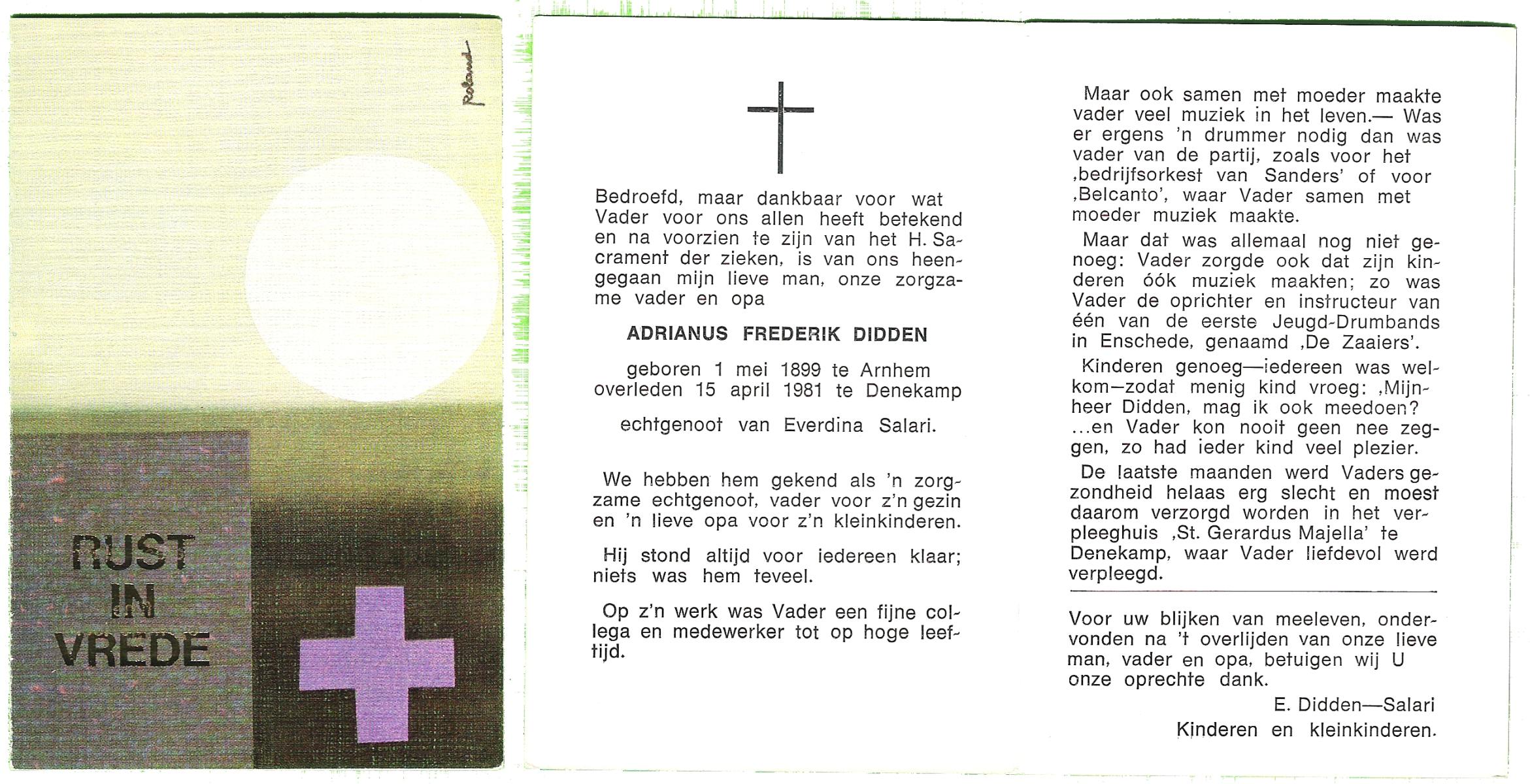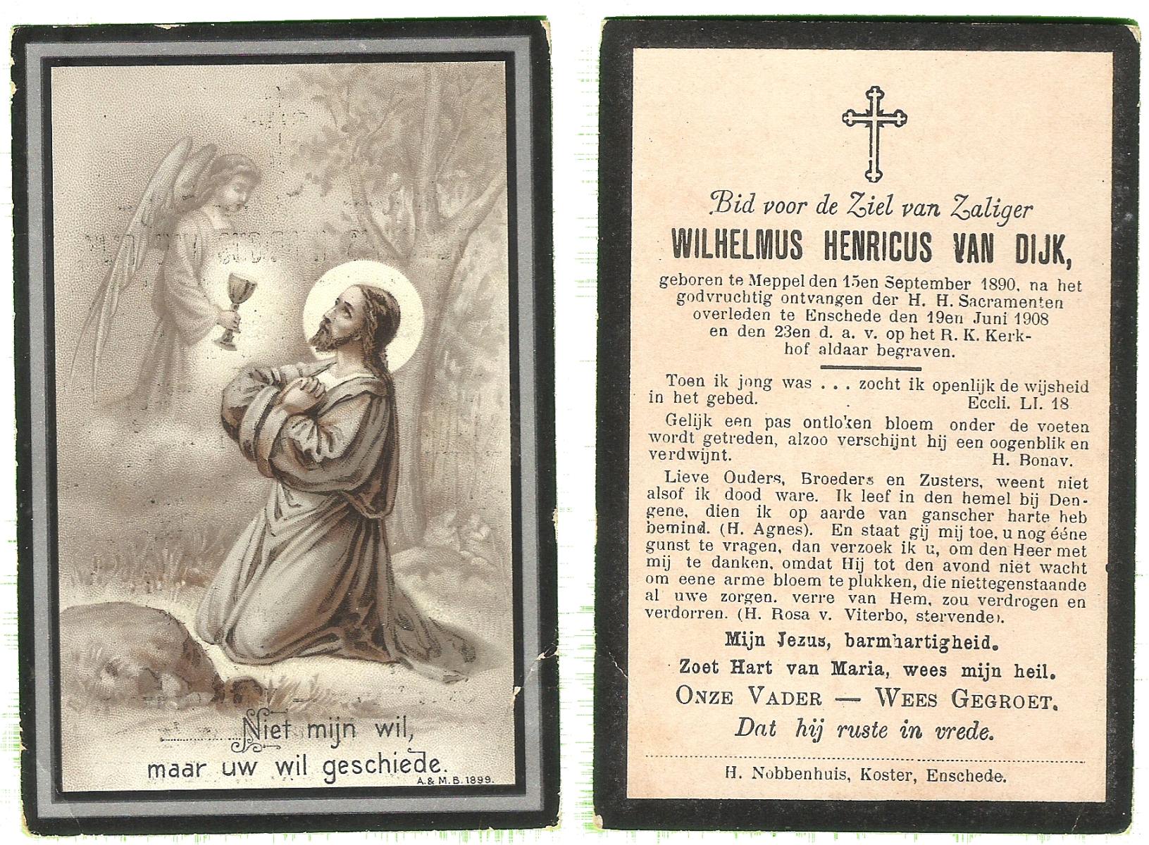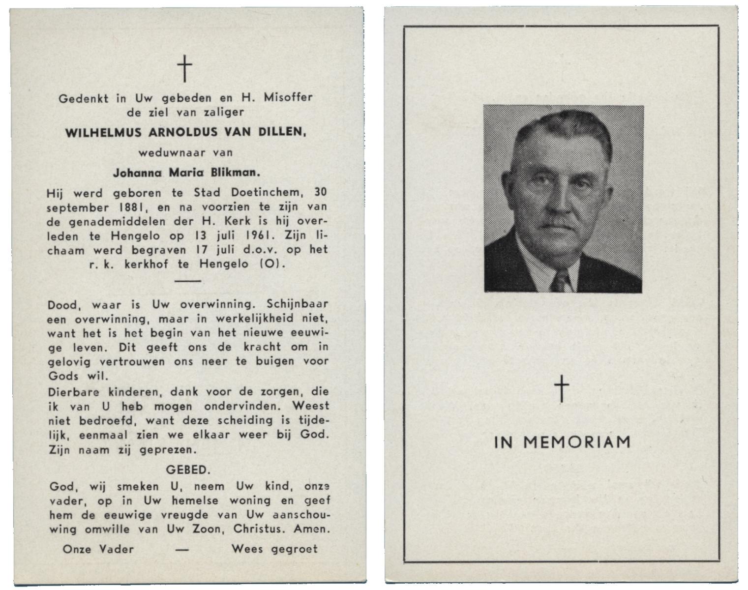 DILLEN, van, Wilhelmus Arnoldus, geboren op 30-09-1881 te Doetinchem, Stad, overleden op 13-7-1961 te Hengelo (Ov.) op 79-jarige leeftijd, begraven op 17-7-1961 te Hengelo (Ov.).