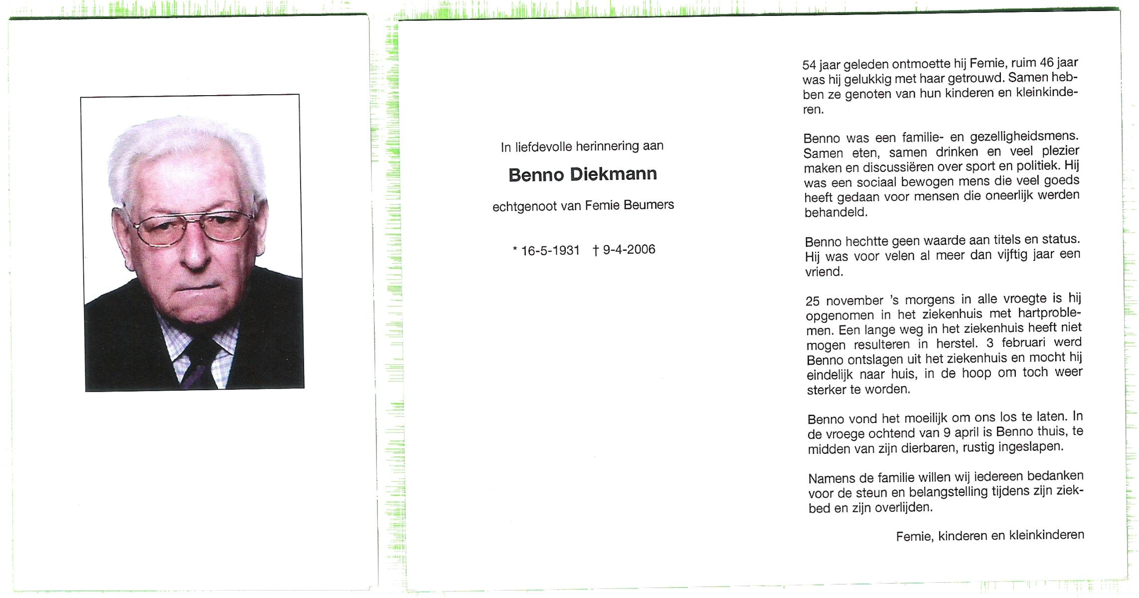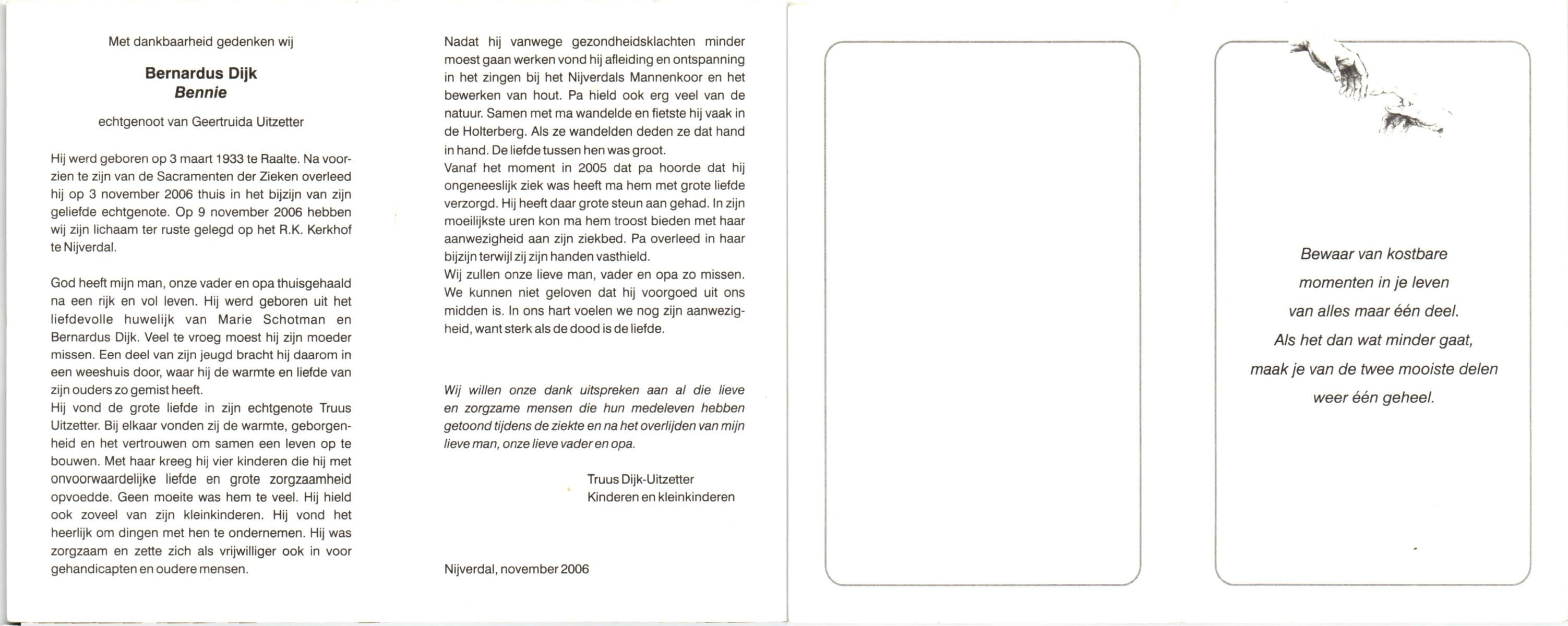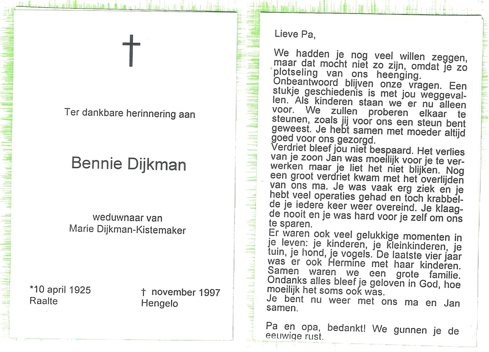 DIJKMAN, Bennie, geboren op 10-4-1925 te Raalte, overleden op 00-11-1997 te Hengelo (Ov.) op 72-jarige leeftijd.