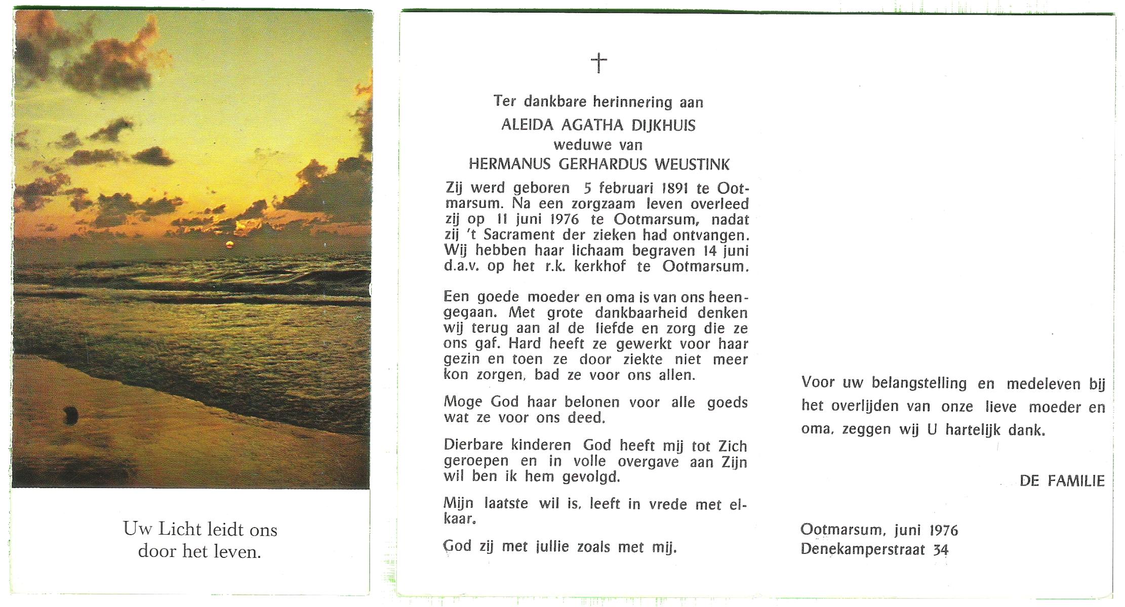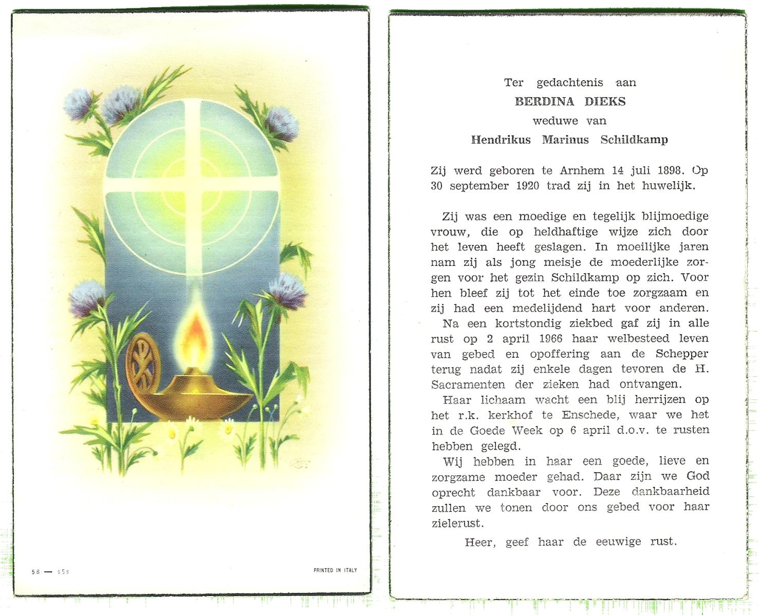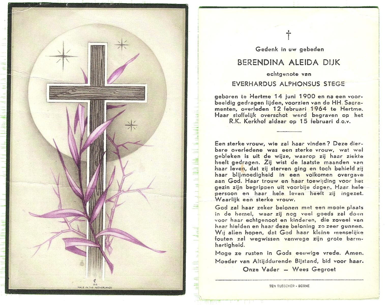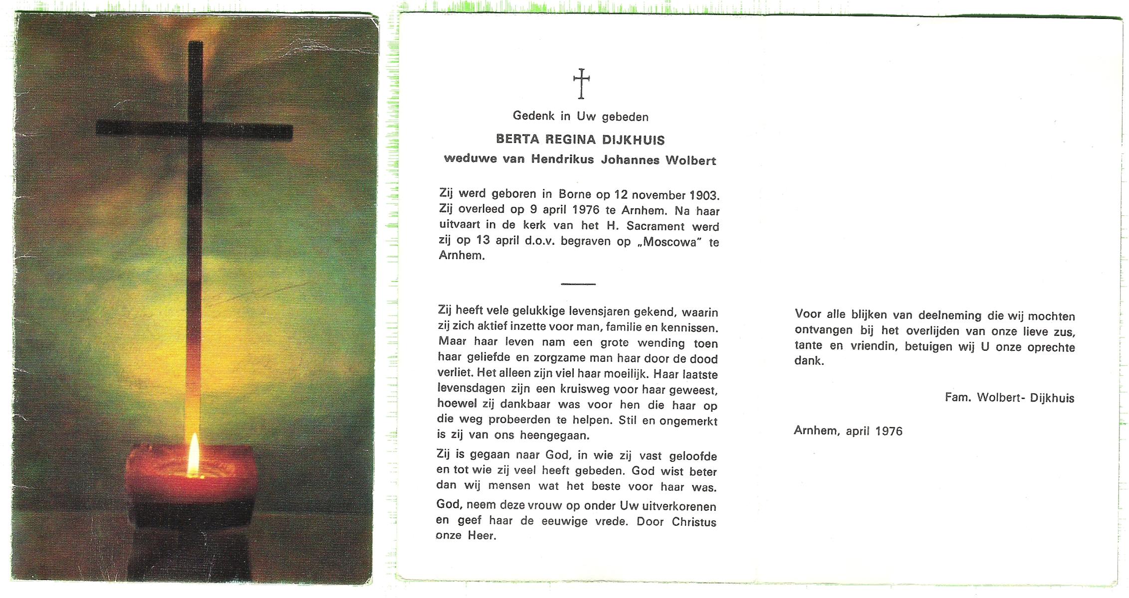 DIJKHUIS, Bertha Regina, geboren op 12-11-1903 te Borne, overleden op 9-4-1976 te Arnhem op 72-jarige leeftijd, begraven op 13-4-1976 te Arnhem r.k.begraafplaats Moscowa.