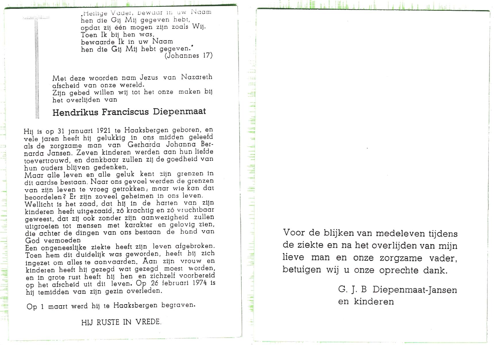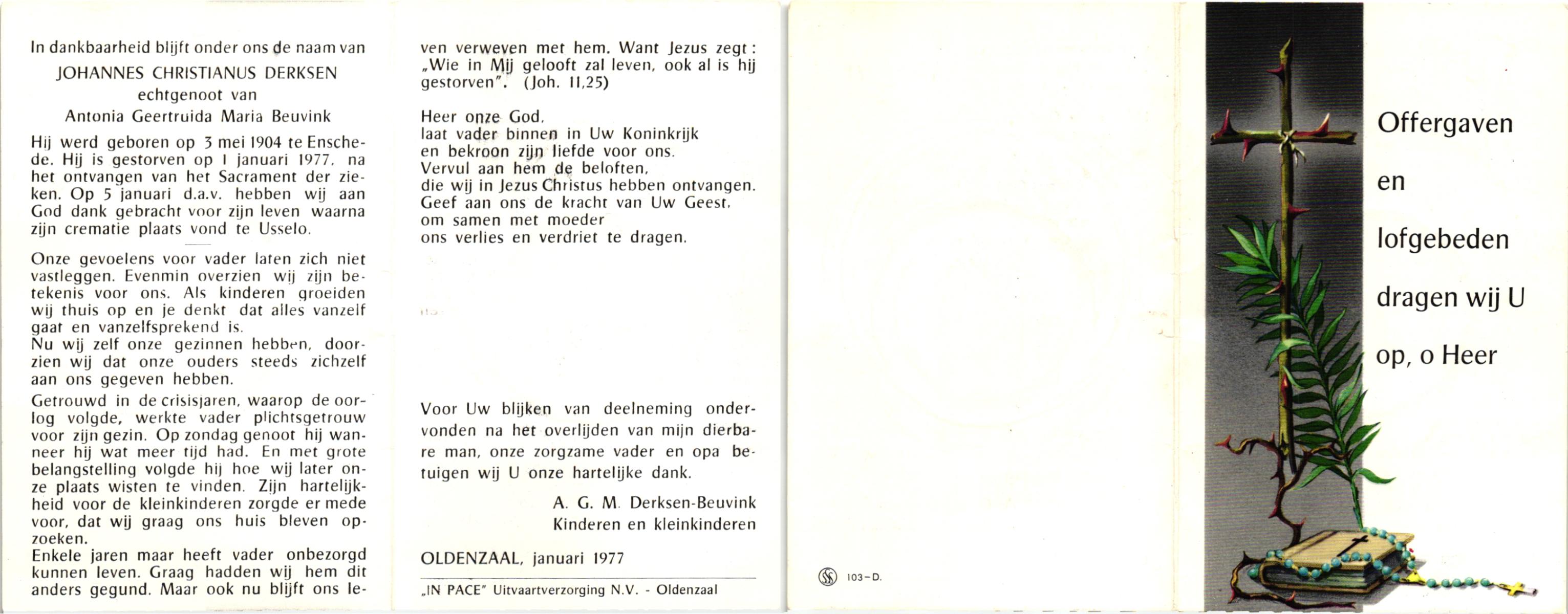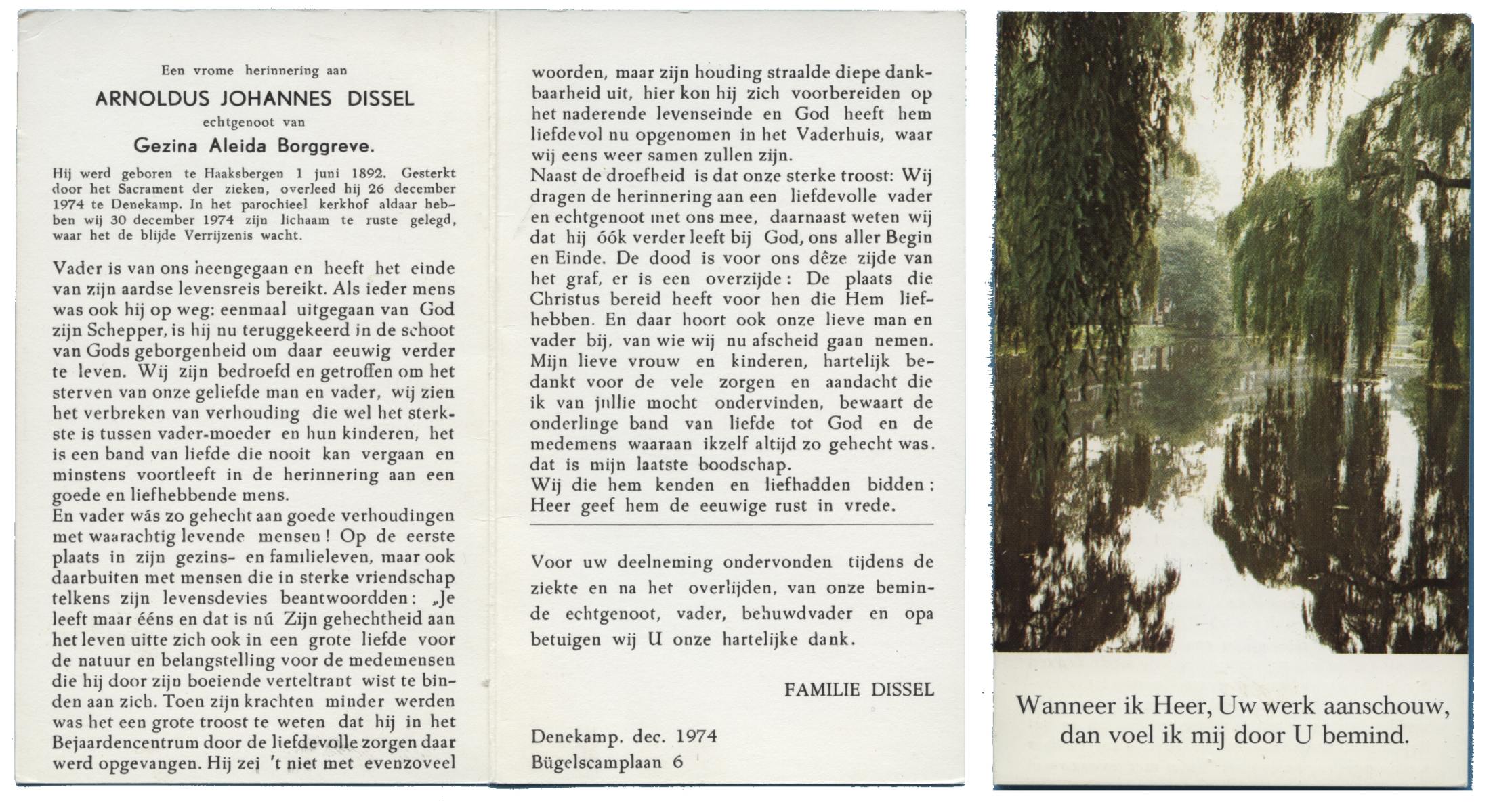 DISSEL, Arnoldus Johannes, geboren op 01-06-1892 te Haaksbergen, overleden op 26-12-1974 te Denekamp op 82-jarige leeftijd, begraven op 30-12-1974 te Denekamp.