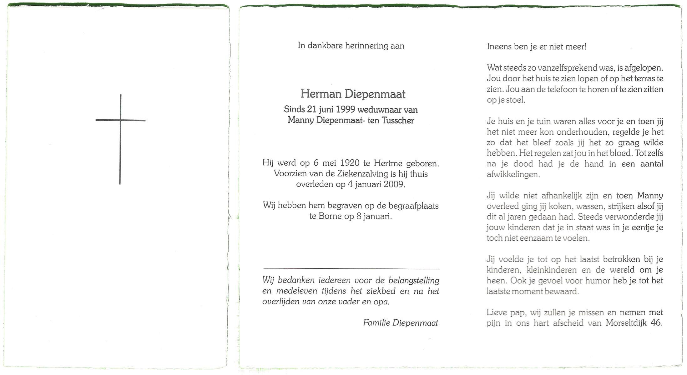 DISSEL, Herman (Herman Johannes), geboren op 7-5-1946 te Denekamp, overleden op 26-1-2009 te Denekamp op 62-jarige leeftijd, begraven op 31-1-2009 te Denekamp.