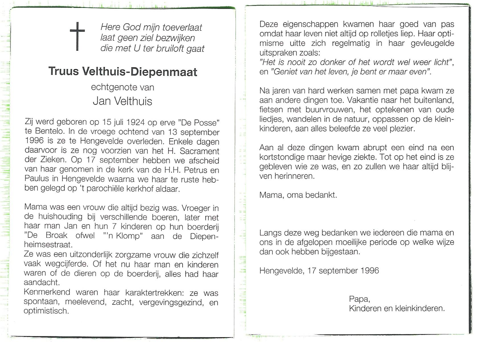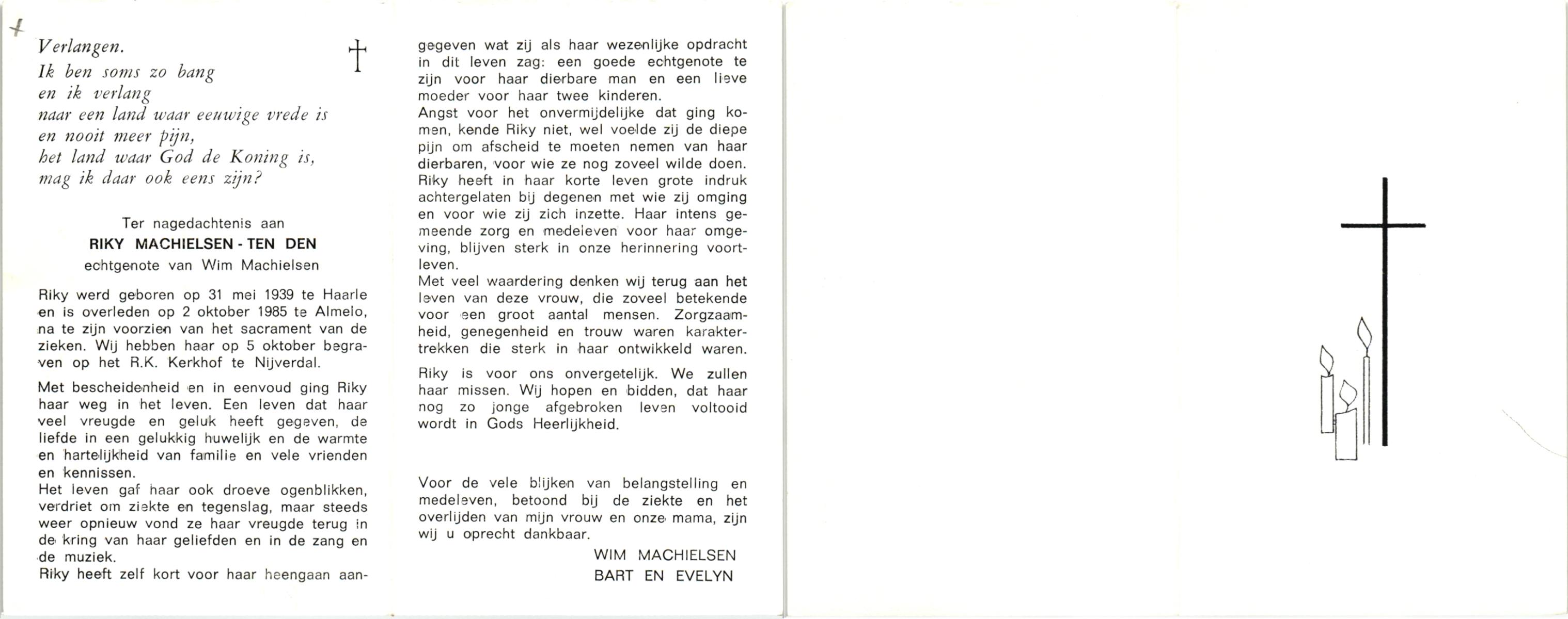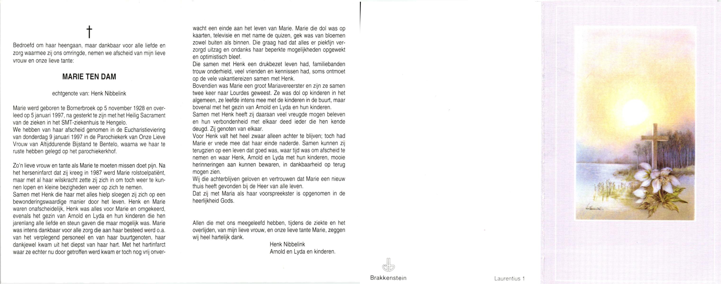 DAM, ten, Marie, geboren op 5-11-1928 te Bornerbroek, overleden op 5-1-1997 te Hengelo (O) op 68-jarige leeftijd, begraven op 9-1-1997 te Bentelo.