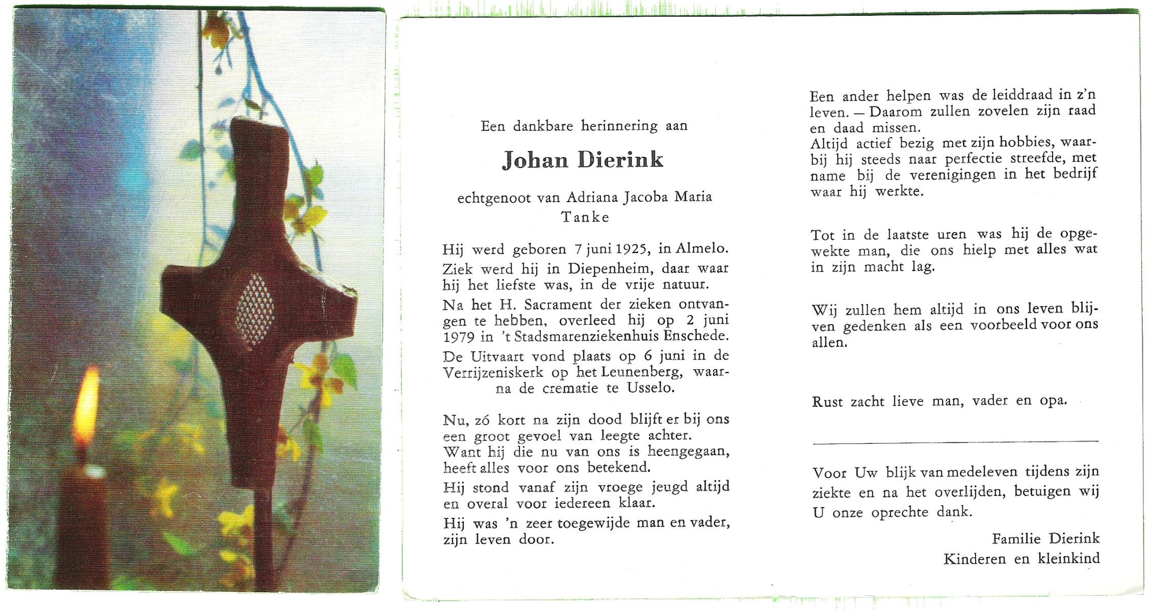 DILLE, Johan, geboren op 31-3-1926 te Enschede, overleden op 24-1-1997 op 70-jarige leeftijd, gecremeerd op 28-1-1997 te Usselo.