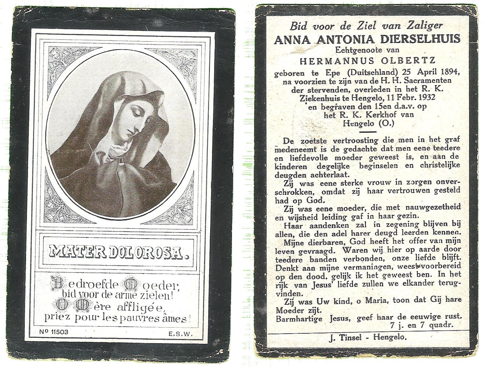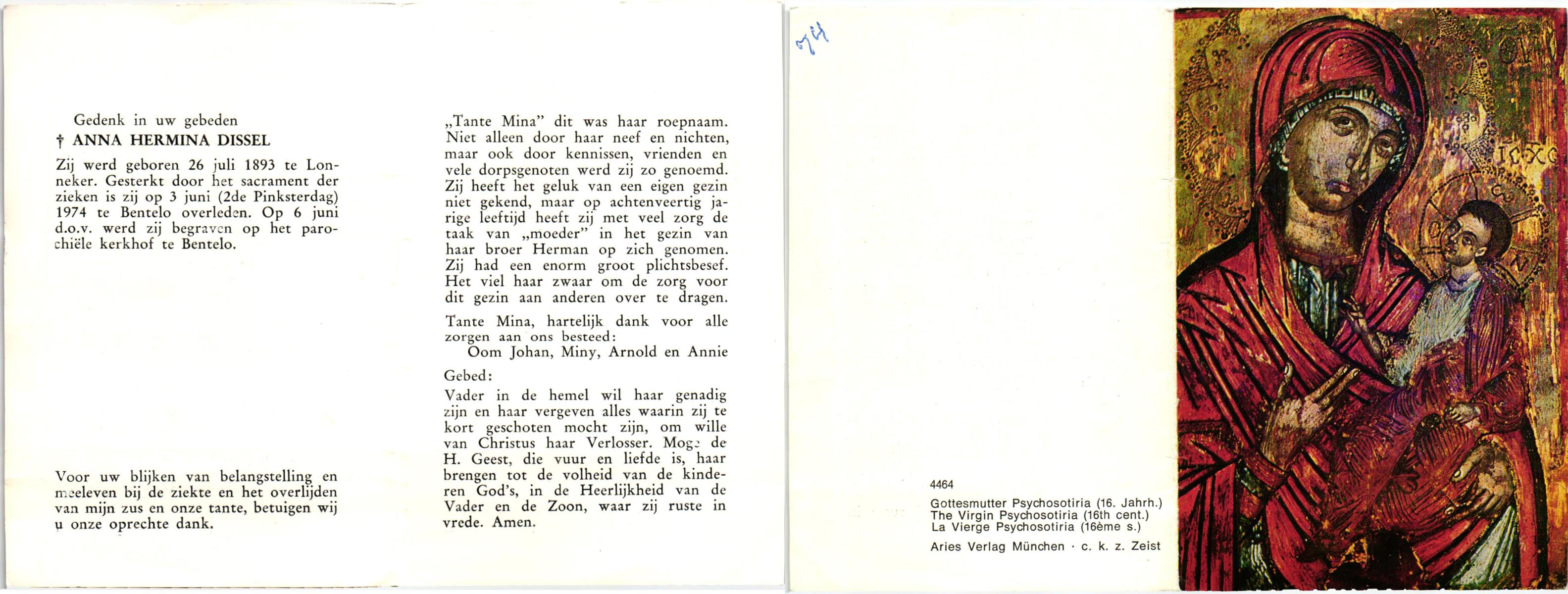DISSEL, Anna Hermina, geboren op 26-07-1893 te Lonneker, overleden op 3-6-1974 te Bentelo op 80-jarige leeftijd, begraven op 6-6-1974 te Bentelo.