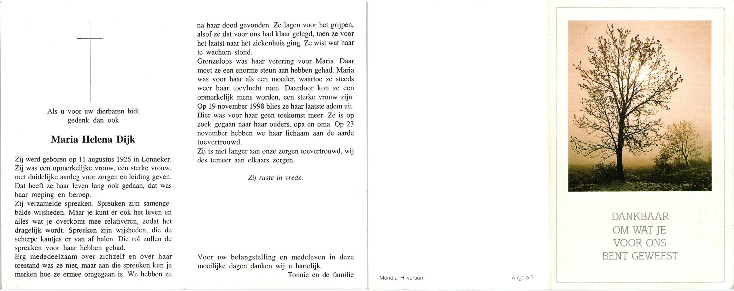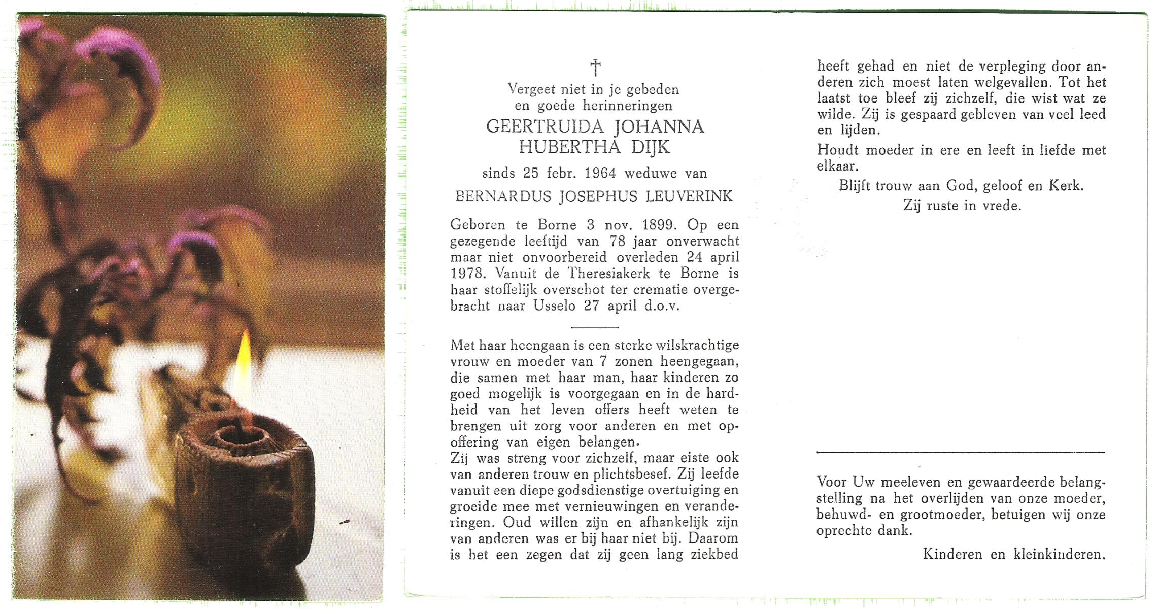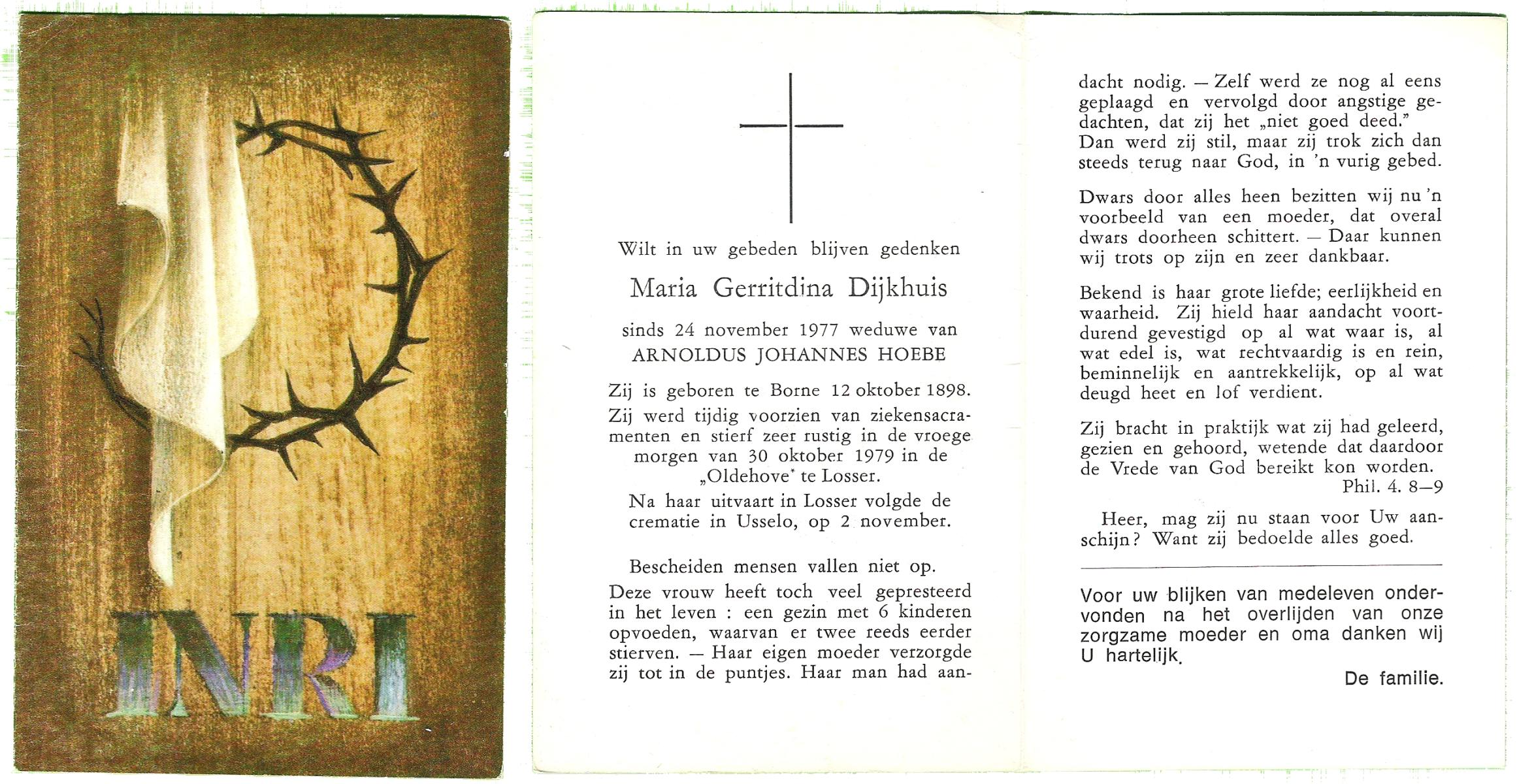 DIJKHUIS, Maria Gerritdina, geboren op 12-10-1898 te Borne, overleden op 30-10-1979 te Losser op 81-jarige leeftijd, gecremeerd op 2-11-1979 te Usselo.