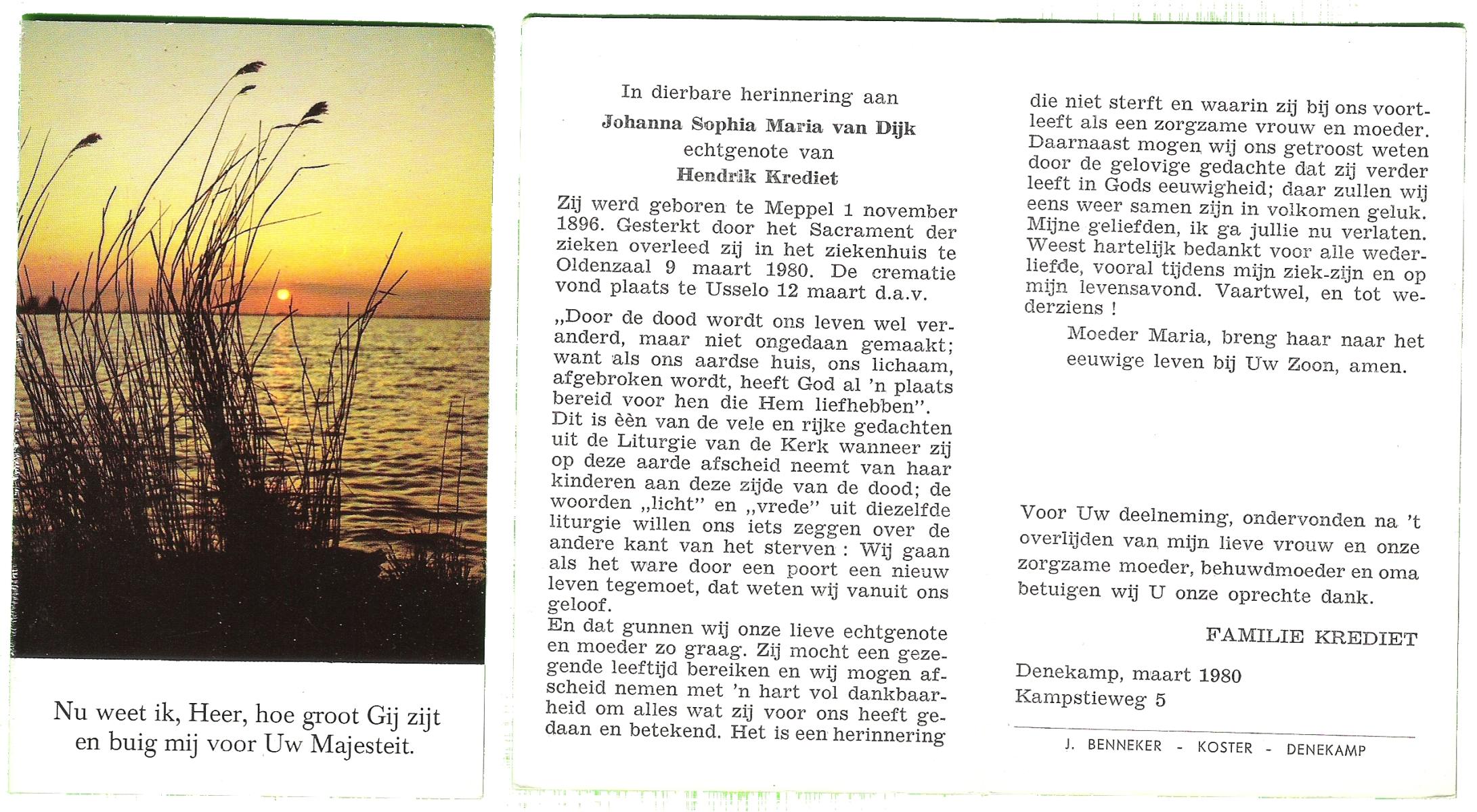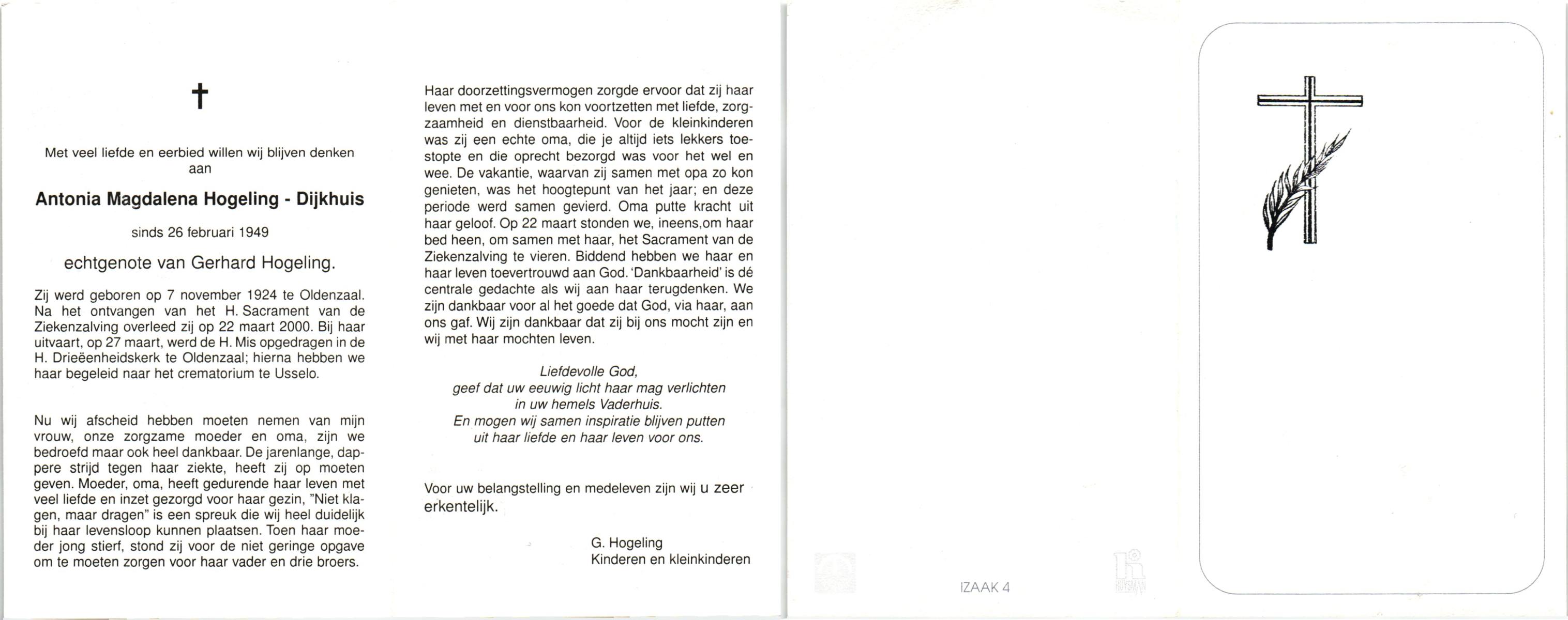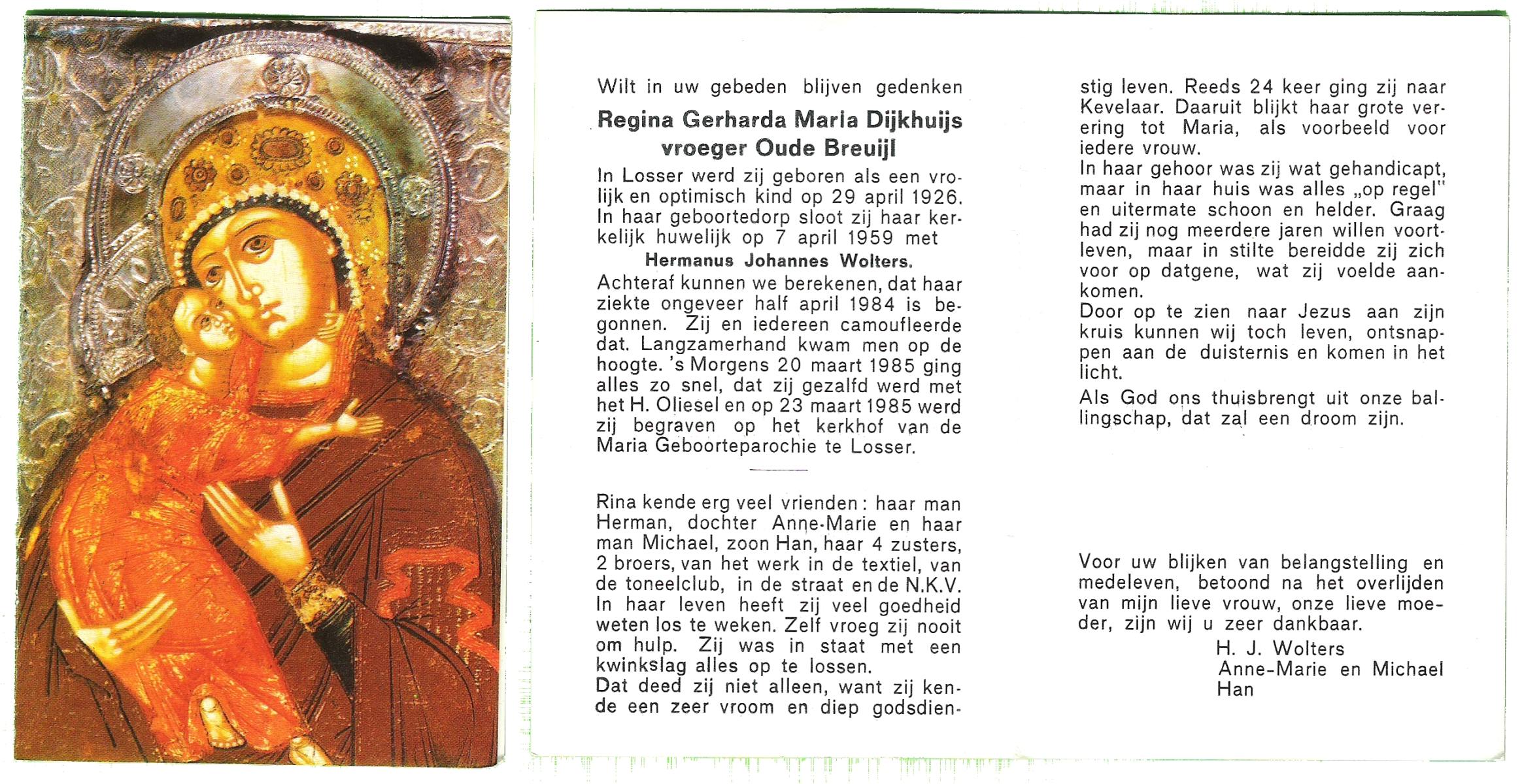 DIJKHUIS, Maria Gerritdina, geboren op 12-10-1898 te Borne, overleden op 30-10-1979 te Losser op 81-jarige leeftijd, gecremeerd op 2-11-1979 te Usselo.