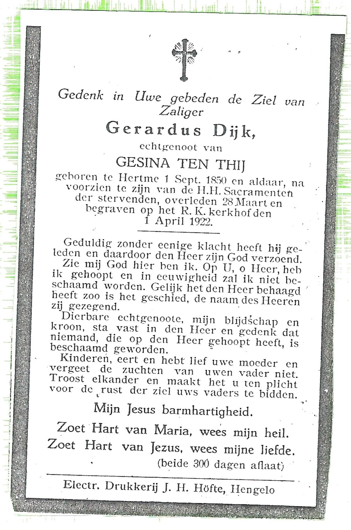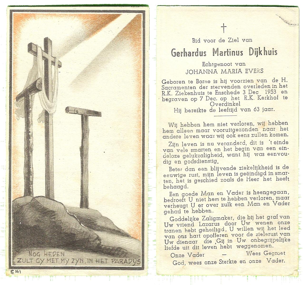 DIJKHUIS, Gerhardus Martinus, geboren op 30-11-1889 te Borne, overleden op 3-12-1953 te Enschede op 63-jarige leeftijd, begraven op 7-12-1953 te Overdinkel.