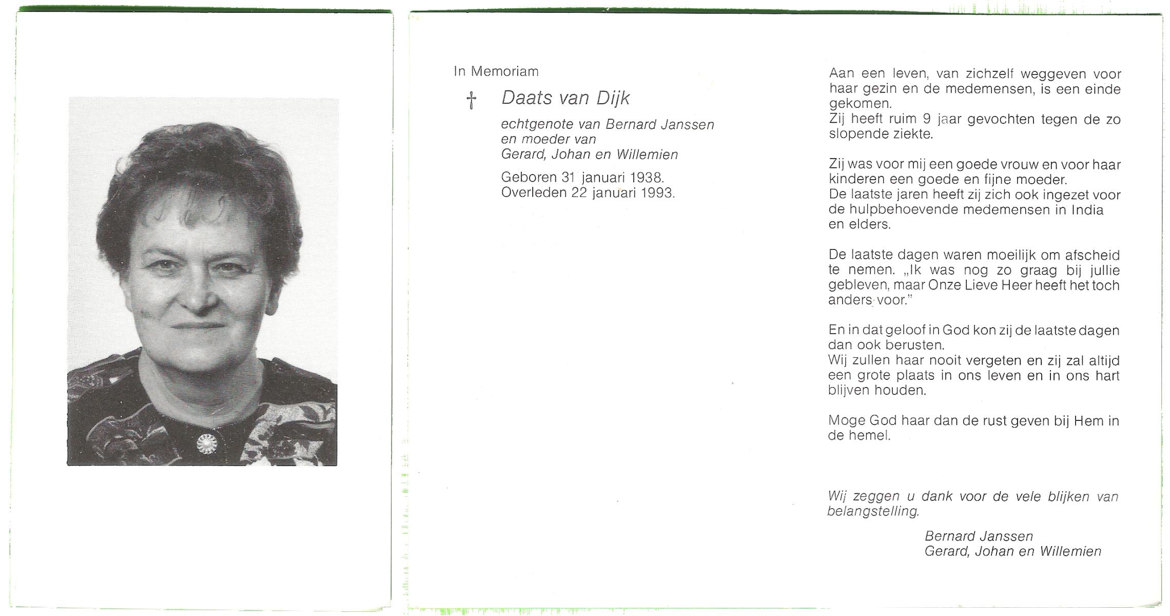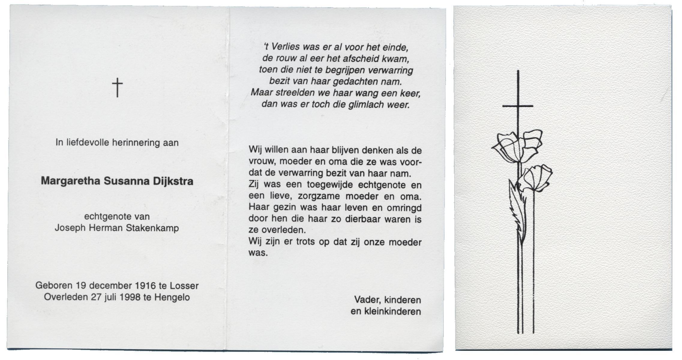 DIJKSTRA, Margaretha Susanna, geboren op 19-12-1916 te Losser, overleden op 27-7-1998 te Hengelo (Ov.) op 81-jarige leeftijd.