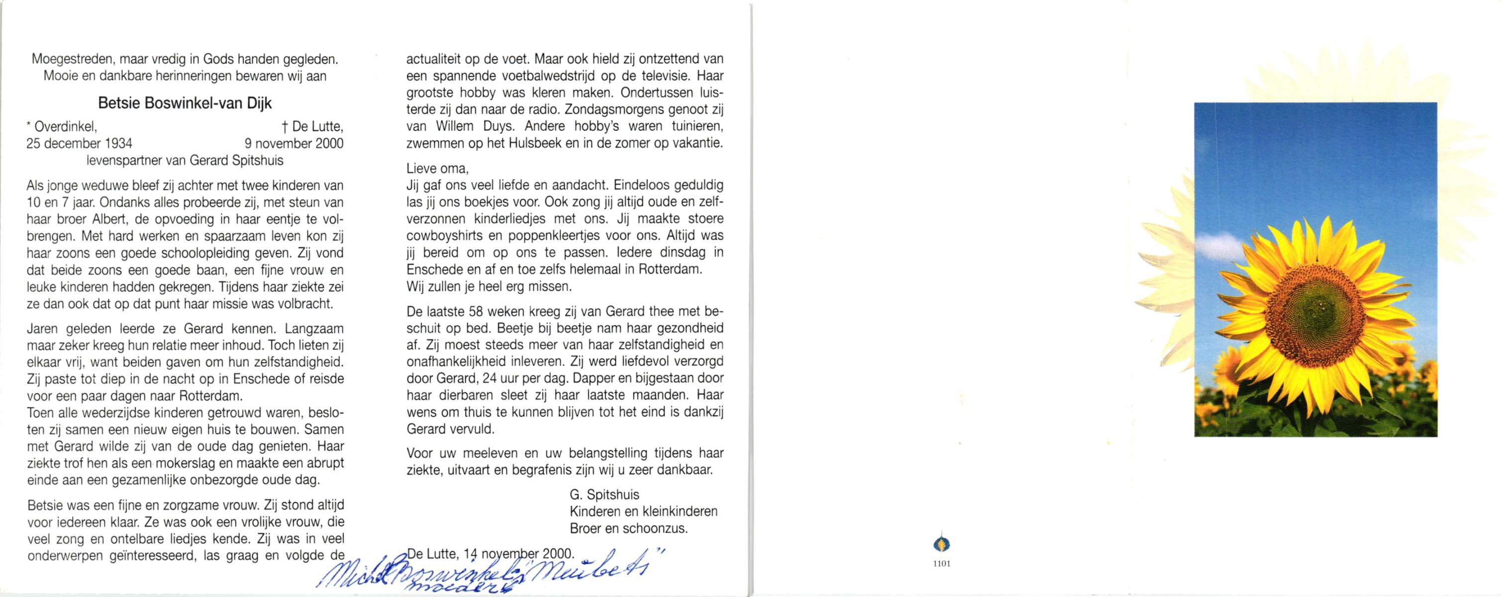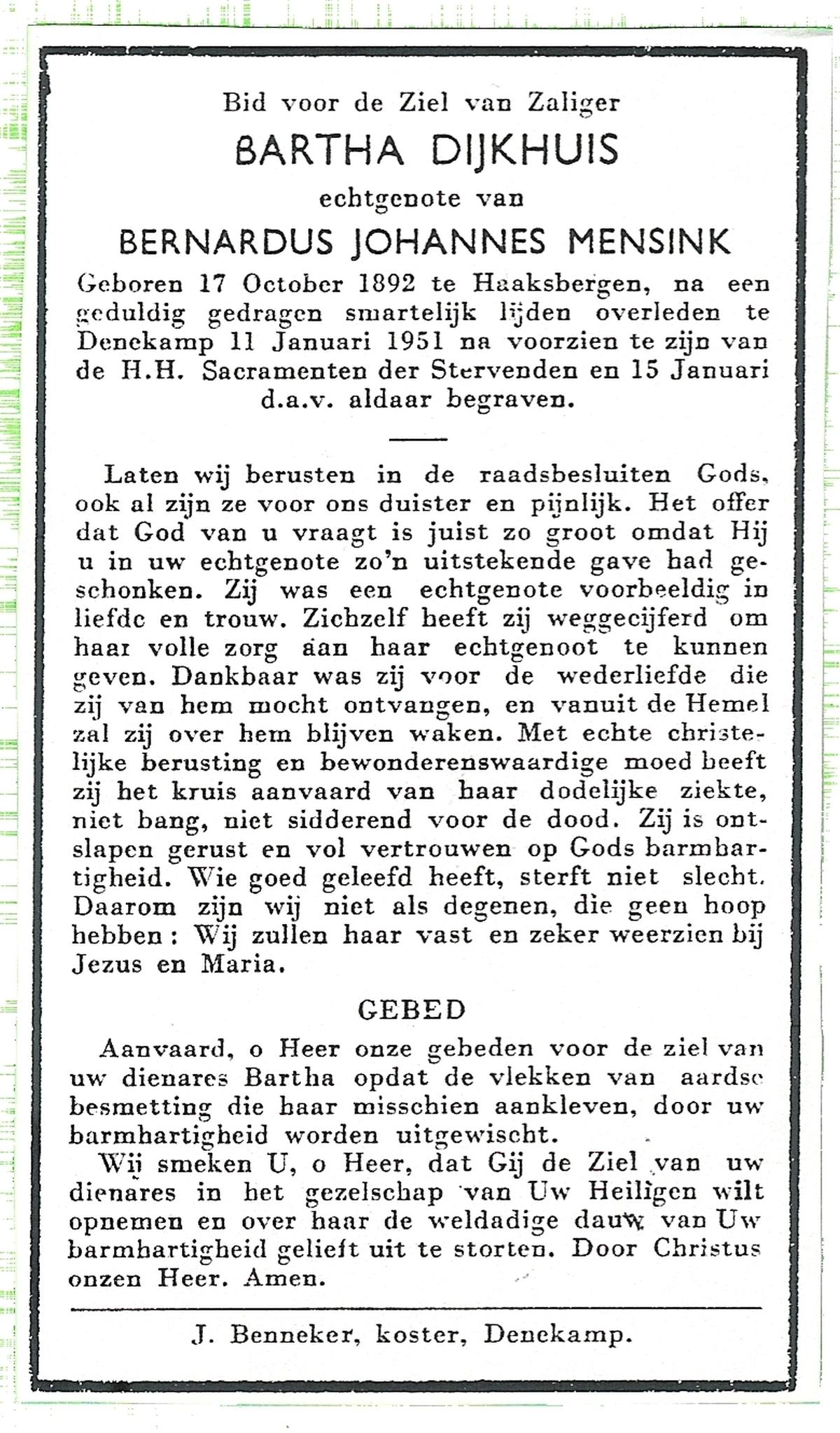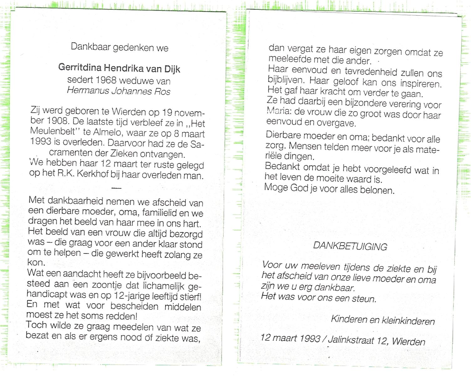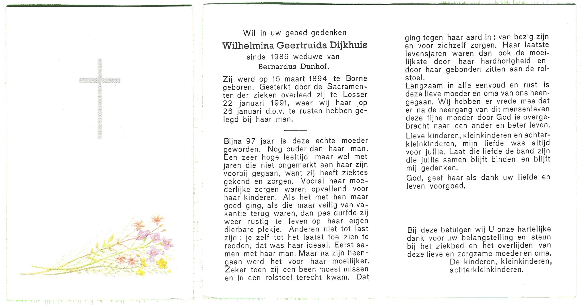 DIJKHUIS, Wilhelmina Geertruida, geboren op 15-03-1894 te Borne, overleden op 22-1-1991 te Losser op 96-jarige leeftijd, begraven op 26-1-1991 te Losser.