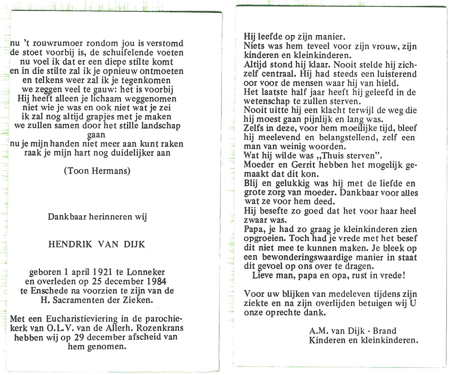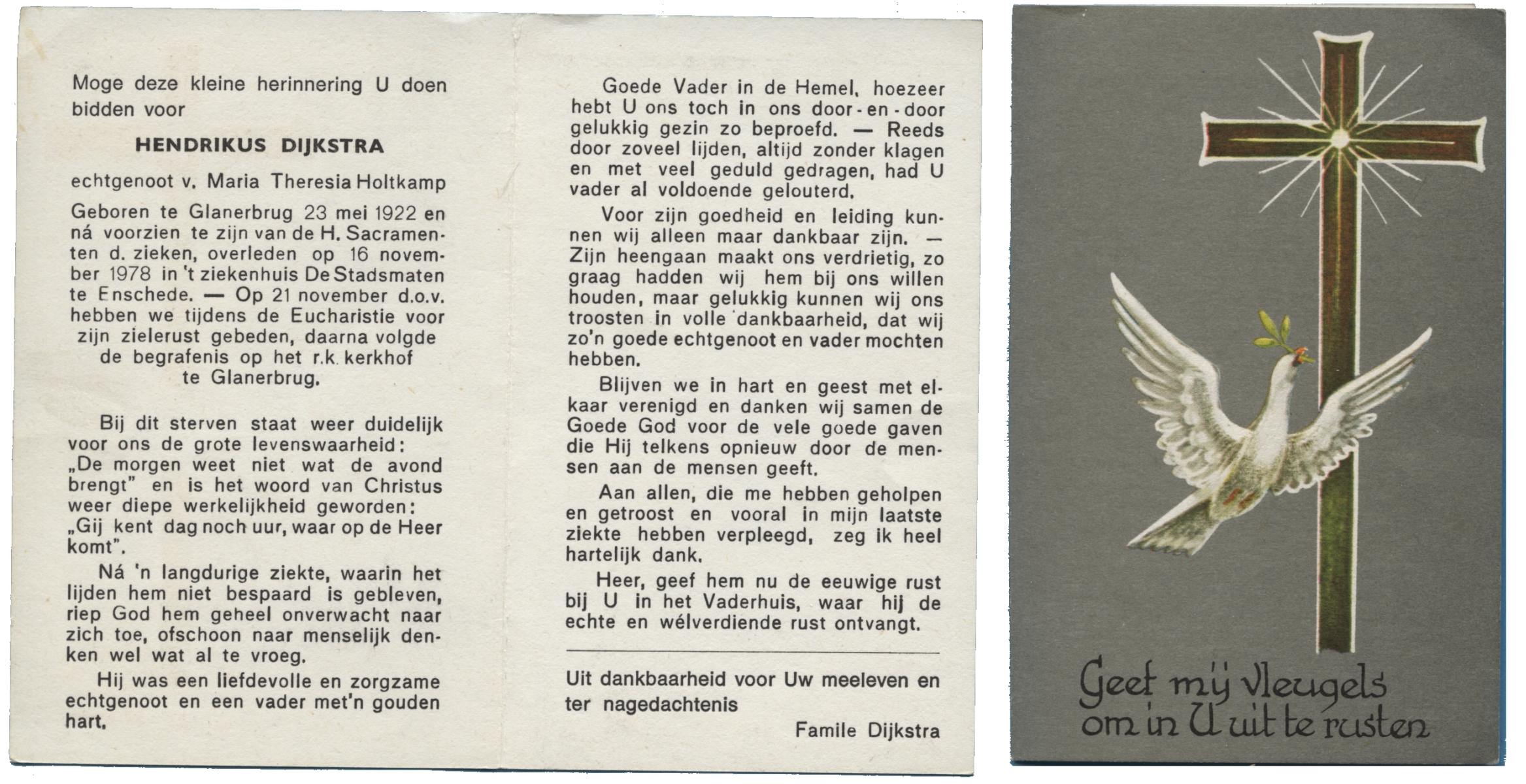 DIJKSTRA, Hendrikus, geboren op 23-5-1922 te Glanerbrug, overleden op 16-11-1978 te Enschede op 56-jarige leeftijd, begraven op 21-11-1978 te Glanerbrug.