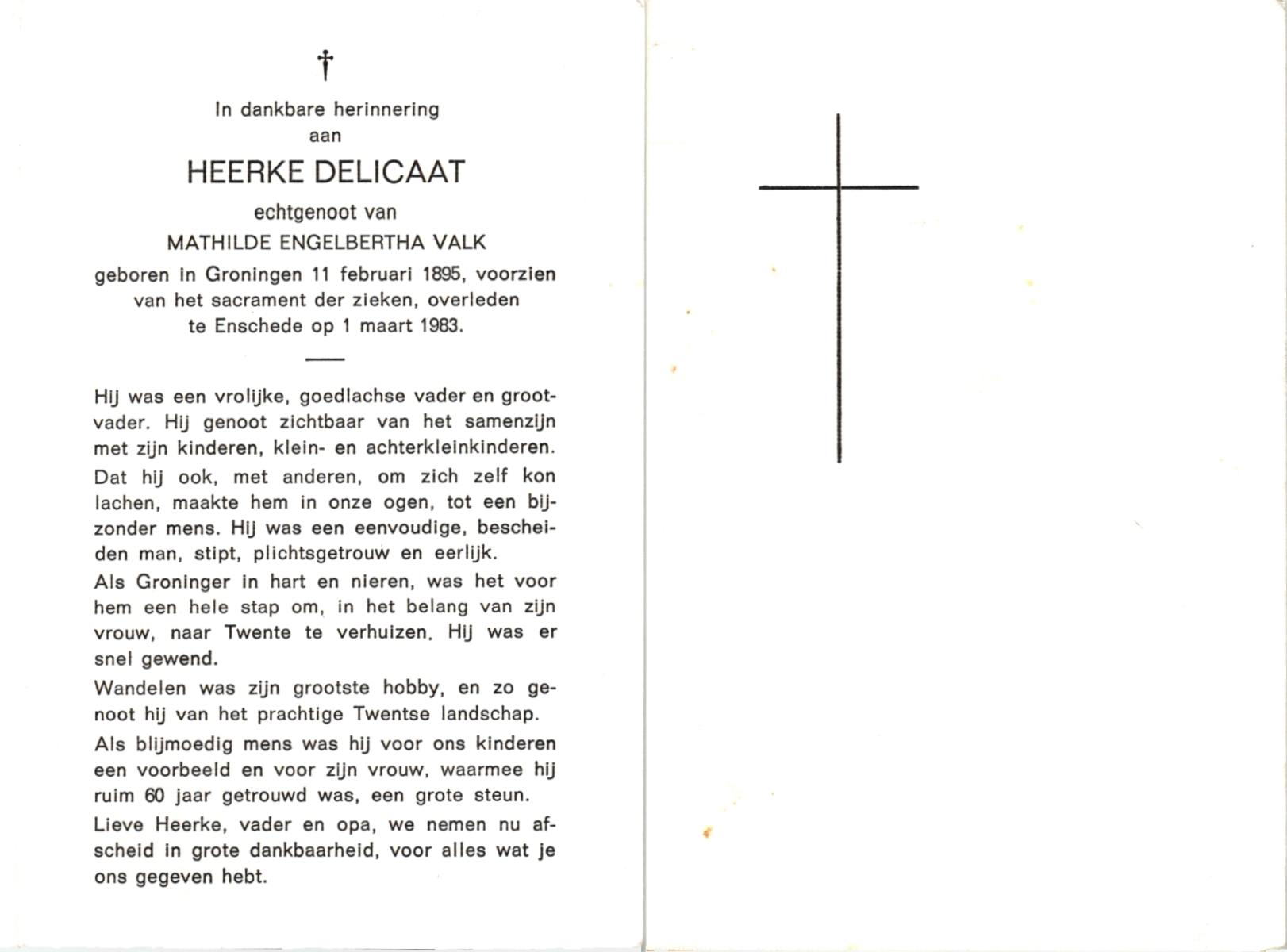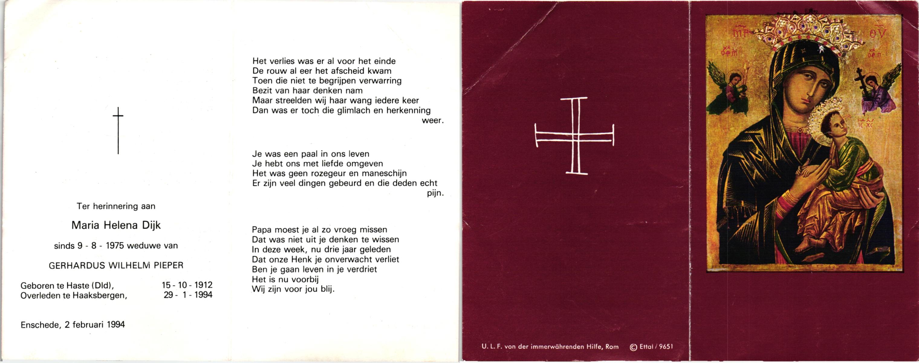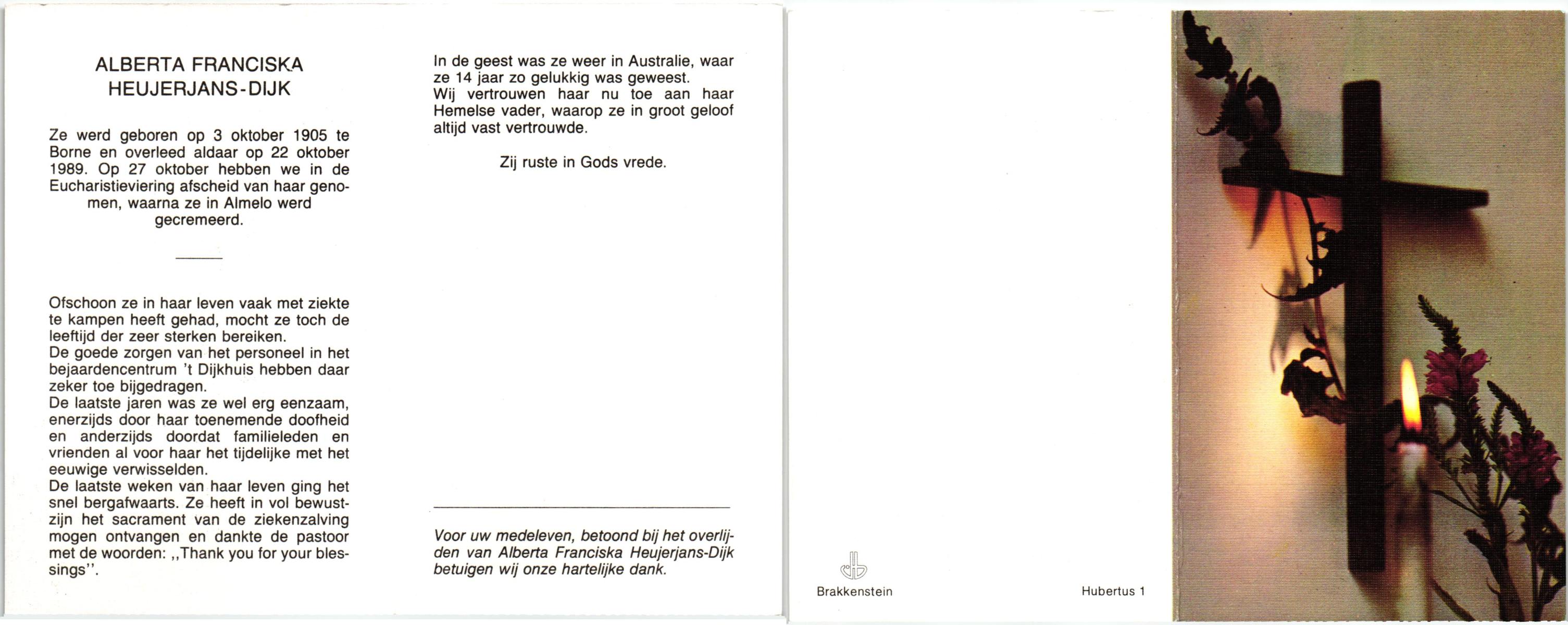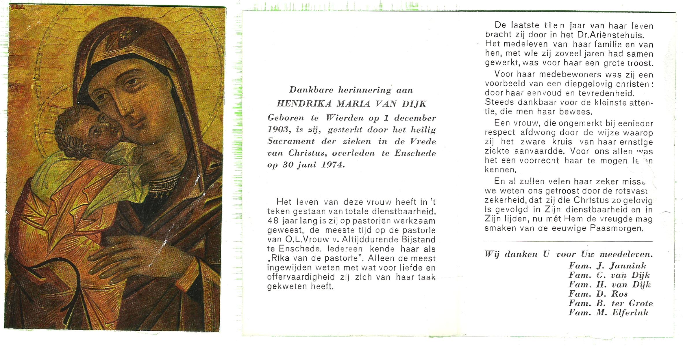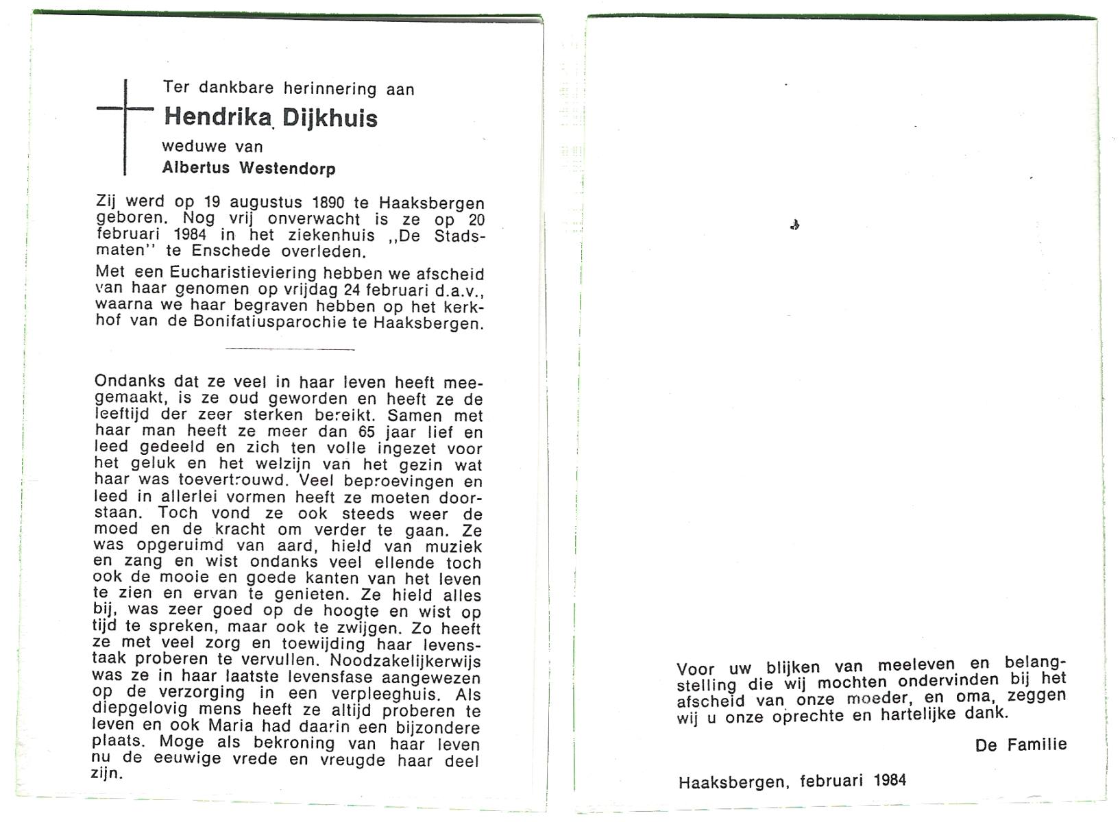 DIJKHUIS, Hendrika, geboren op 19-08-1890 te Haaksbergen, overleden op 20-2-1984 te Enschede op 93-jarige leeftijd, begraven op 24-2-1984 te Haaksbergen, Bonifatius en Gezelleparochie.