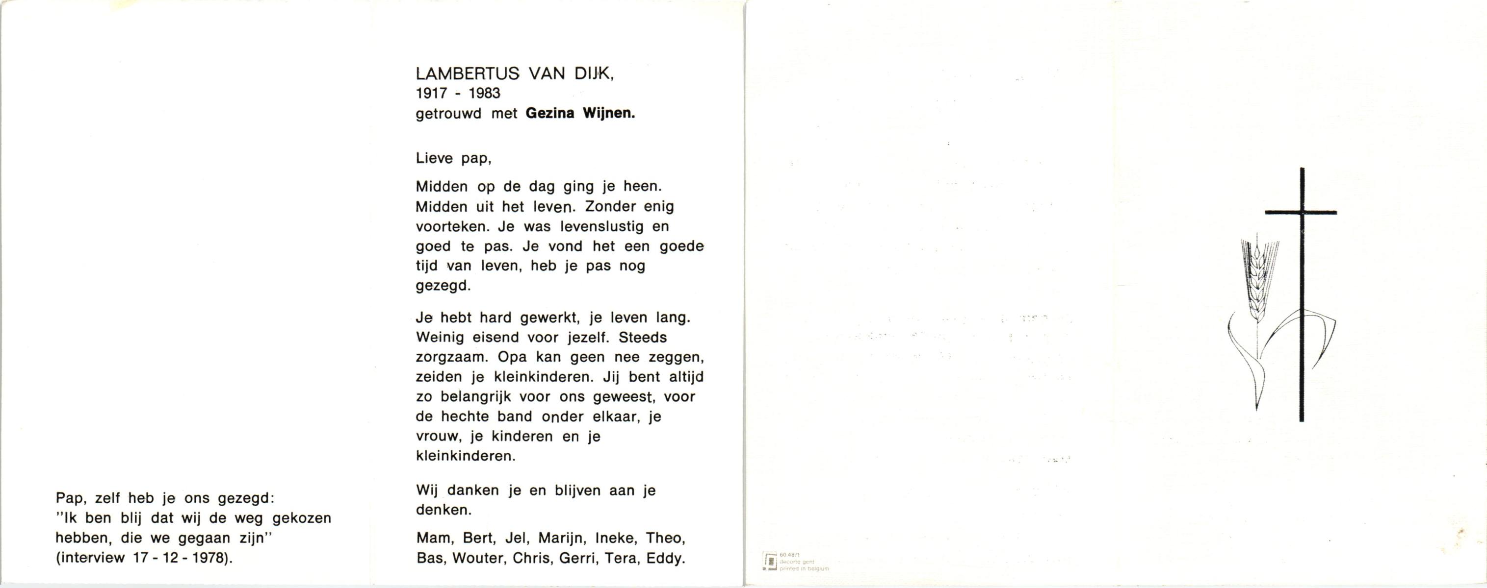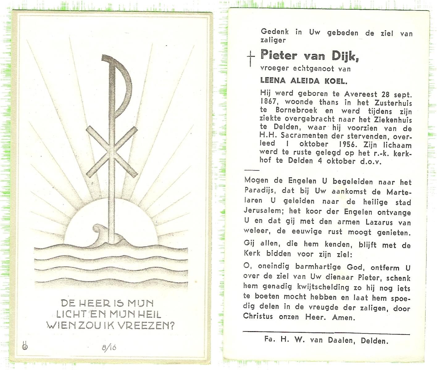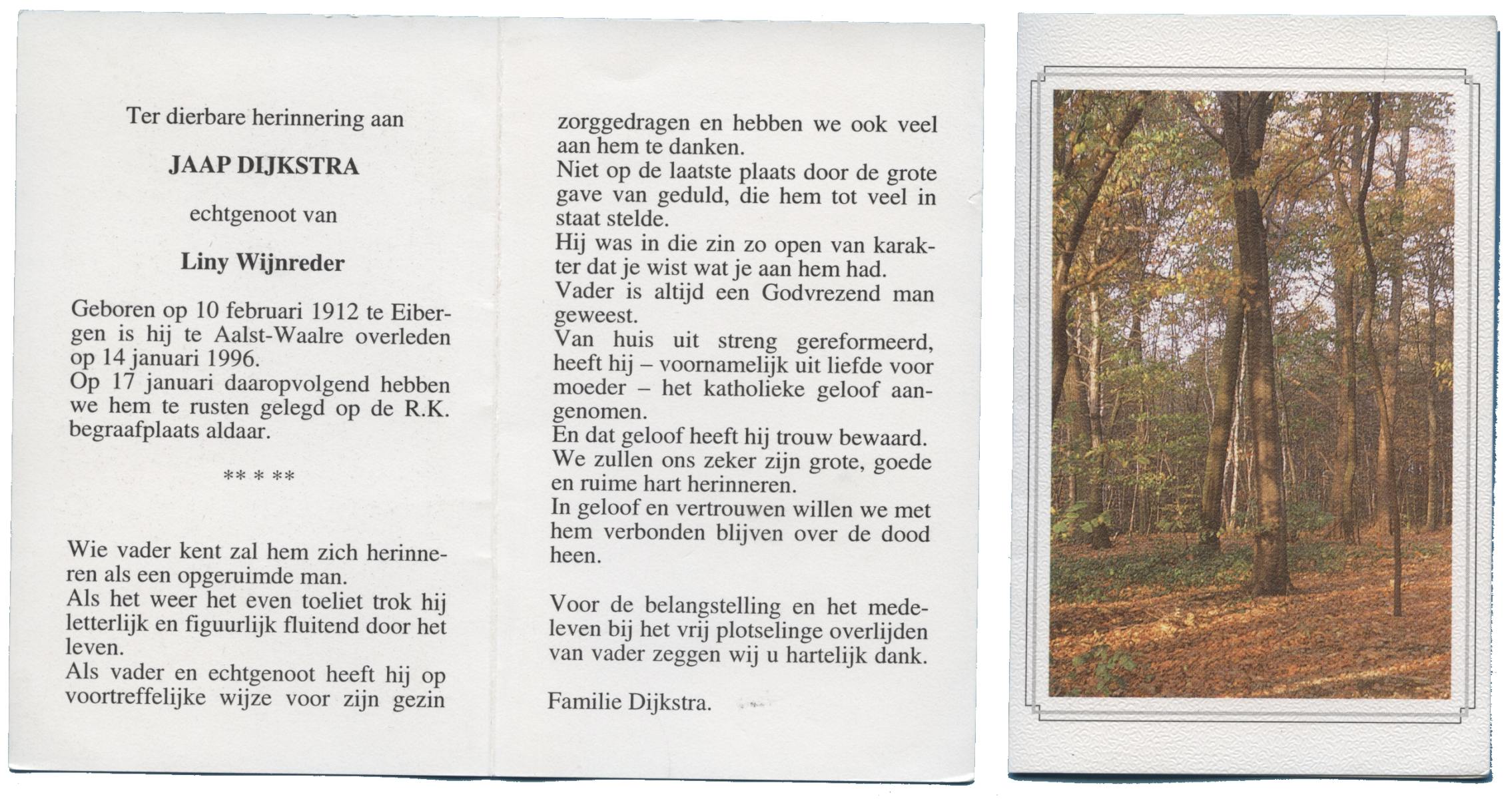 DIJKSTRA, Jaap, geboren op 10-2-1912 te Eibergen, overleden op 14-1-1996 te Aalst-Waalre op 83-jarige leeftijd, begraven op 17-1-1996 te Aalst-Waalre.