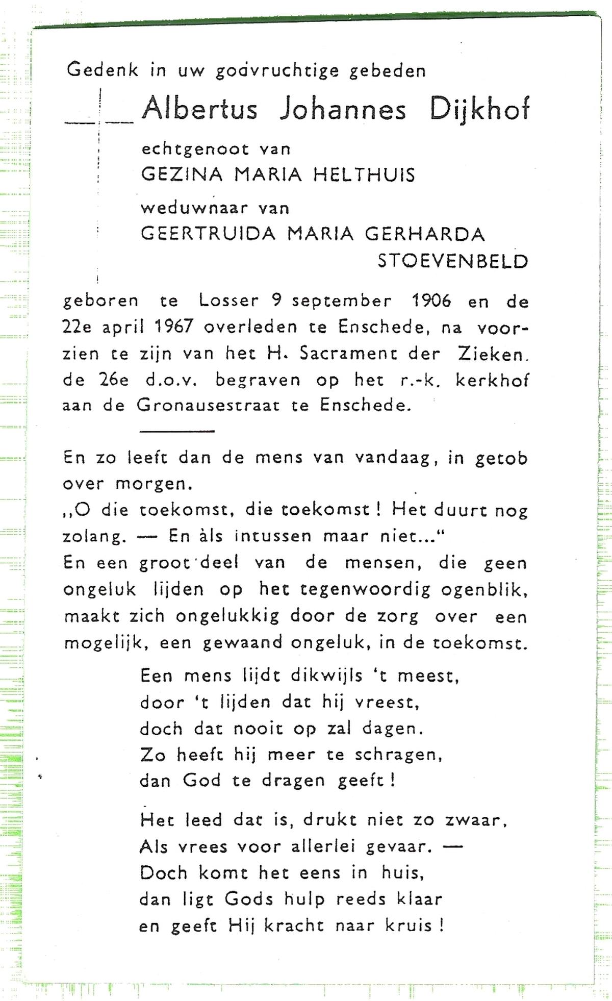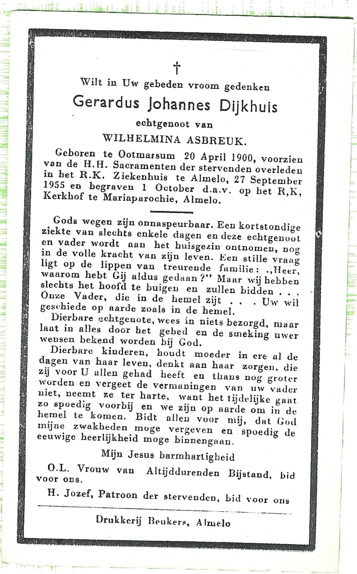 DIJKHUIS, Gerardus Johannes, geboren op 20-4-1900 te Ootmarsum, overleden op 27-9-1955 te Almelo op 55-jarige leeftijd, begraven op 1-10-1955 te Mariaparochie.