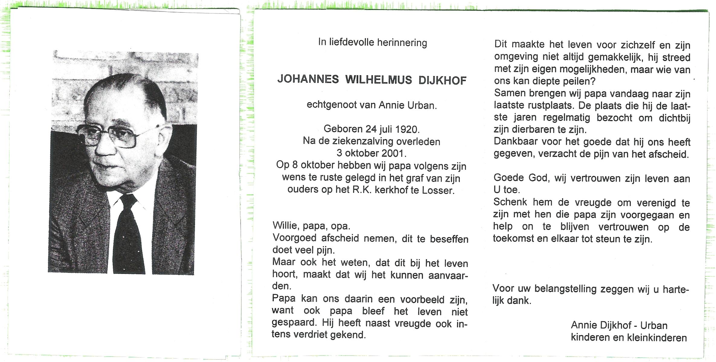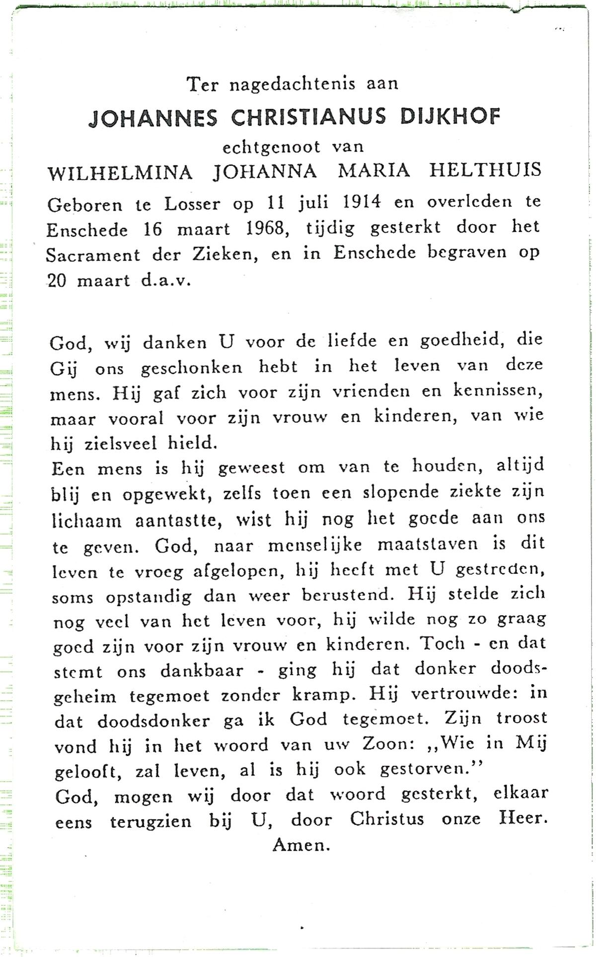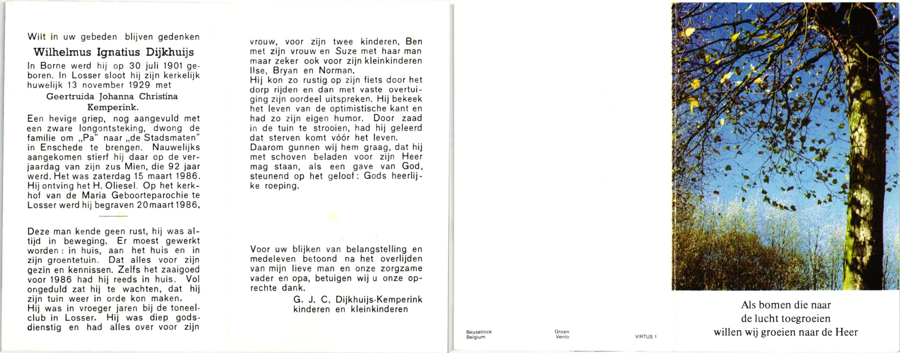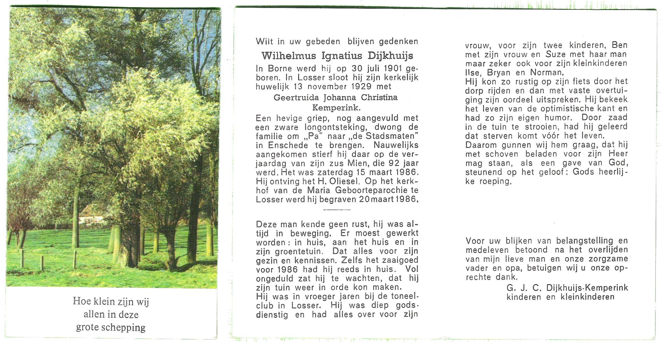DIJKHUIS, , Wilhelmus Ignatius, geboren op 30-7-1901 te Borne, overleden op 15-3-1986 op 84-jarige leeftijd, begraven op 20-3-1986 te Losser.